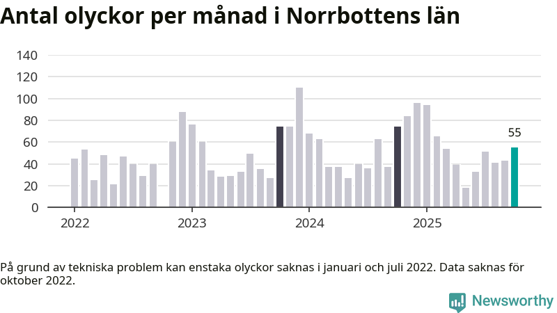 De senaste årens mest olycksdrabbade månad var december för två år sedan, med 110 olyckor. I genomsnitt rapporteras omkring 52 olyckor per månad i länet, sedan början av 2022.