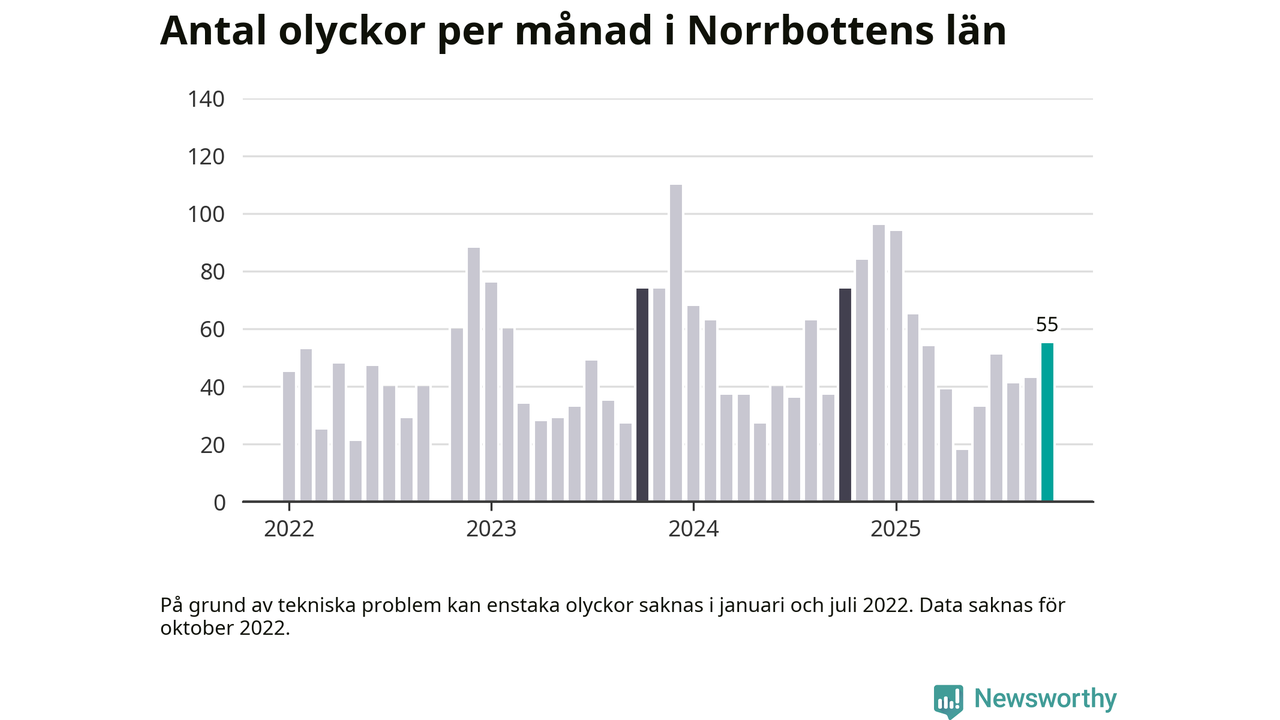 I Norrbottens län var trafikolyckorna längs de stora vägarna färre i oktober än under samma månad i fjol, visar data från Trafikverket som Newsworthy sammanställt.