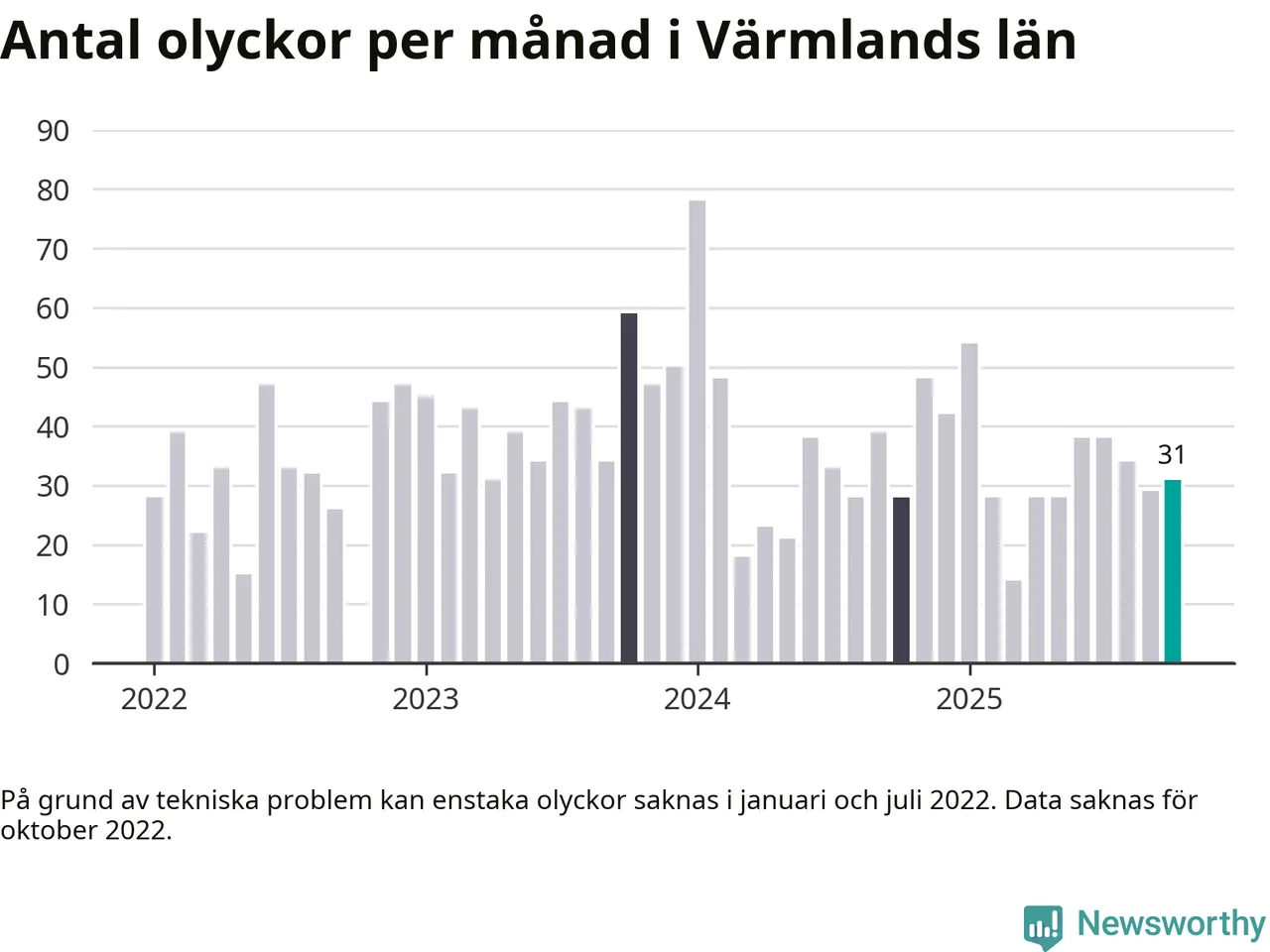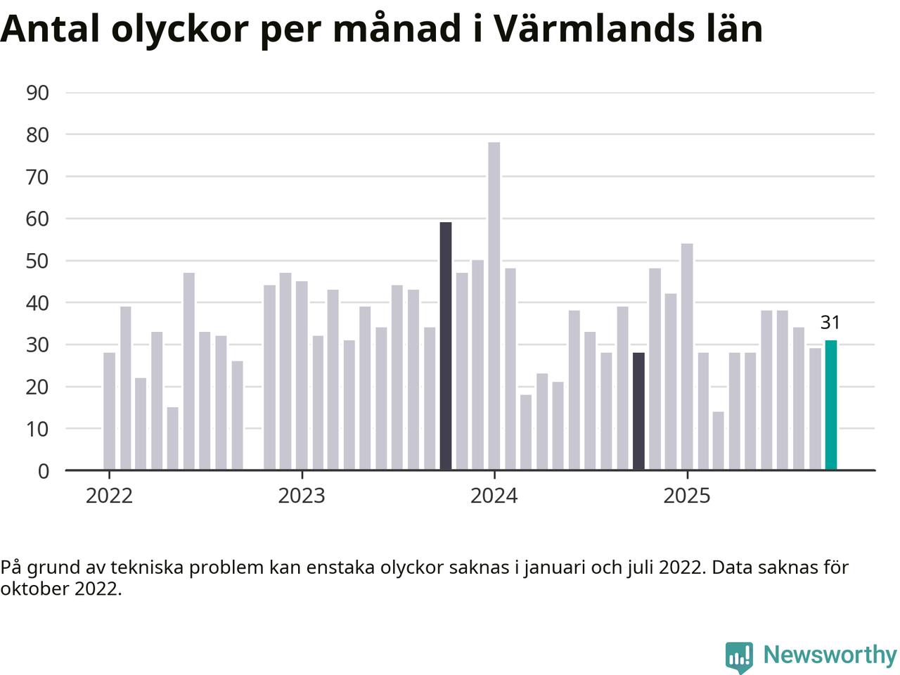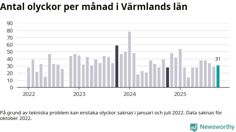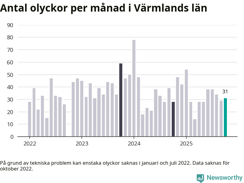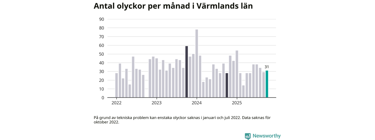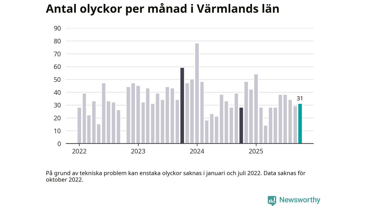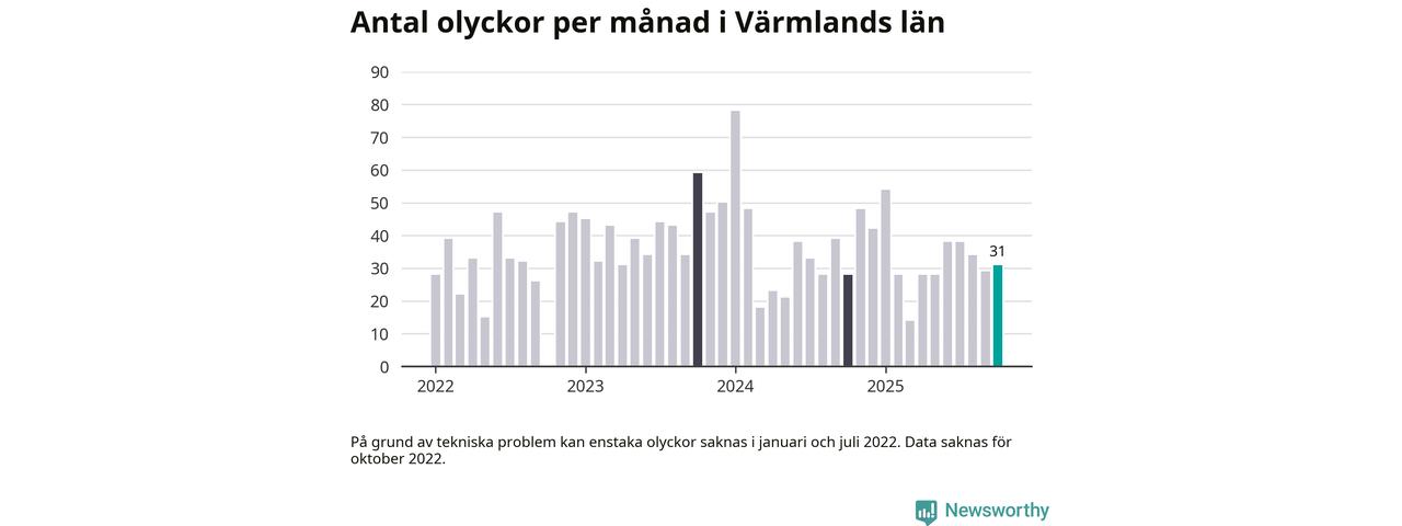 I Värmlands län rapporterades 31 längs de stora vägarna i länet under oktober, visar data från Trafikverket som Newsworthy sammanställt.