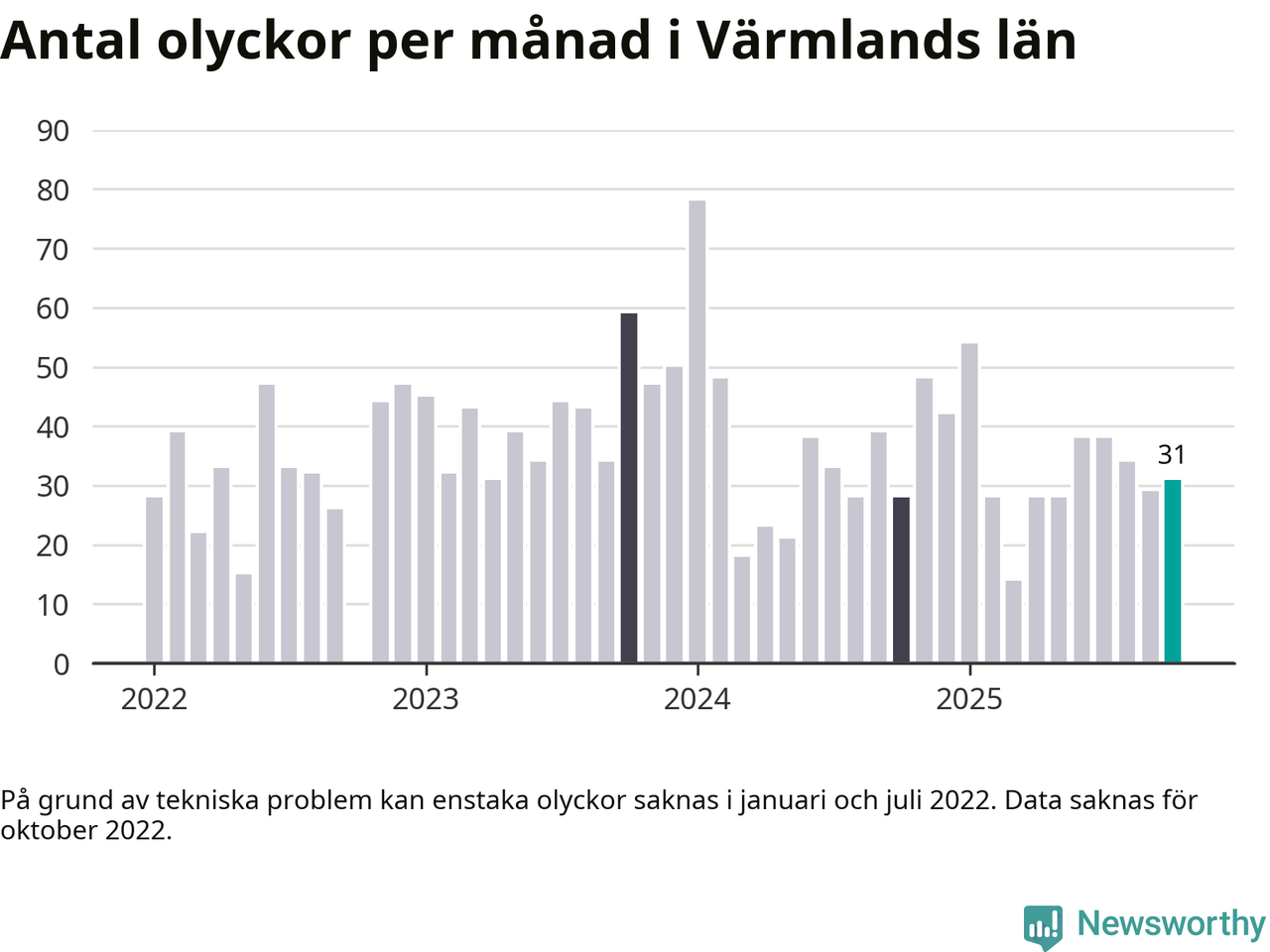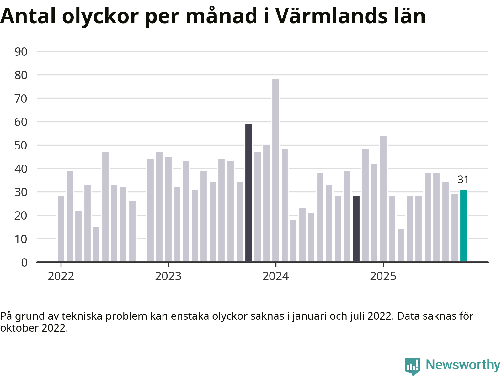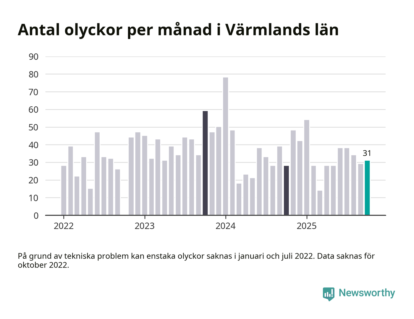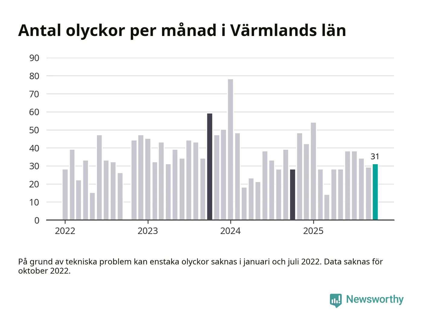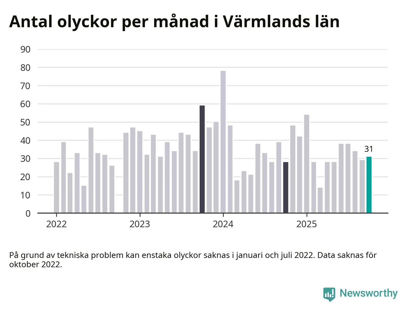 I Värmlands län rapporterades 31 längs de stora vägarna i länet under oktober, visar data från Trafikverket som Newsworthy sammanställt.