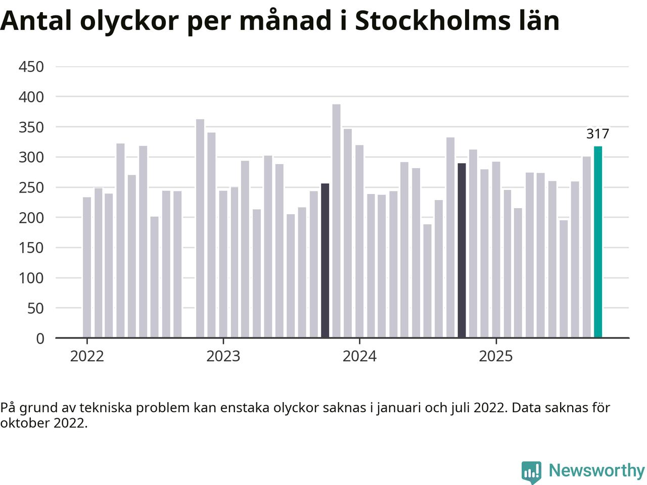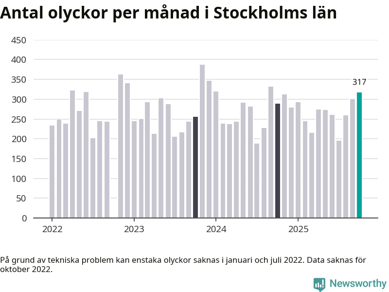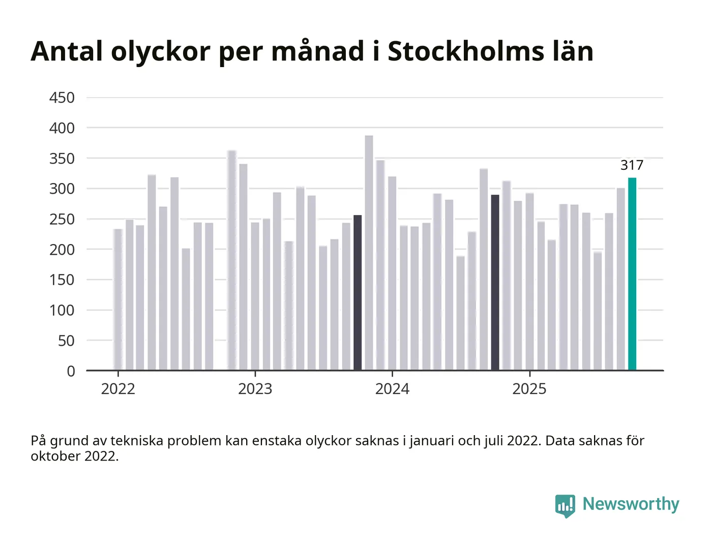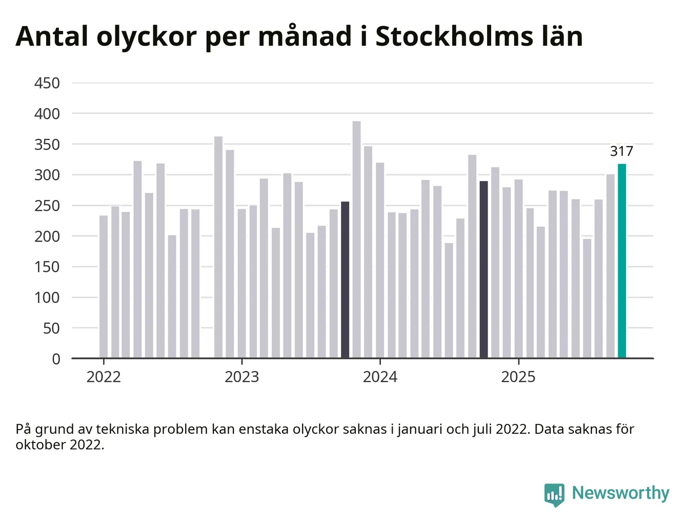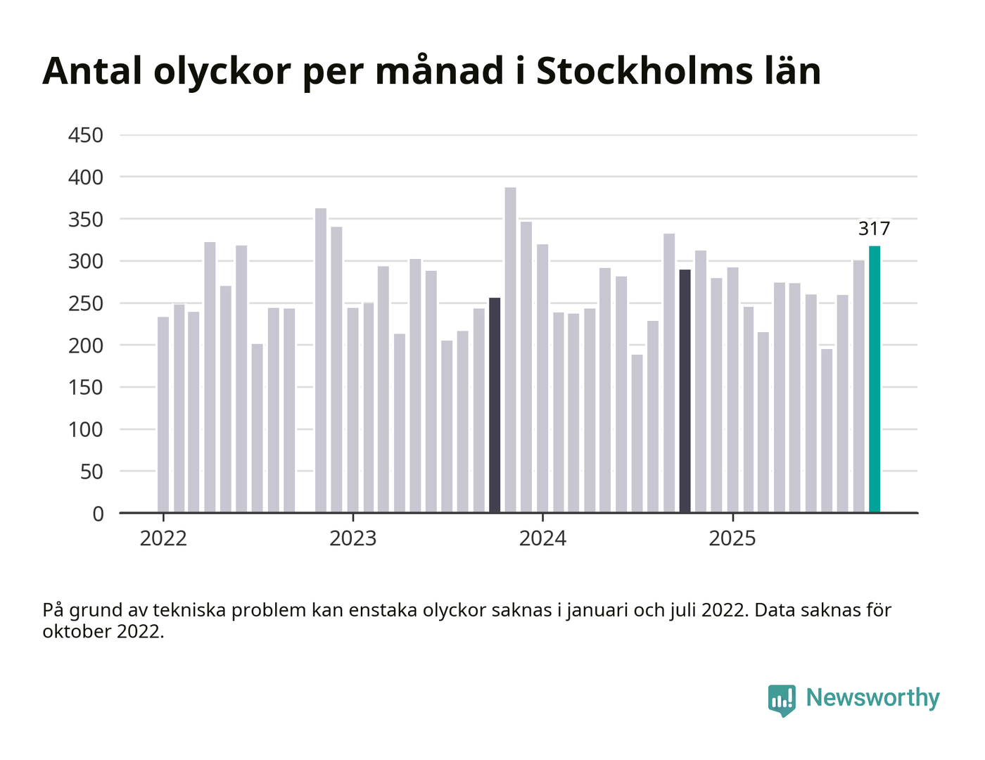 I Stockholms län var trafikolyckorna fler än vanligt i oktober: 317 olyckor längs de stora vägarna i länet. Det visar data från Trafikverket som Newsworthy sammanställt.