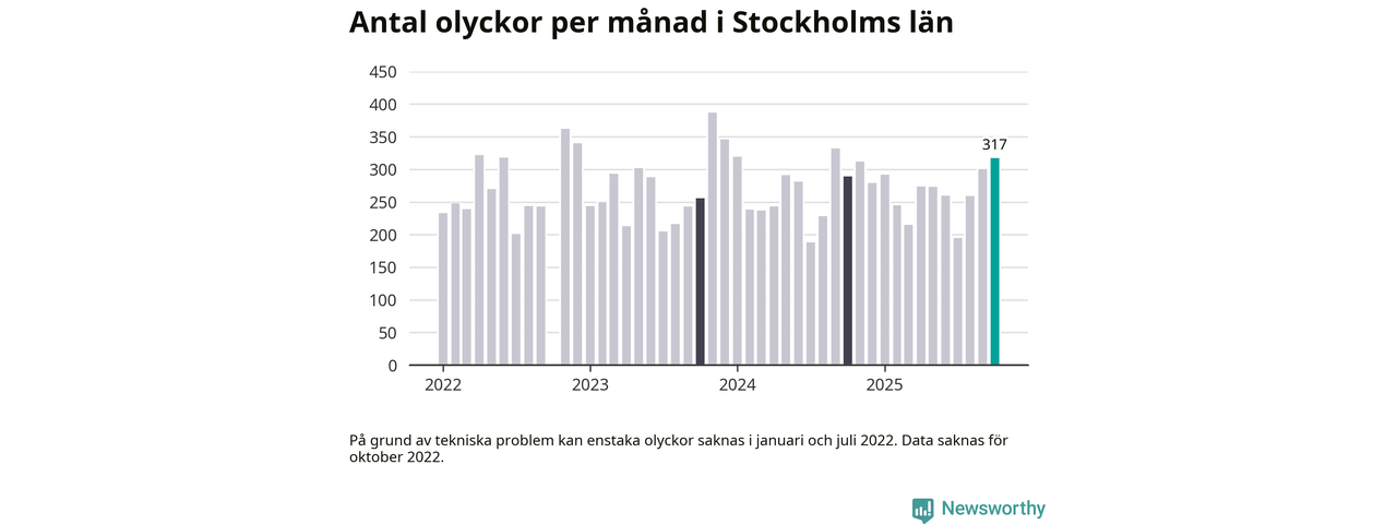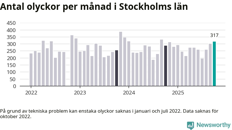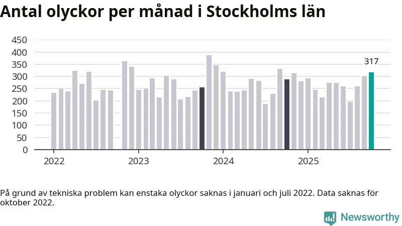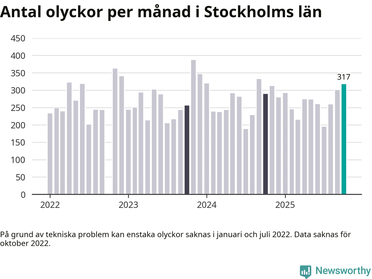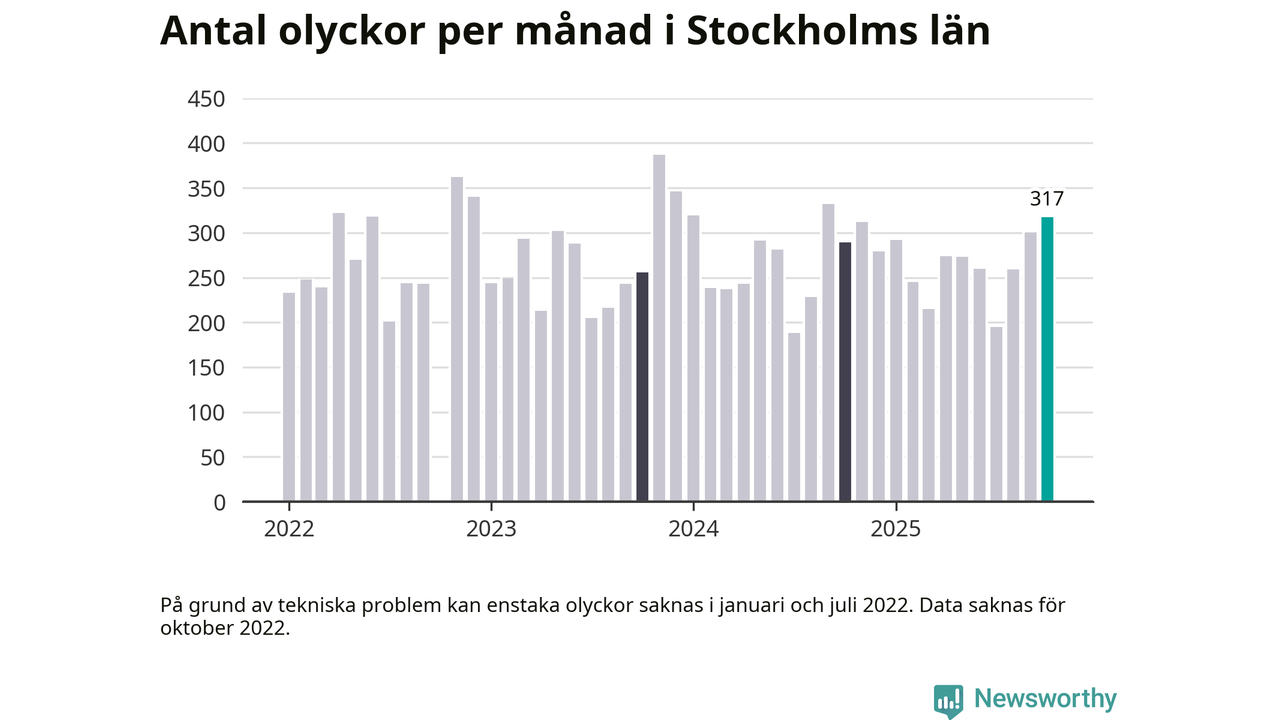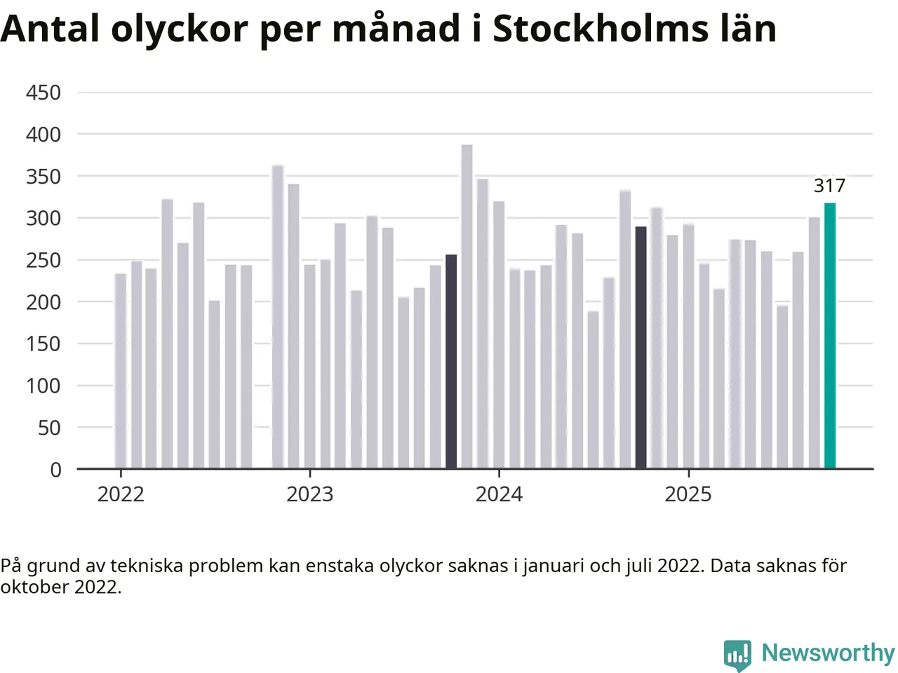 I Stockholms län var trafikolyckorna fler än vanligt i oktober: 317 olyckor längs de stora vägarna i länet. Det visar data från Trafikverket som Newsworthy sammanställt.
