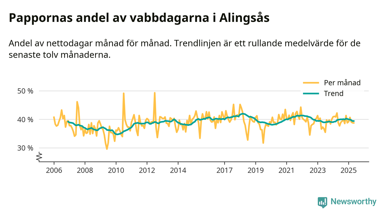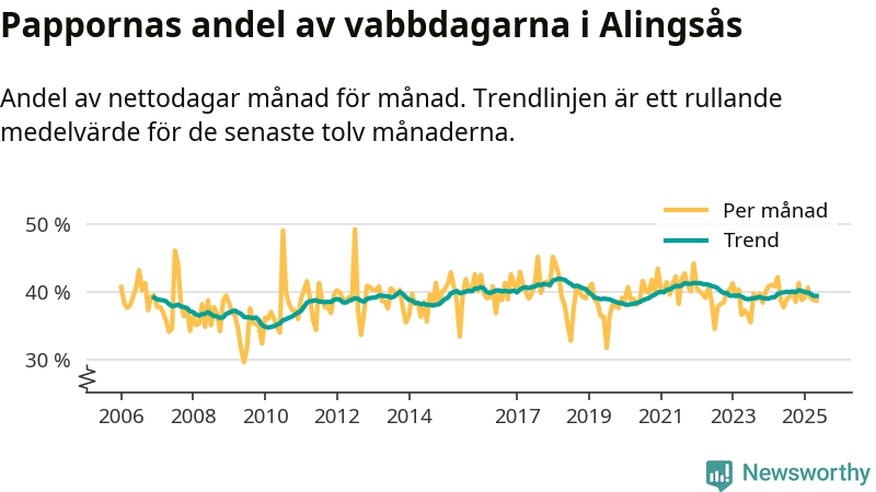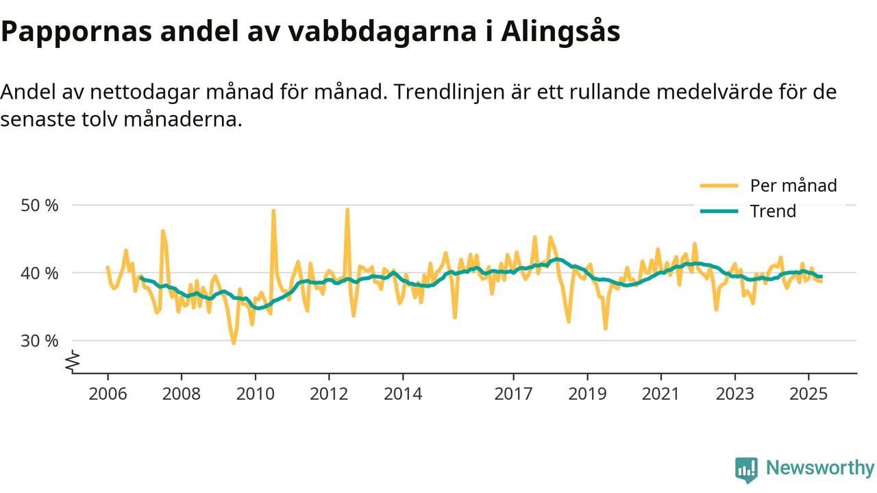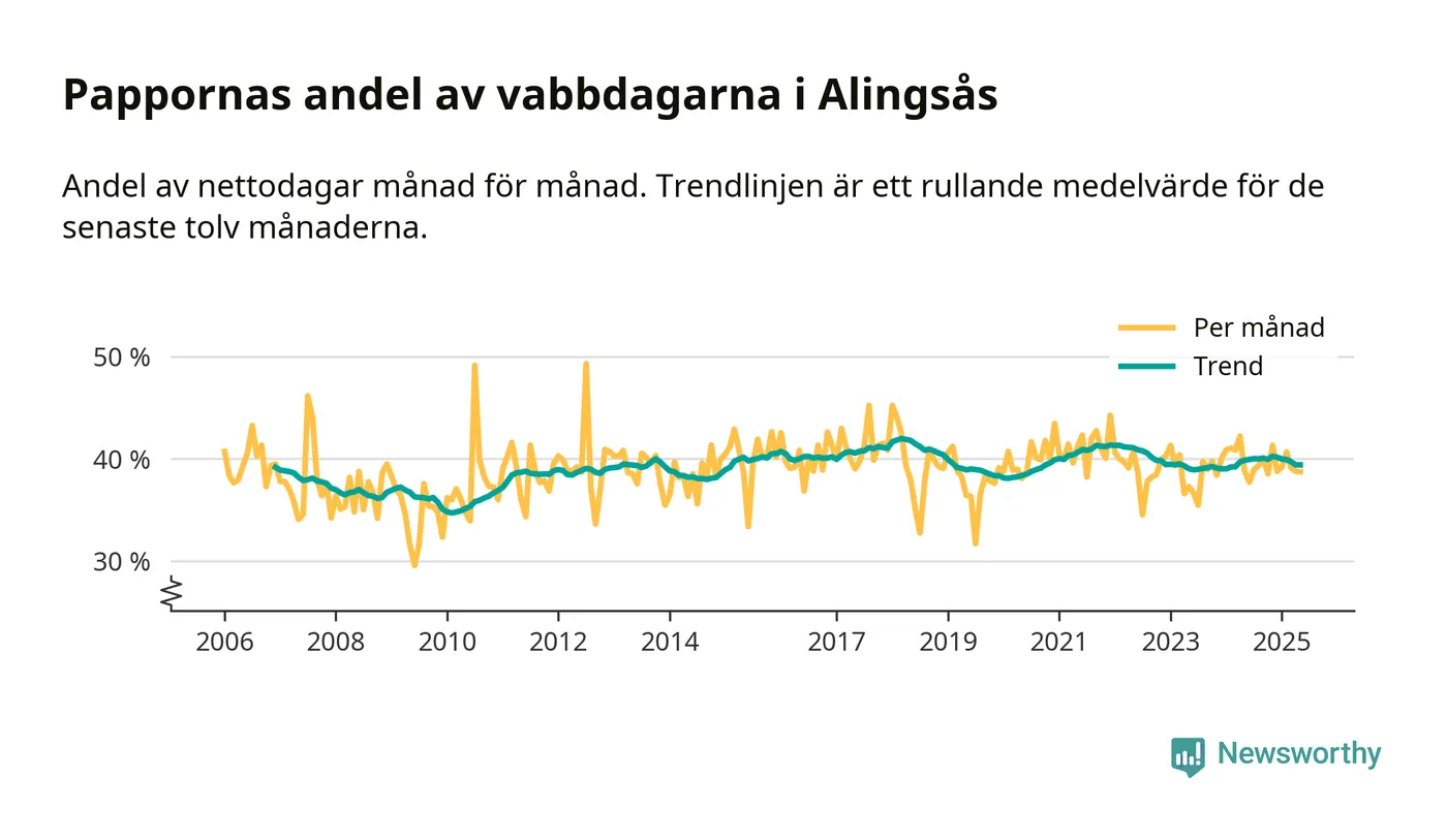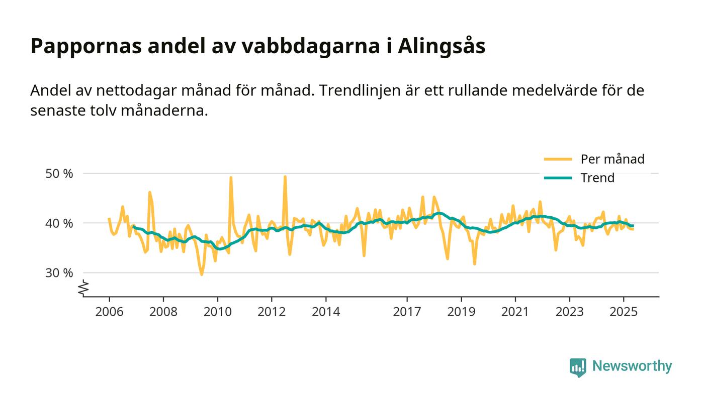 Alingsås ligger en bit från ett jämställt uttag. Under de senaste tolv månaderna har männen stått för 39 procent av all vabb i kommunen. Pappornas uttag peakade våren 2018 då kommunens fäder var uppe i 42 procent av vabbdagarna 1.