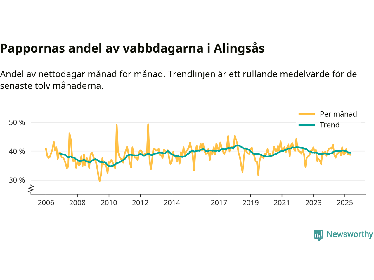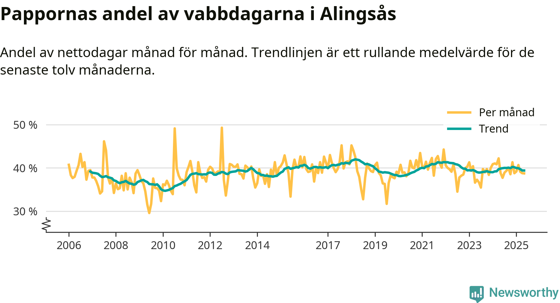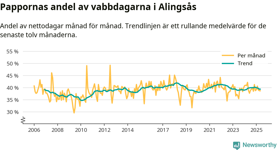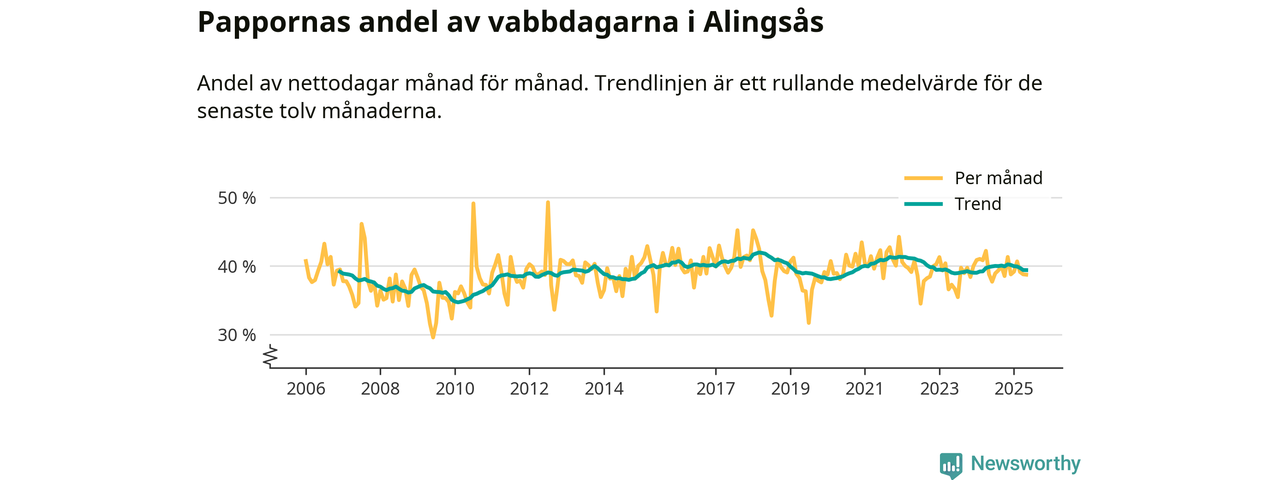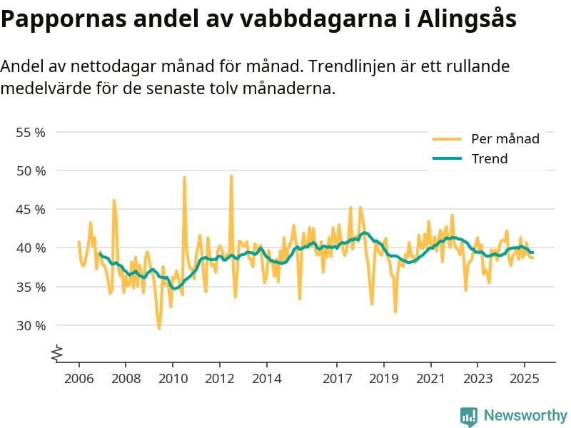 Alingsås ligger en bit från ett jämställt uttag. Under de senaste tolv månaderna har männen stått för 39 procent av all vabb i kommunen. Pappornas uttag peakade våren 2018 då kommunens fäder var uppe i 42 procent av vabbdagarna 1.