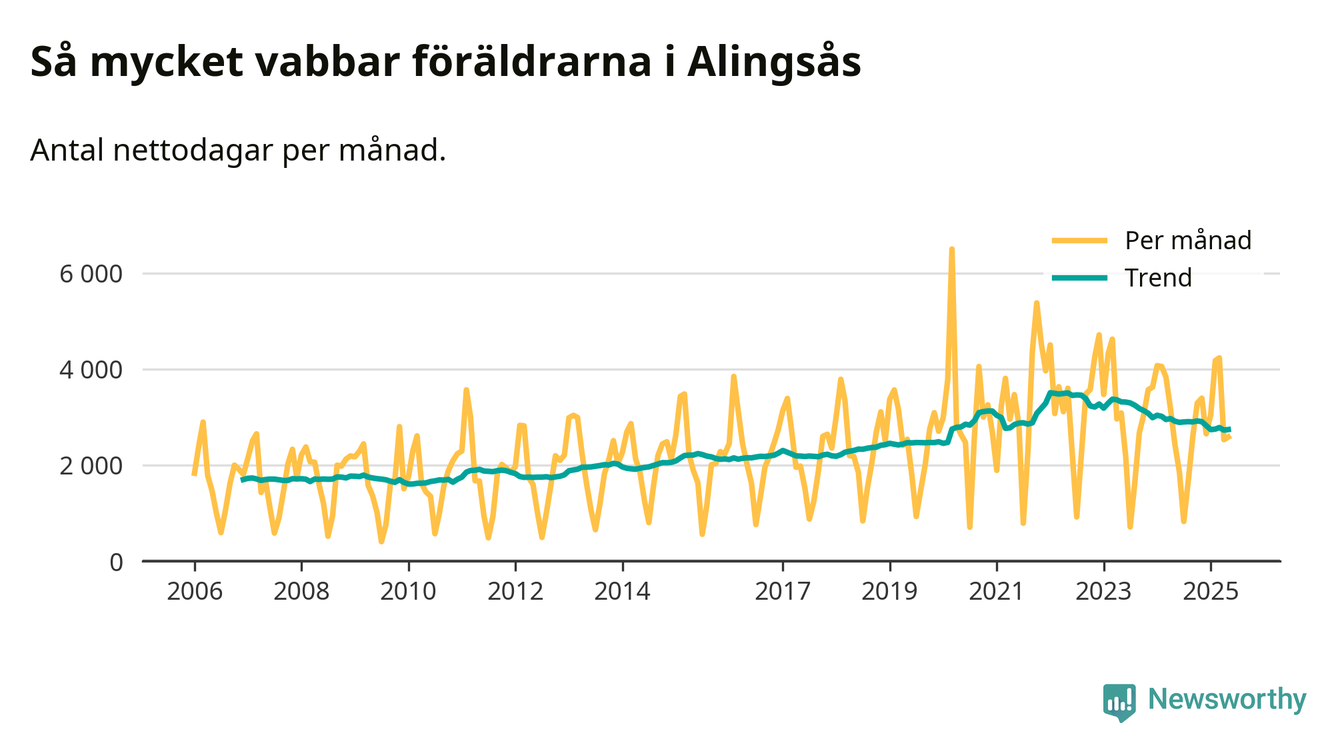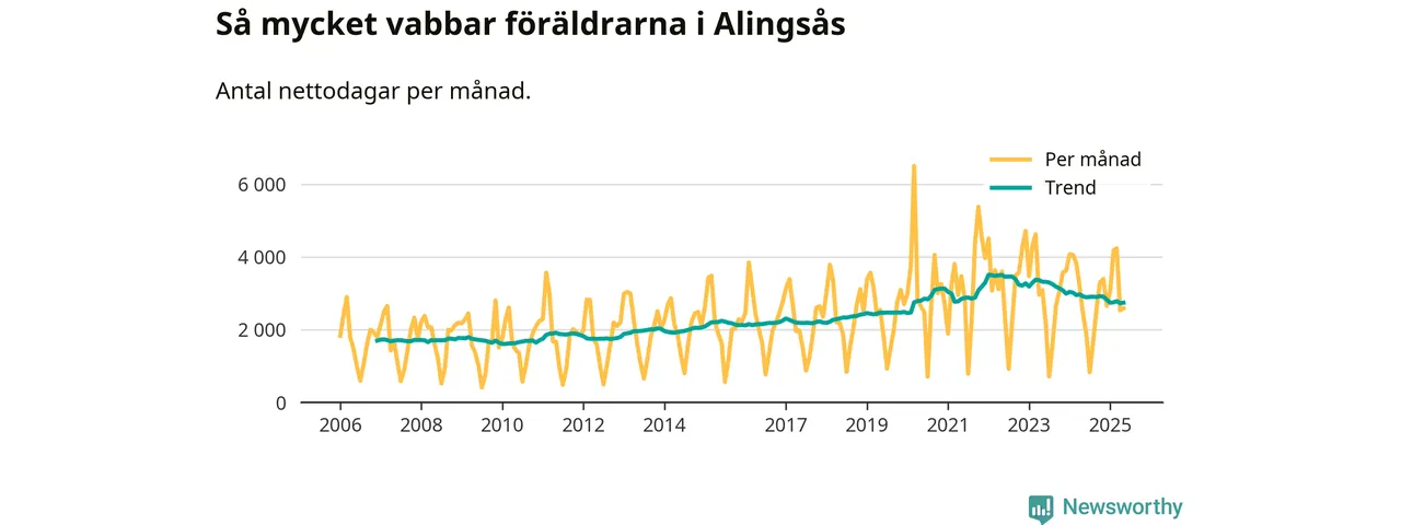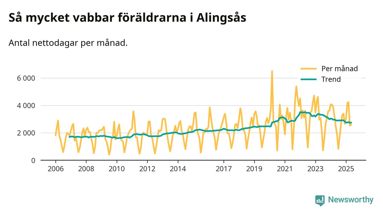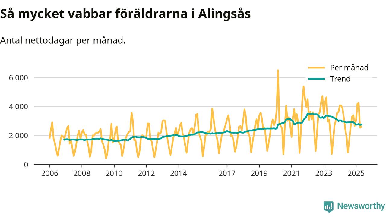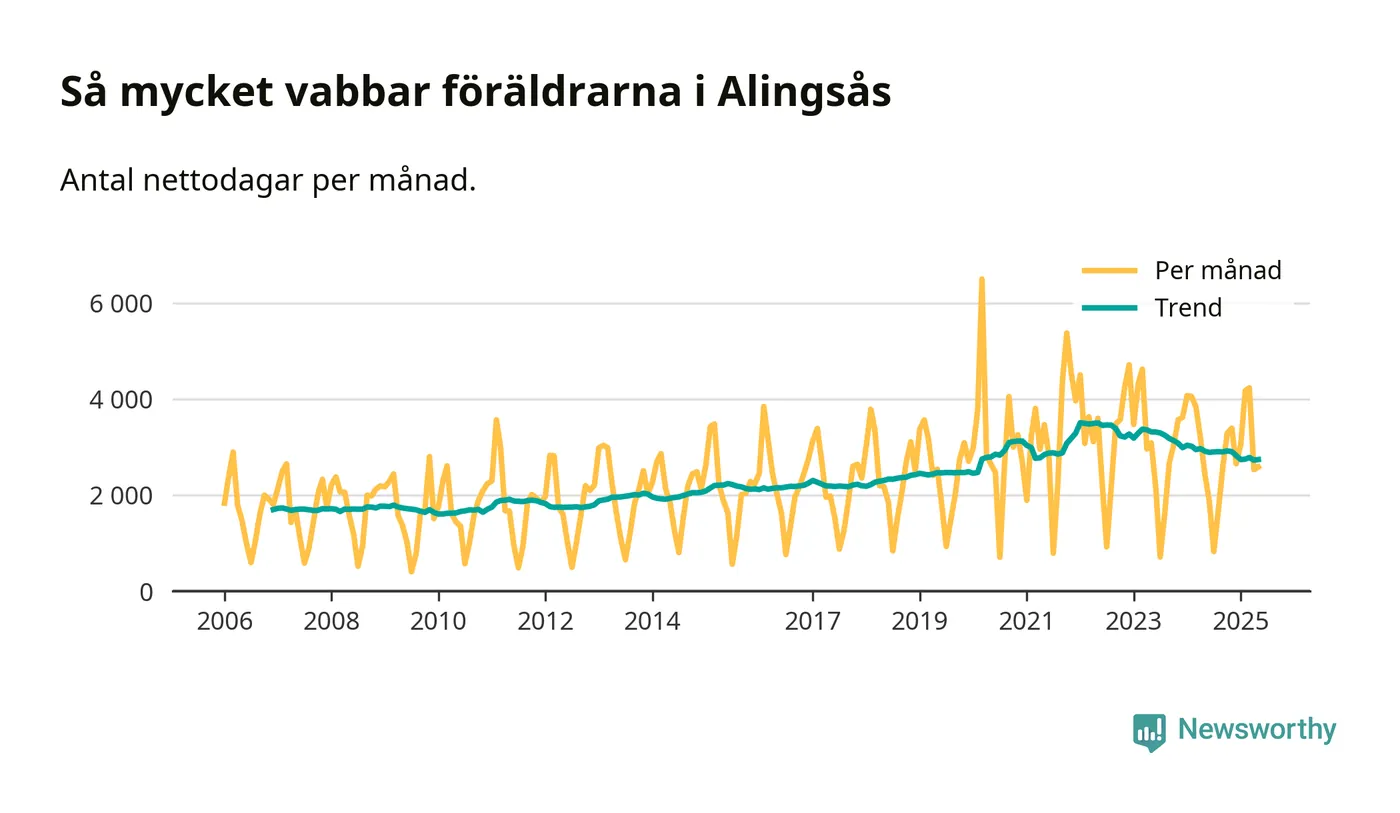 När coronapandemin drog in i mars 2020 peakade antalet vabbdagar både i Alingsås kommun och i riket som helhet. Under de senaste två åren har vabbuttaget börjat minska igen.