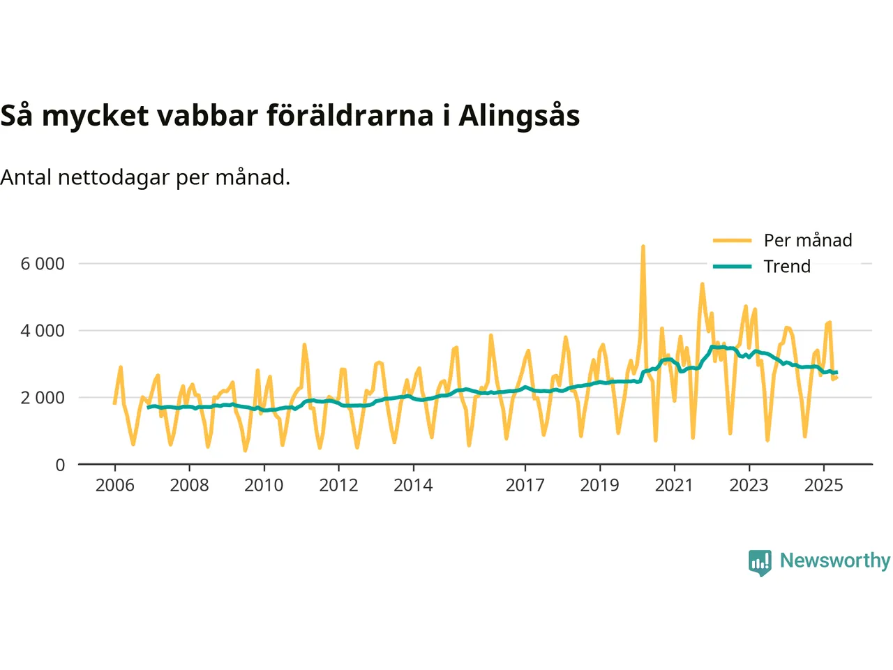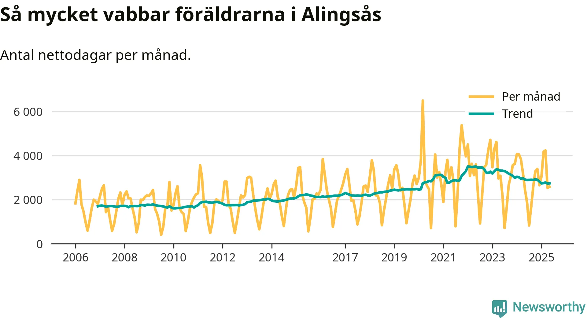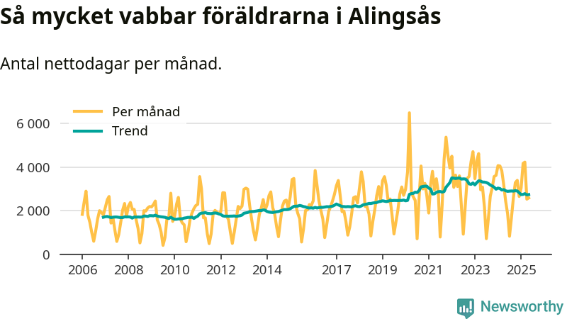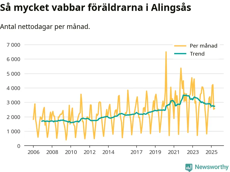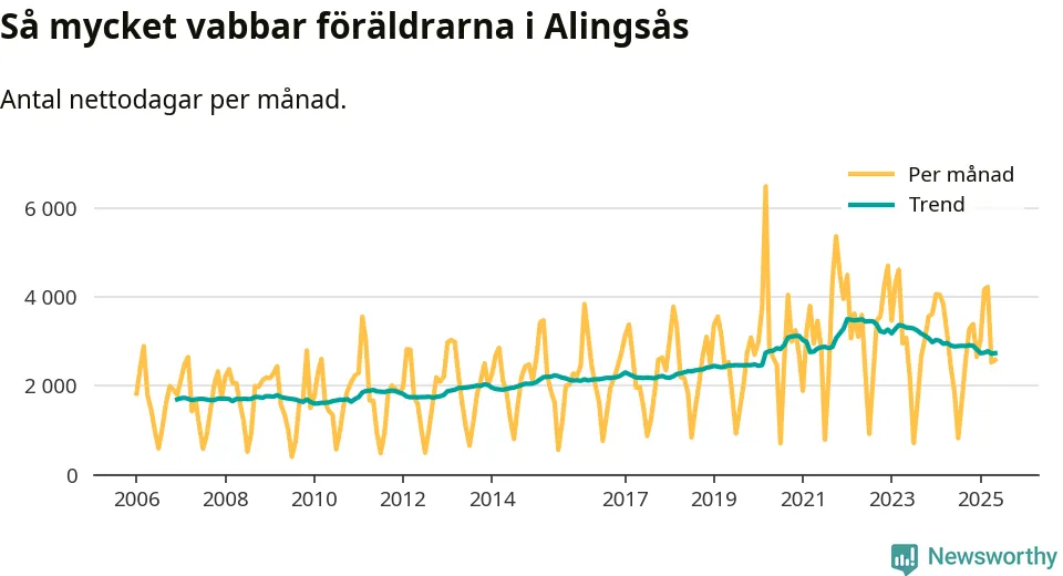 När coronapandemin drog in i mars 2020 peakade antalet vabbdagar både i Alingsås kommun och i riket som helhet. Under de senaste två åren har vabbuttaget börjat minska igen.