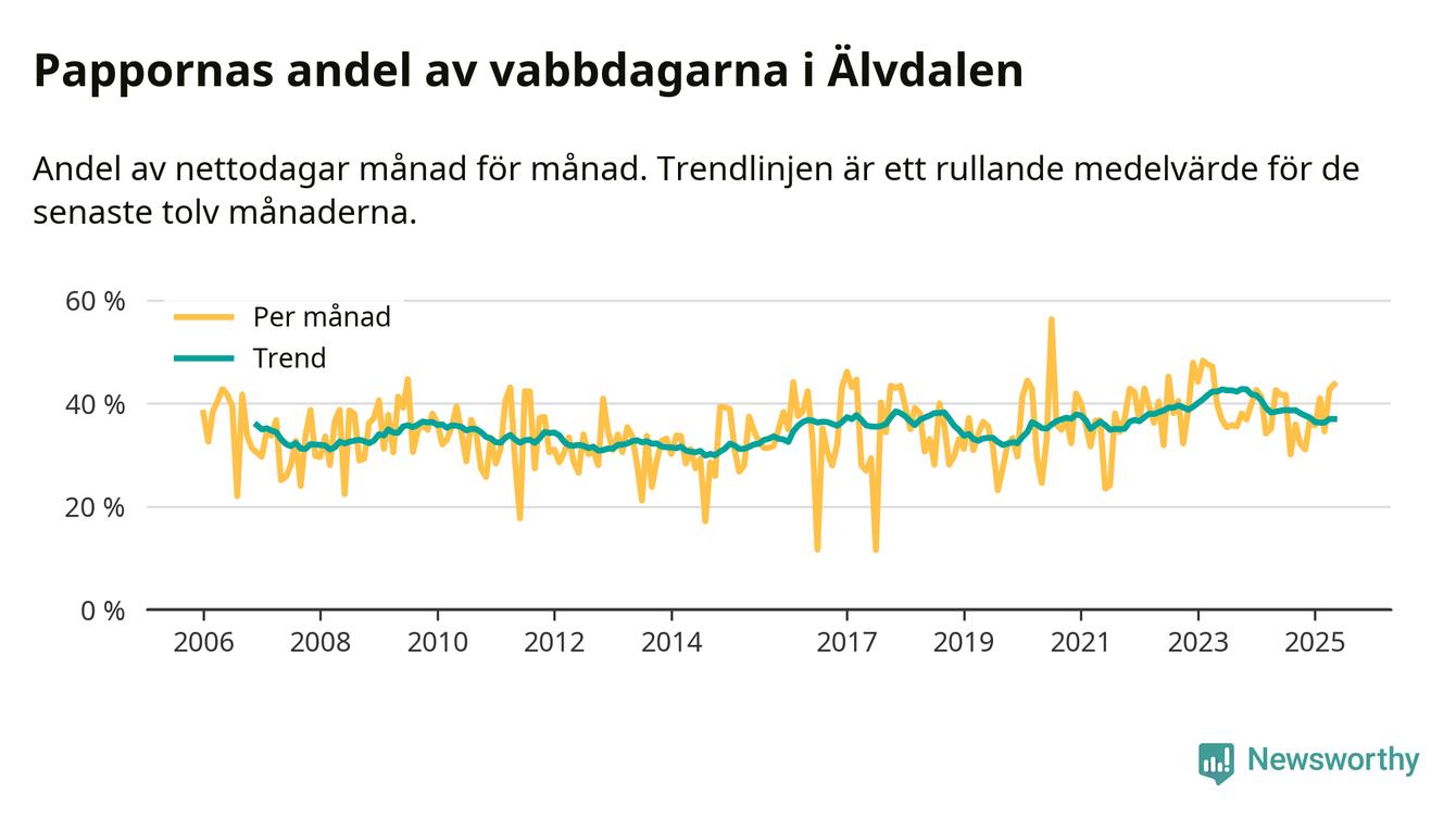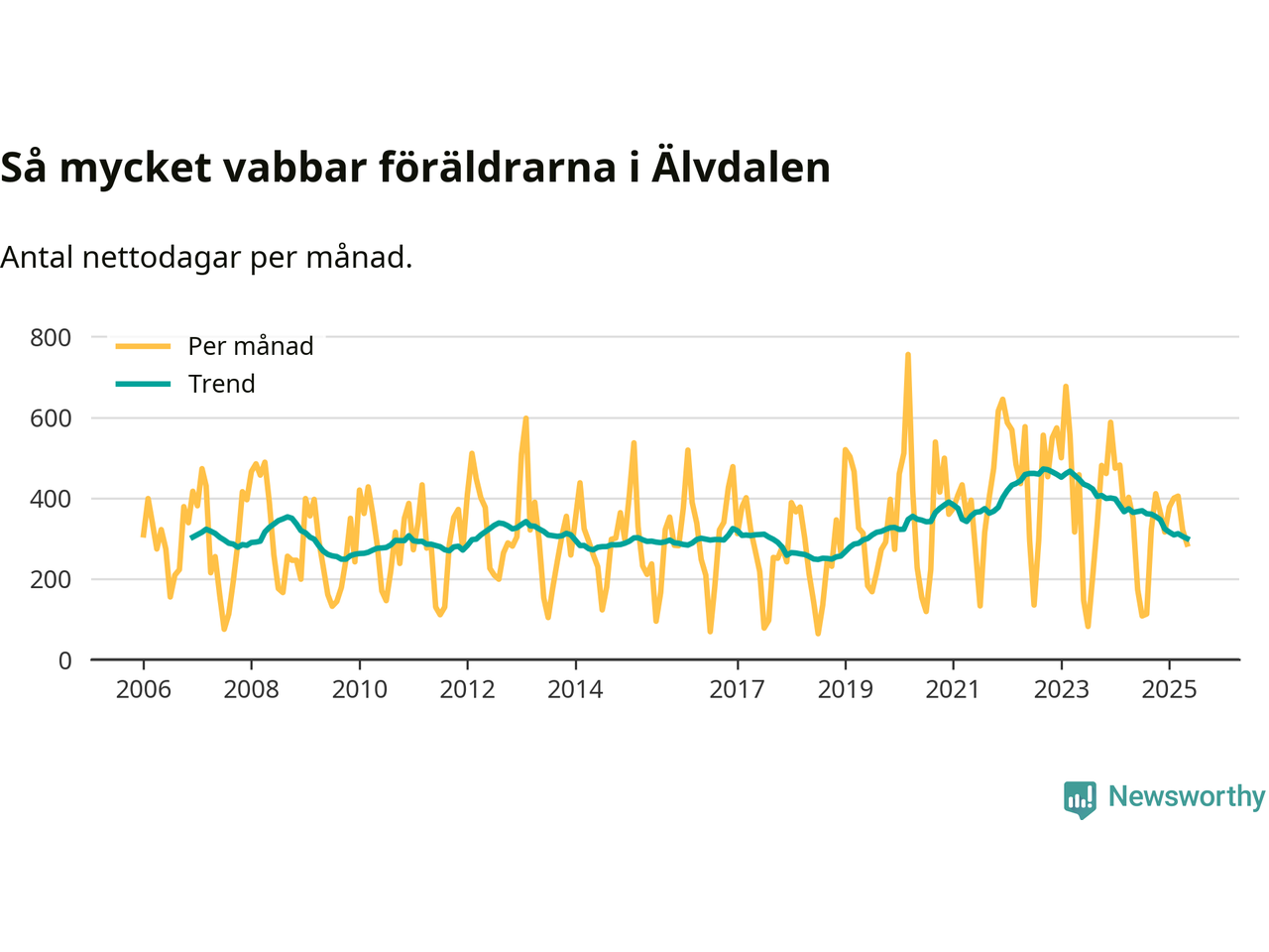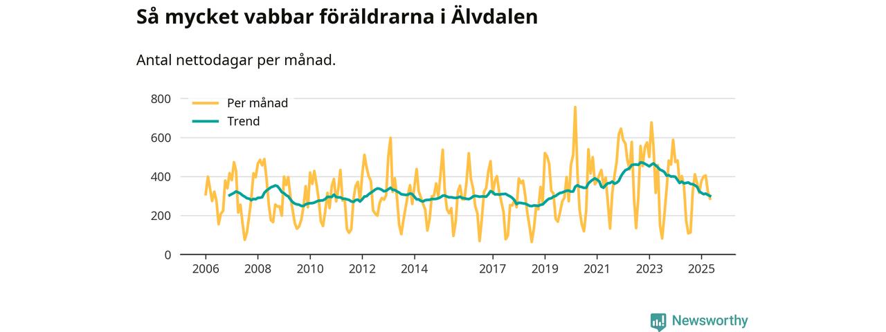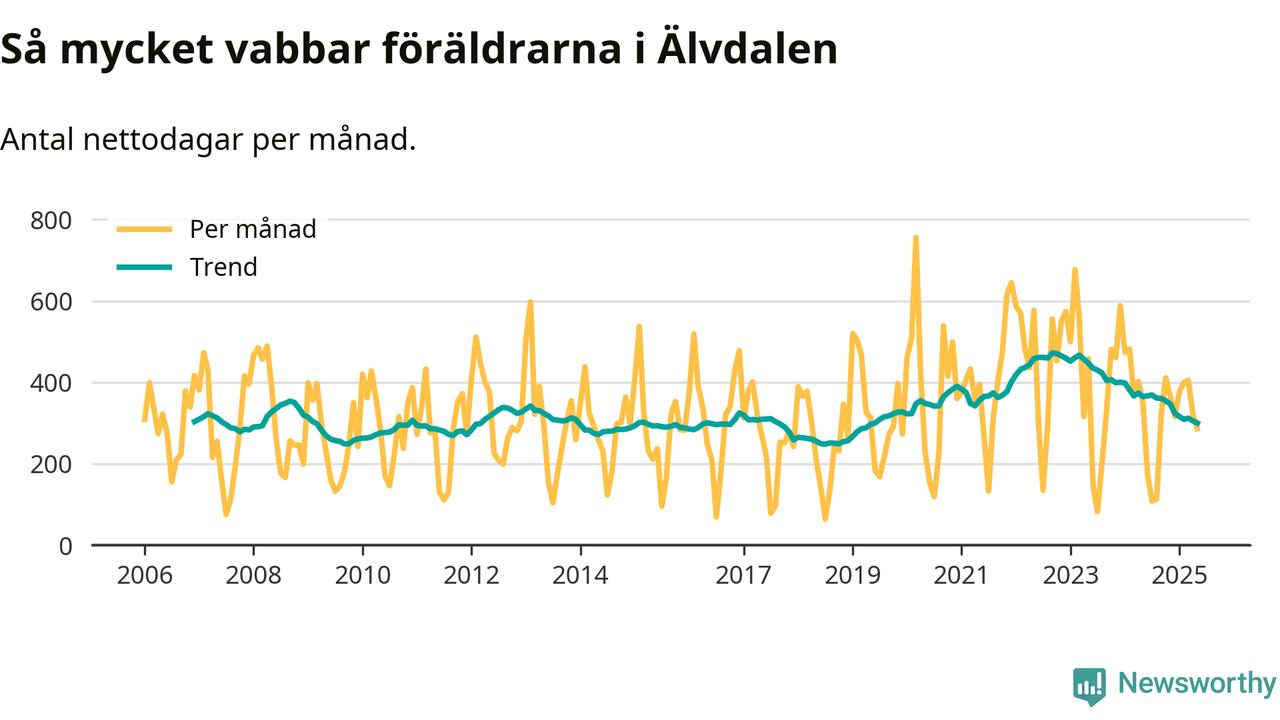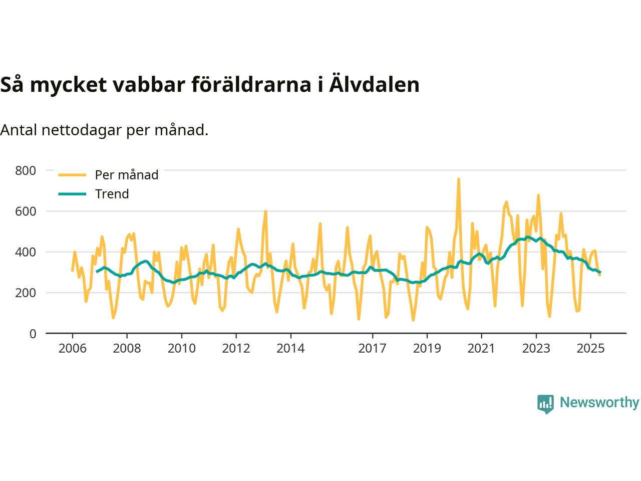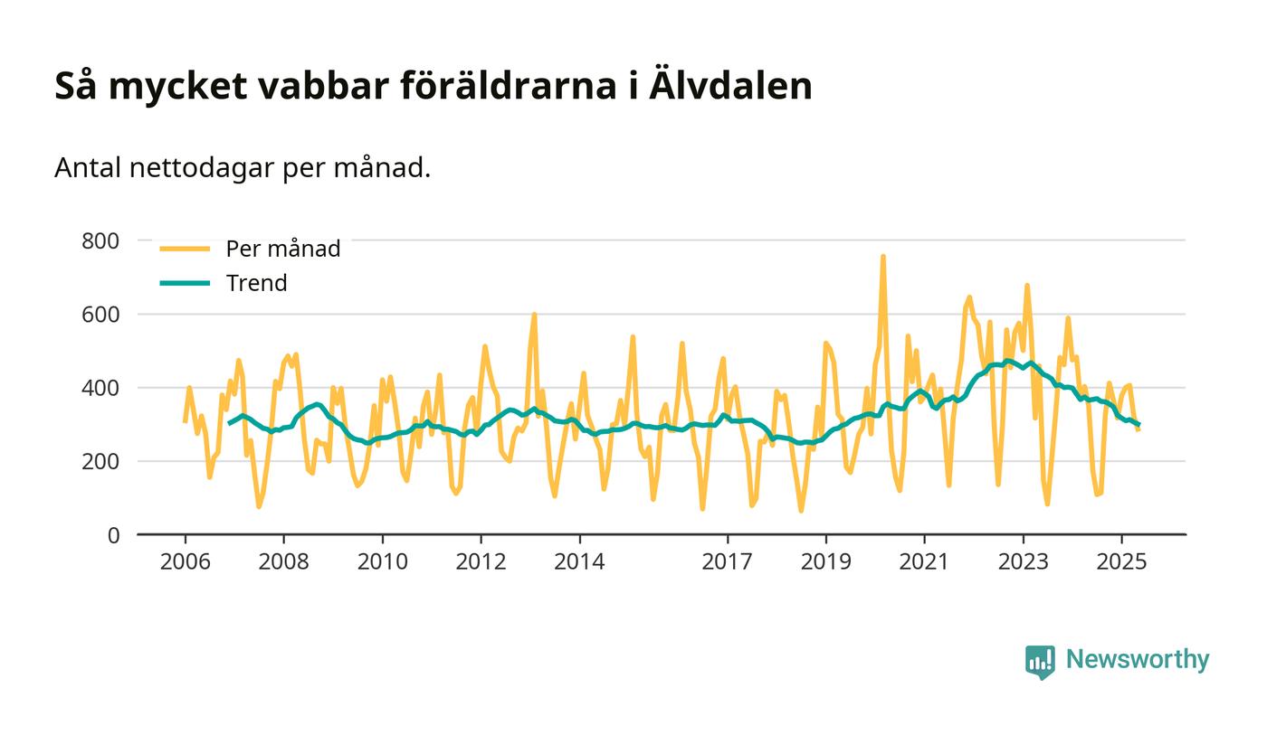 När coronapandemin drog in i mars 2020 peakade antalet vabbdagar både i Älvdalens kommun och i riket som helhet. Under de senaste två åren har vabbuttaget börjat minska igen.