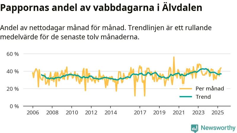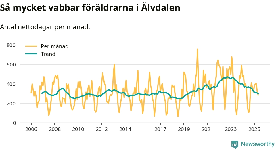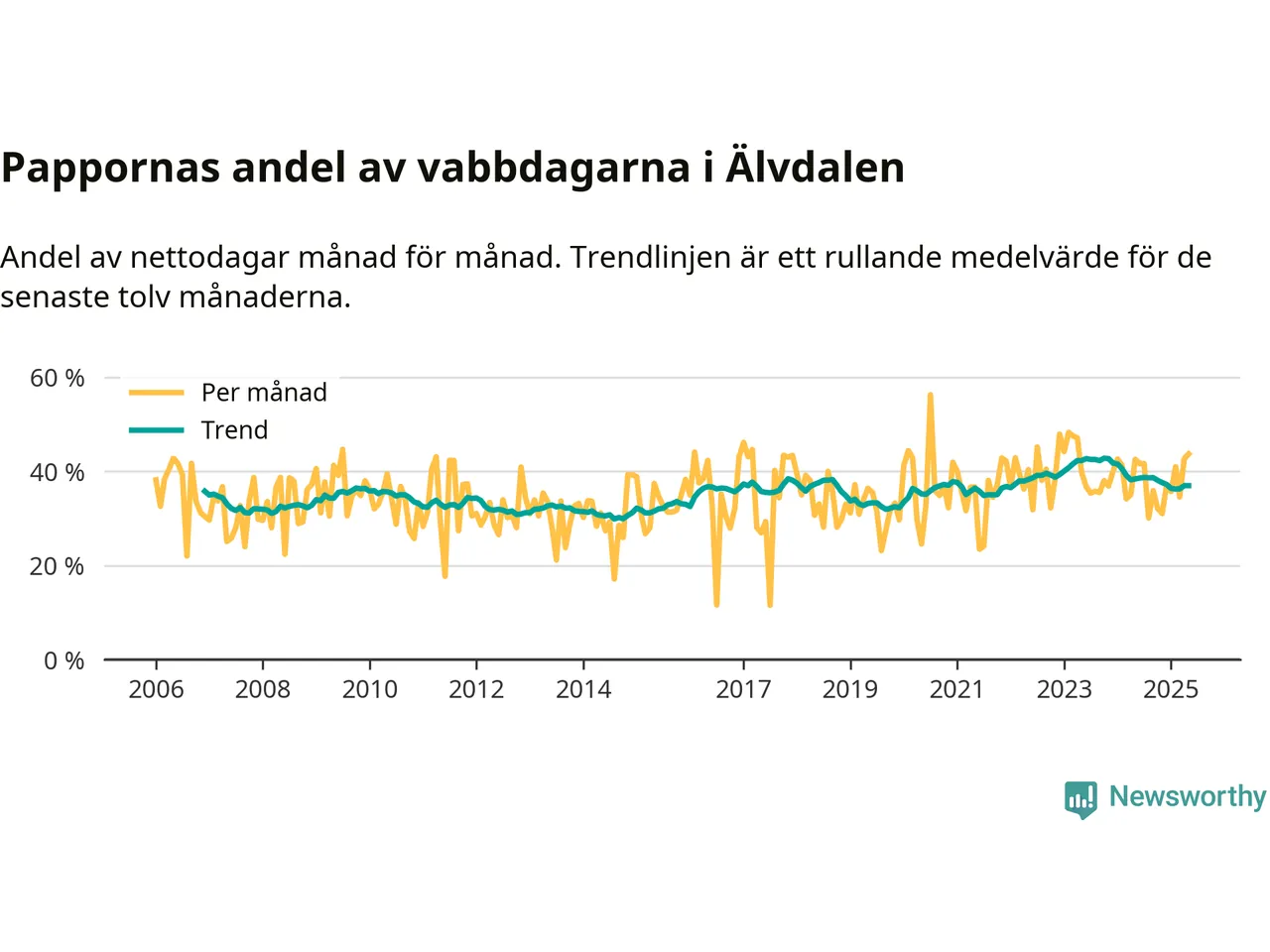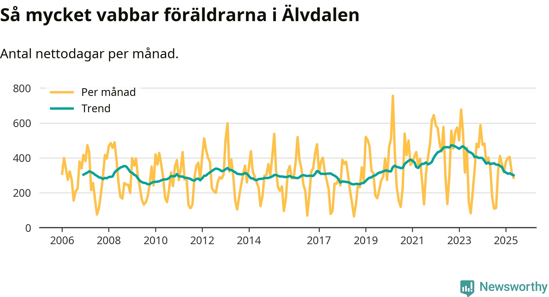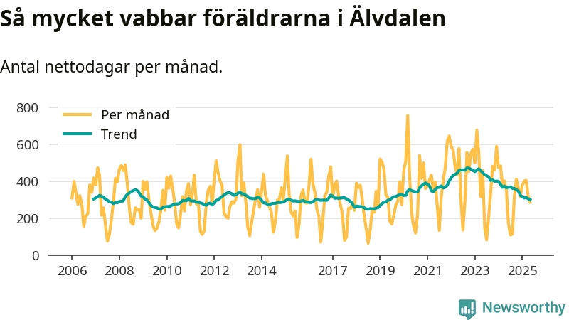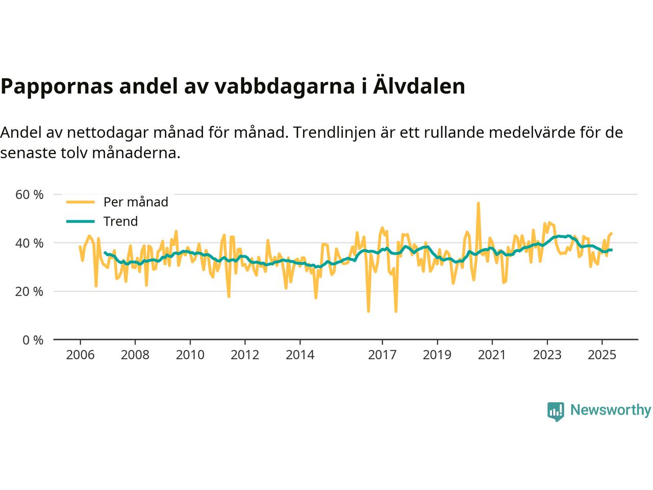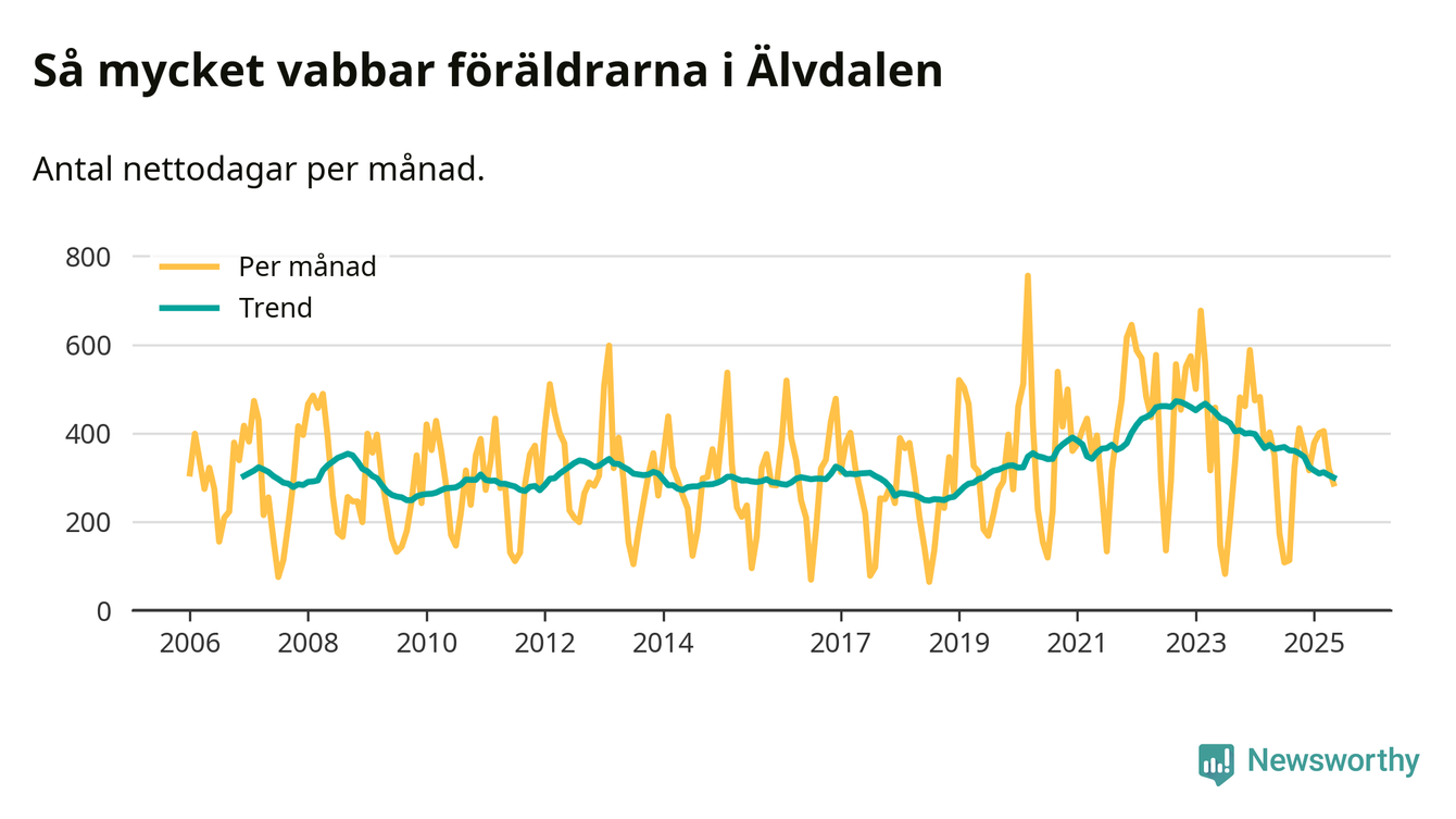 När coronapandemin drog in i mars 2020 peakade antalet vabbdagar både i Älvdalens kommun och i riket som helhet. Under de senaste två åren har vabbuttaget börjat minska igen.