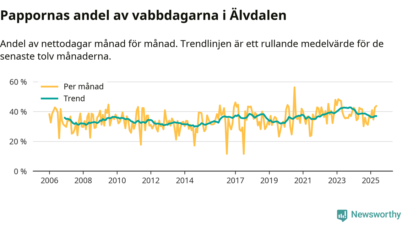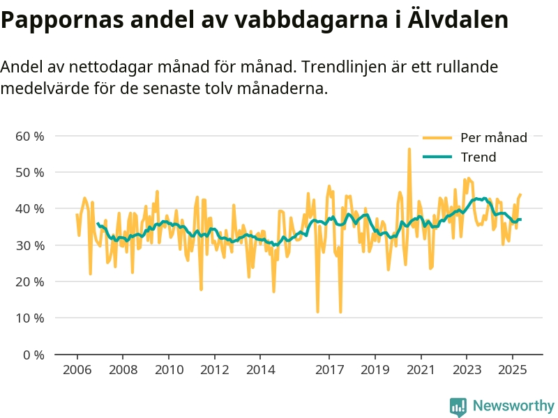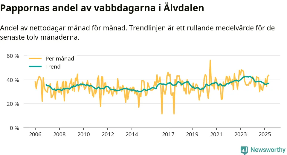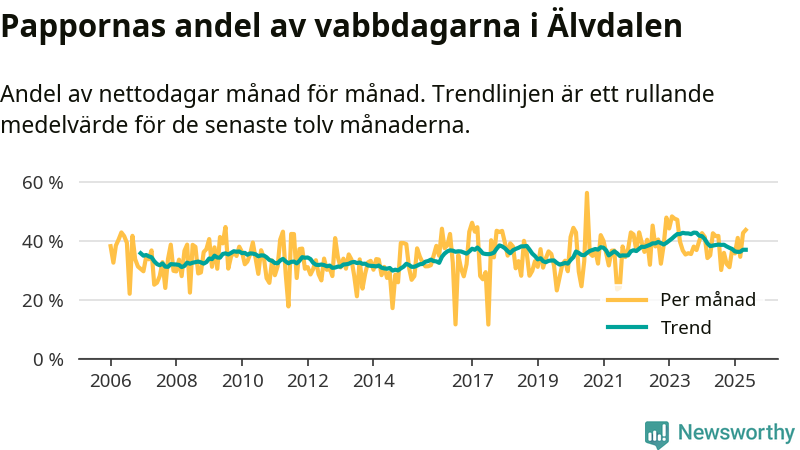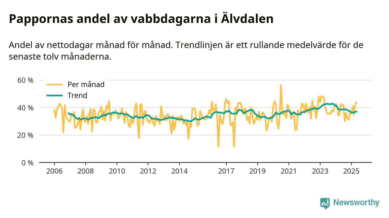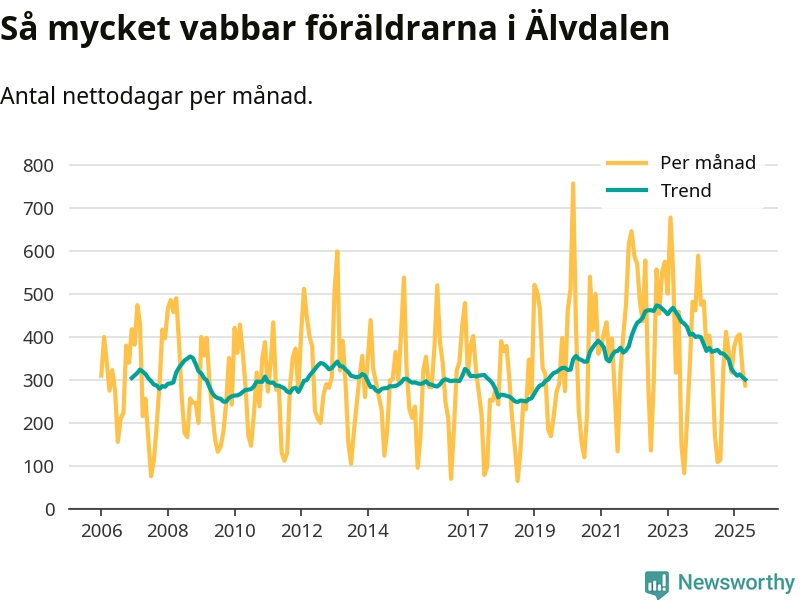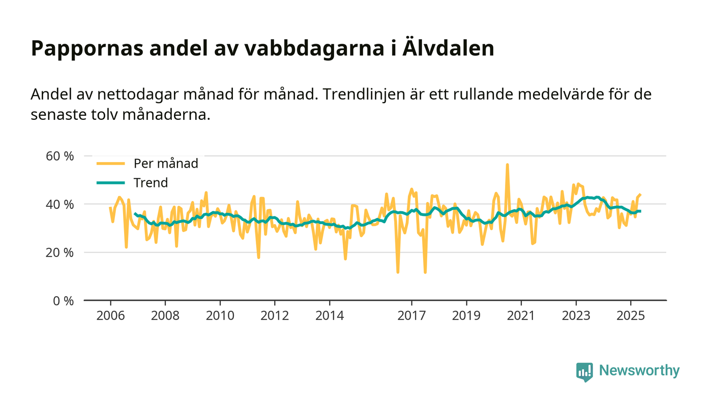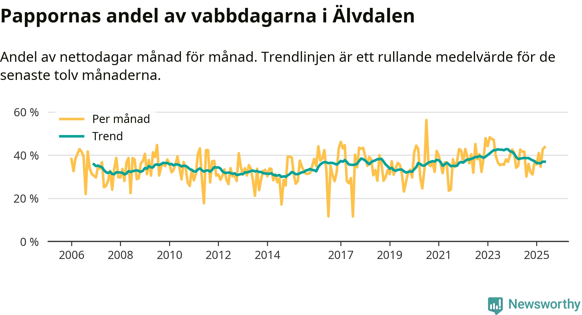 När coronapandemin drog in i mars 2020 peakade antalet vabbdagar både i Älvdalens kommun och i riket som helhet. Under de senaste två åren har vabbuttaget börjat minska igen.