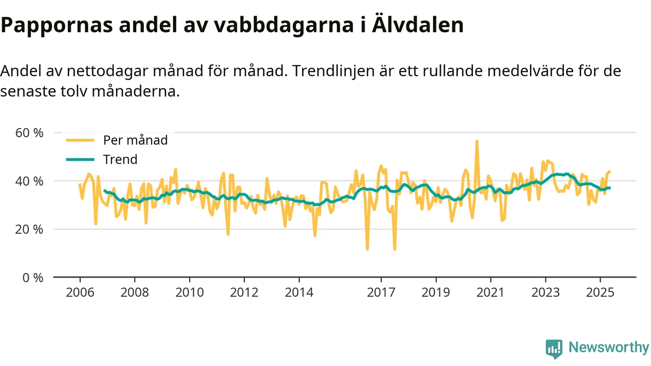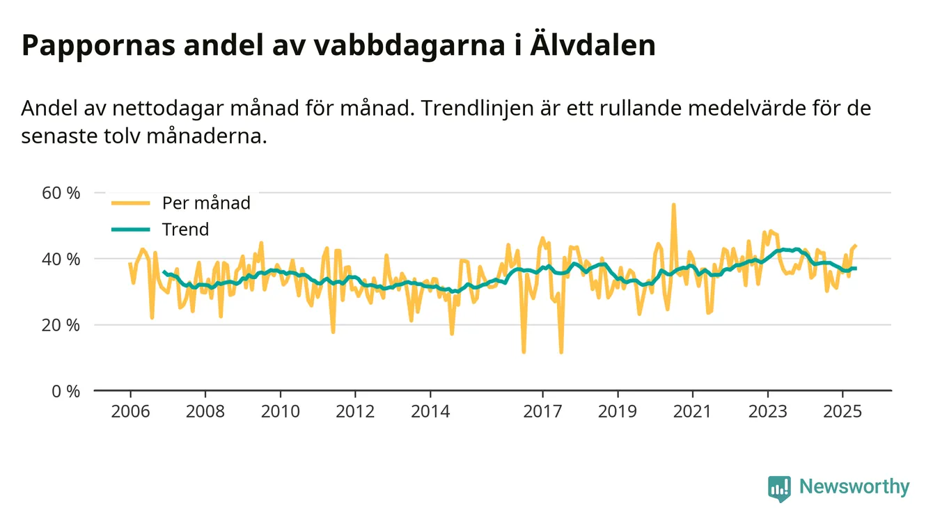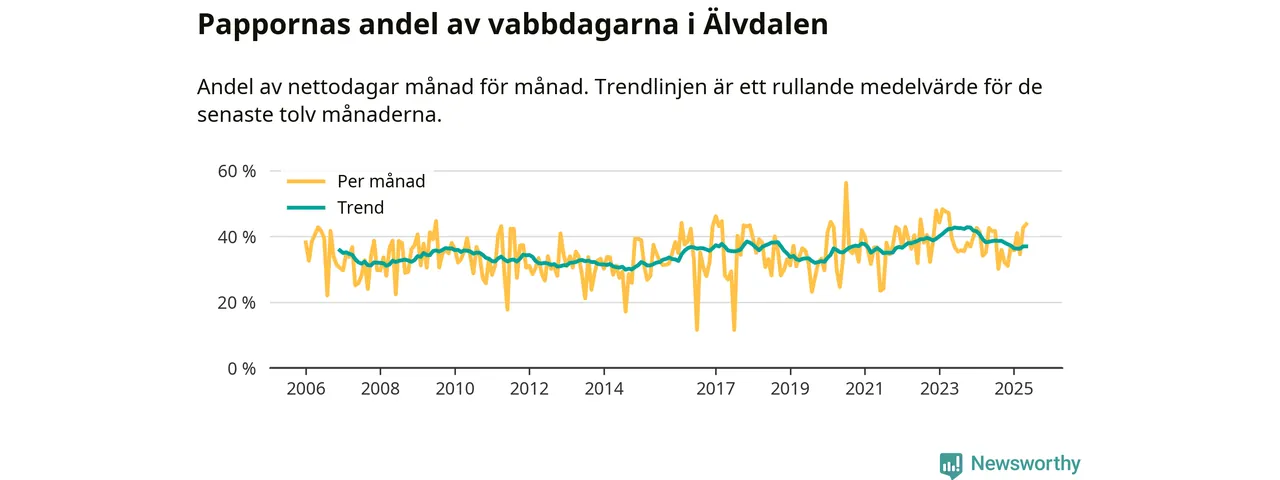 Älvdalen ligger en bit från ett jämställt uttag. Under de senaste tolv månaderna har männen stått för 37 procent av all vabb i kommunen. I år har andelen varit lägre än på över tre år.