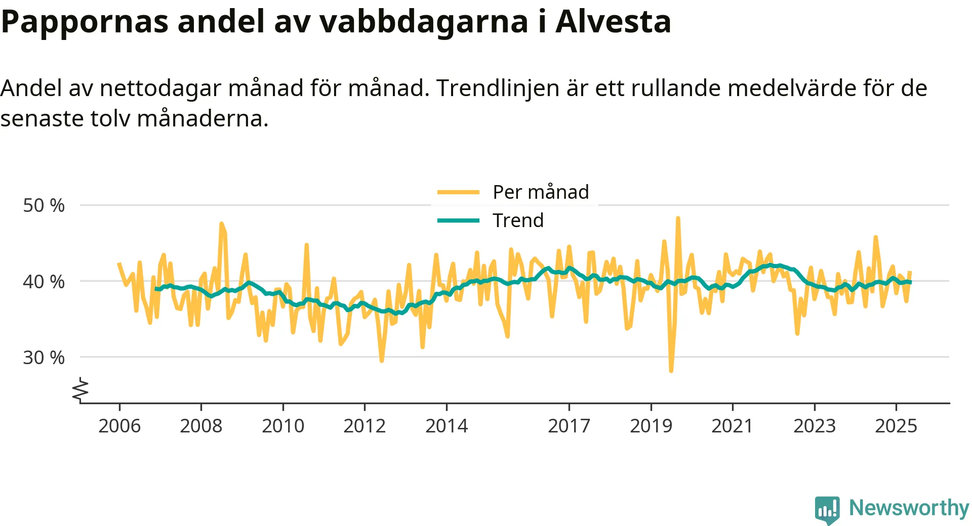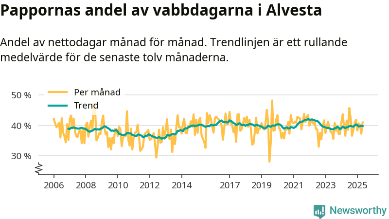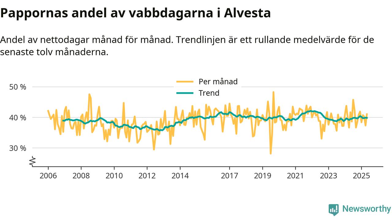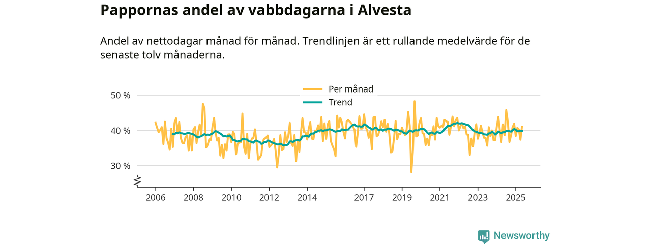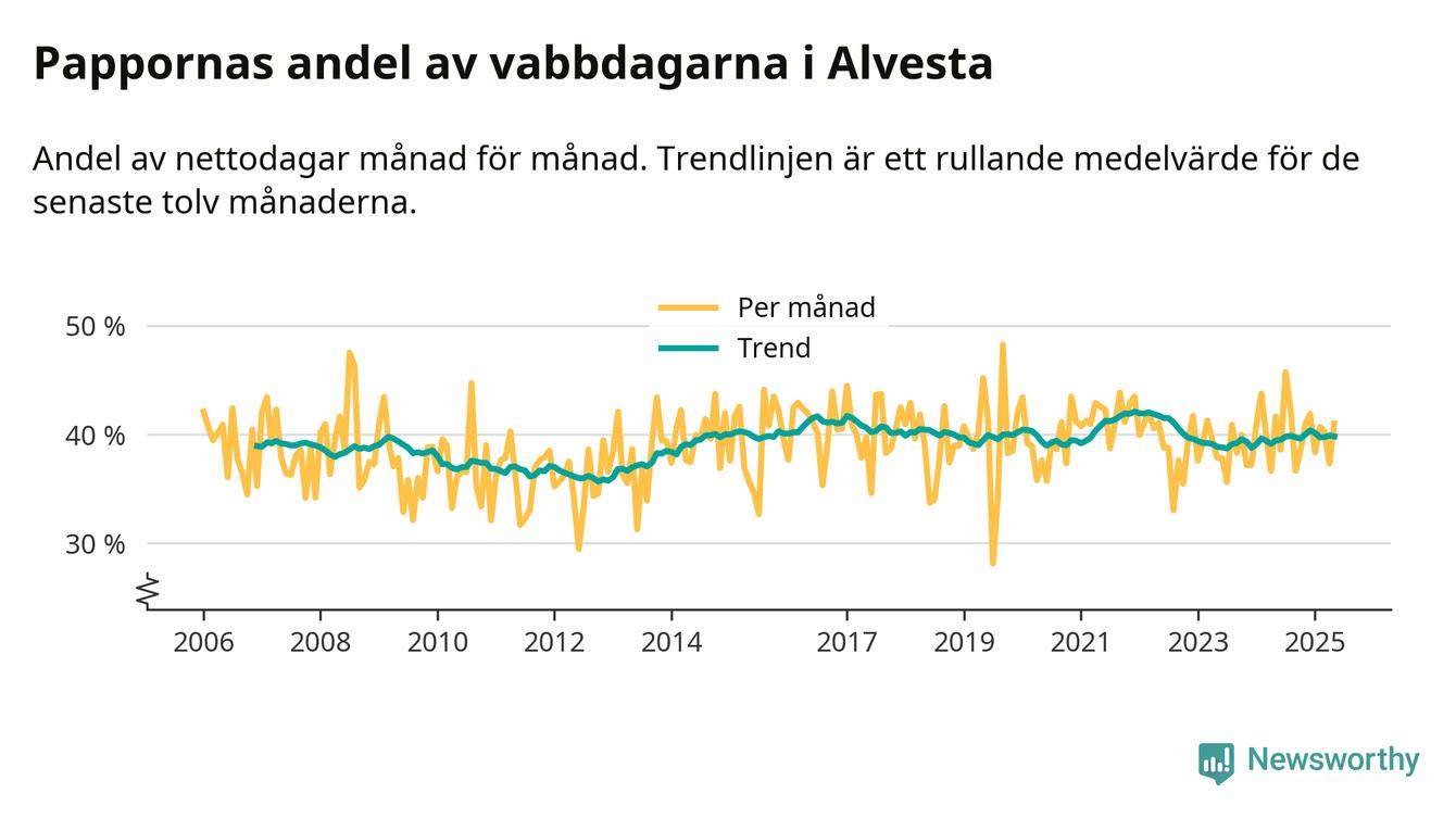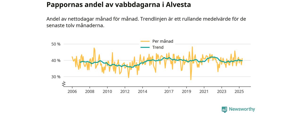 Alvesta ligger en bit från ett jämställt uttag. Under de senaste tolv månaderna har männen stått för 40 procent av all vabb i kommunen. Pappornas uttag peakade vintern 2021 då kommunens fäder var uppe i 42 procent av vabbdagarna 1.