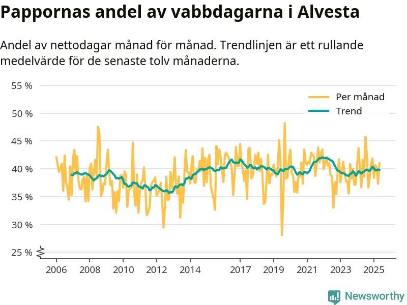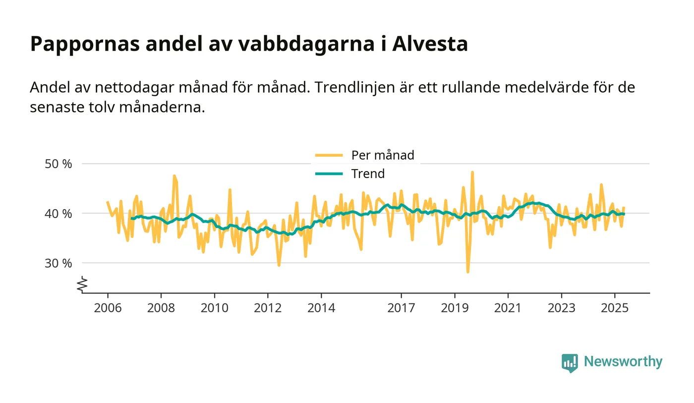 Pappor i Alvesta vabbar mer än rikssnittet (38 procent) och ungefär lika mycket som andra män i Kronobergs län. Skillnaderna inom landet är stora. Dorotea är den enda kommun i landet som når 50–50-fördelning.