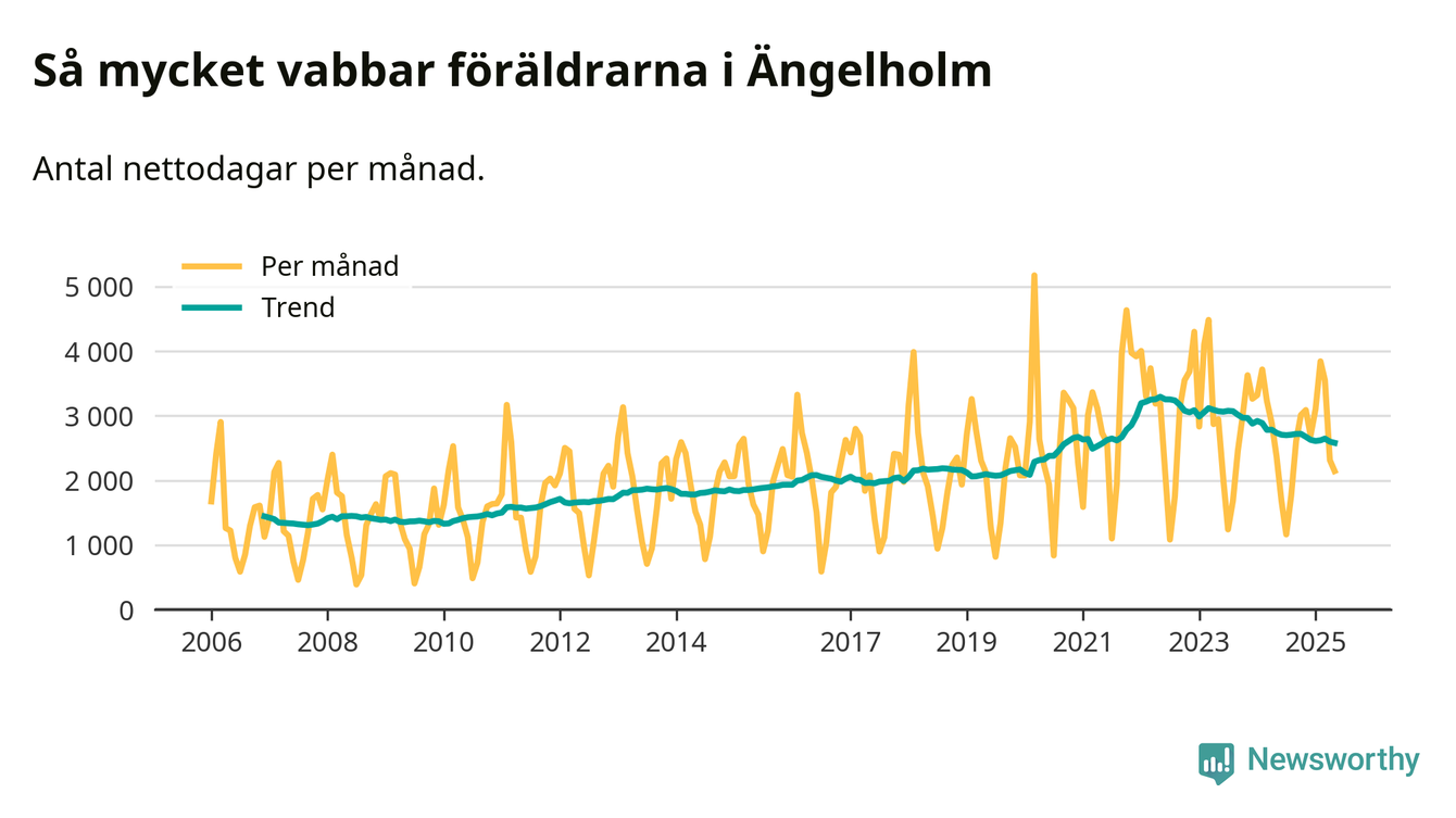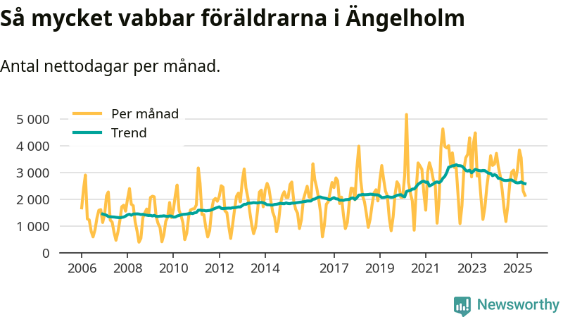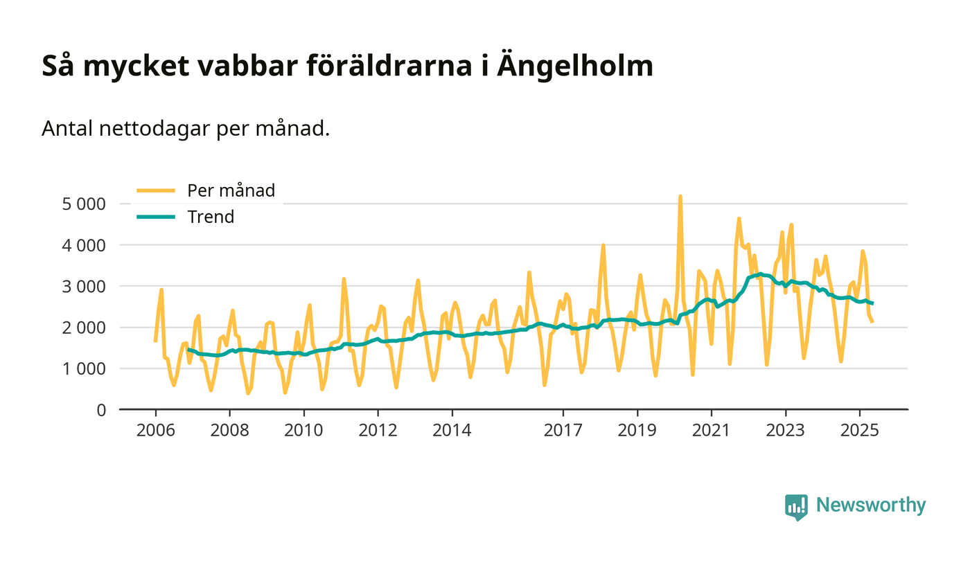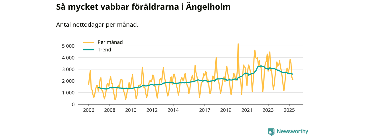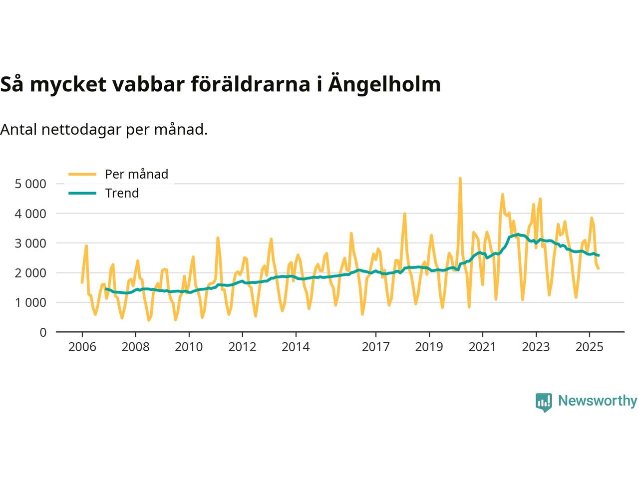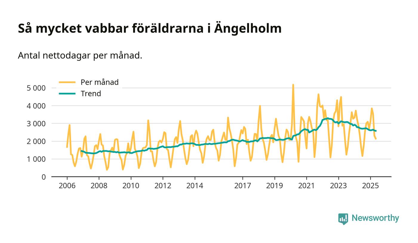 När coronapandemin drog in i mars 2020 peakade antalet vabbdagar både i Ängelholms kommun och i riket som helhet. Under de senaste två åren har vabbuttaget börjat minska igen.