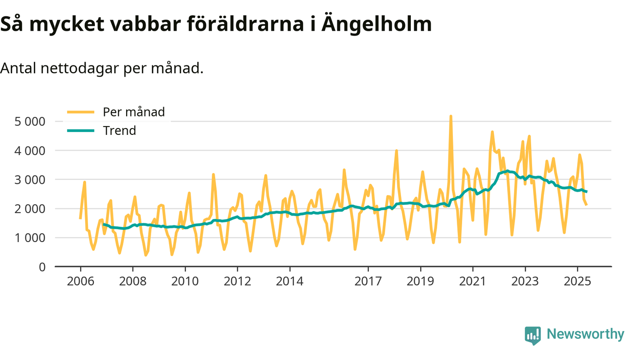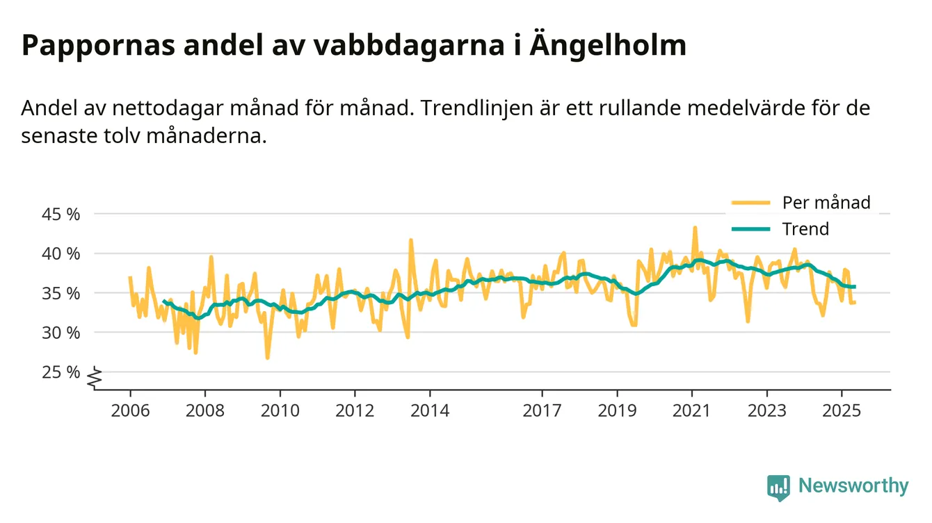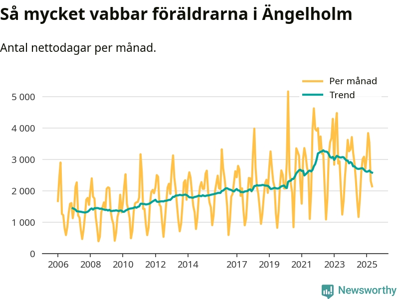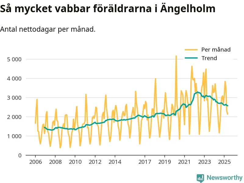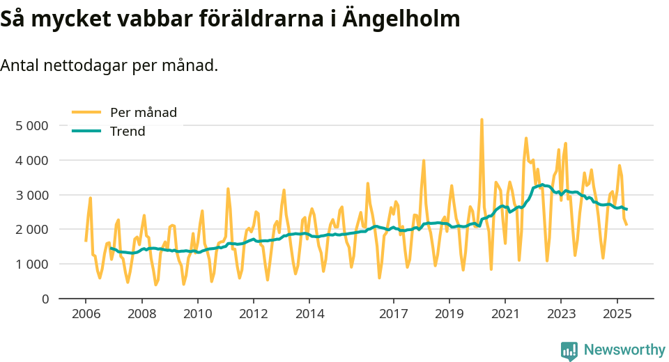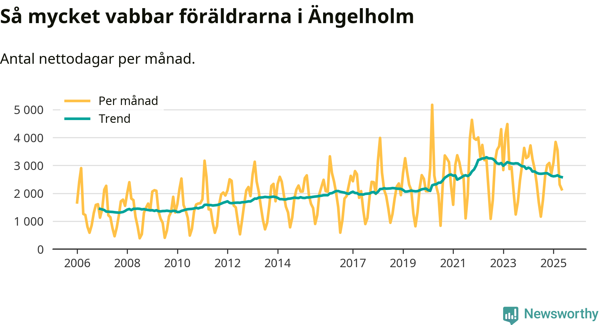 När coronapandemin drog in i mars 2020 peakade antalet vabbdagar både i Ängelholms kommun och i riket som helhet. Under de senaste två åren har vabbuttaget börjat minska igen.