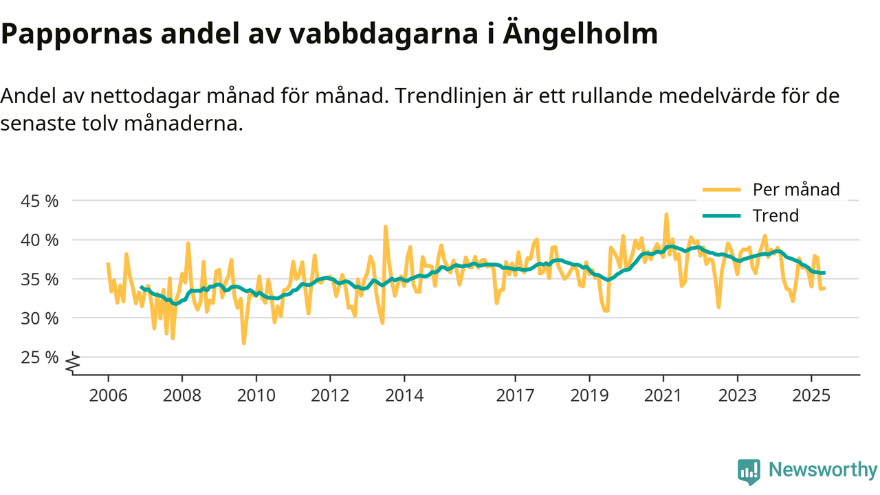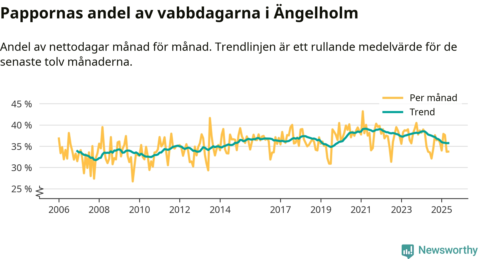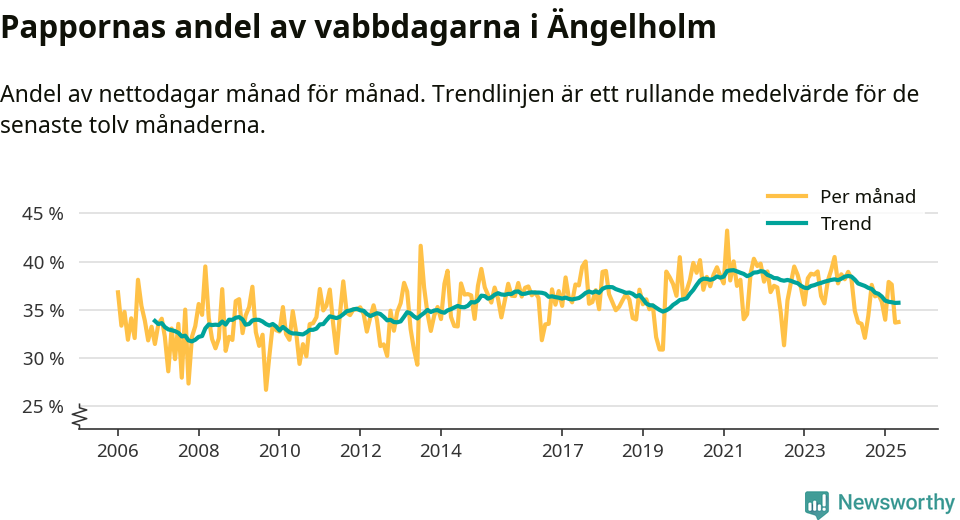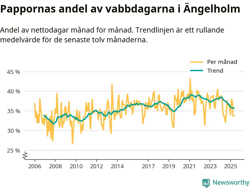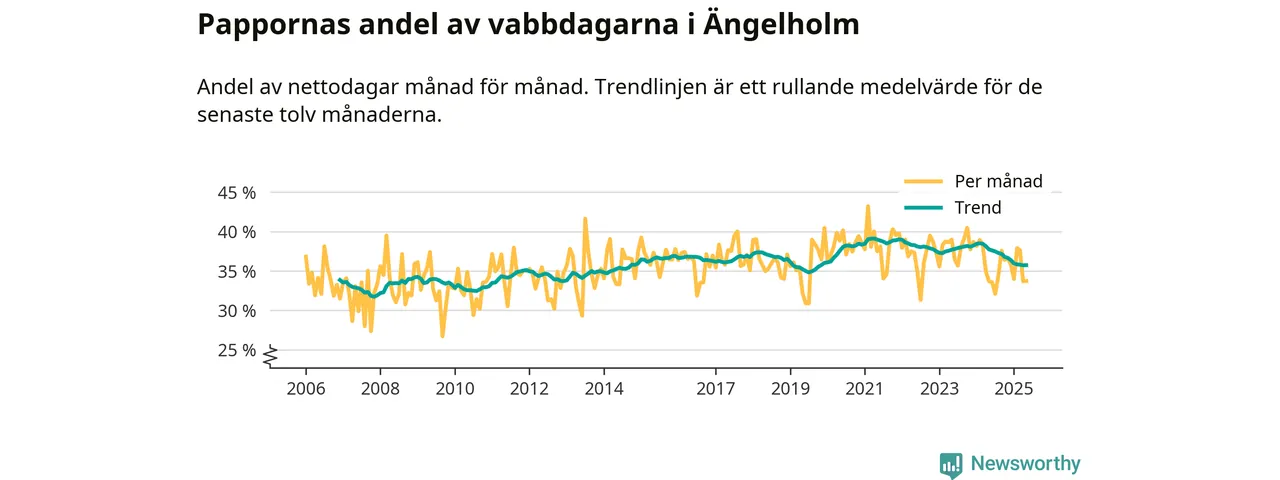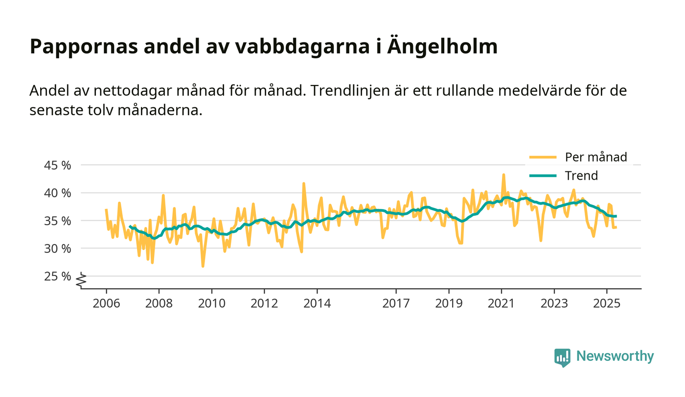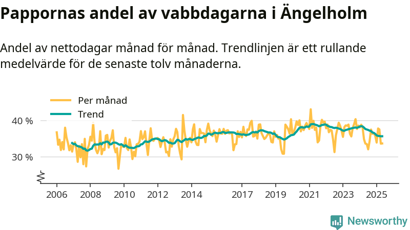 När coronapandemin drog in i mars 2020 peakade antalet vabbdagar både i Ängelholms kommun och i riket som helhet. Under de senaste två åren har vabbuttaget börjat minska igen.