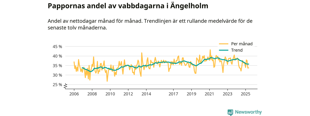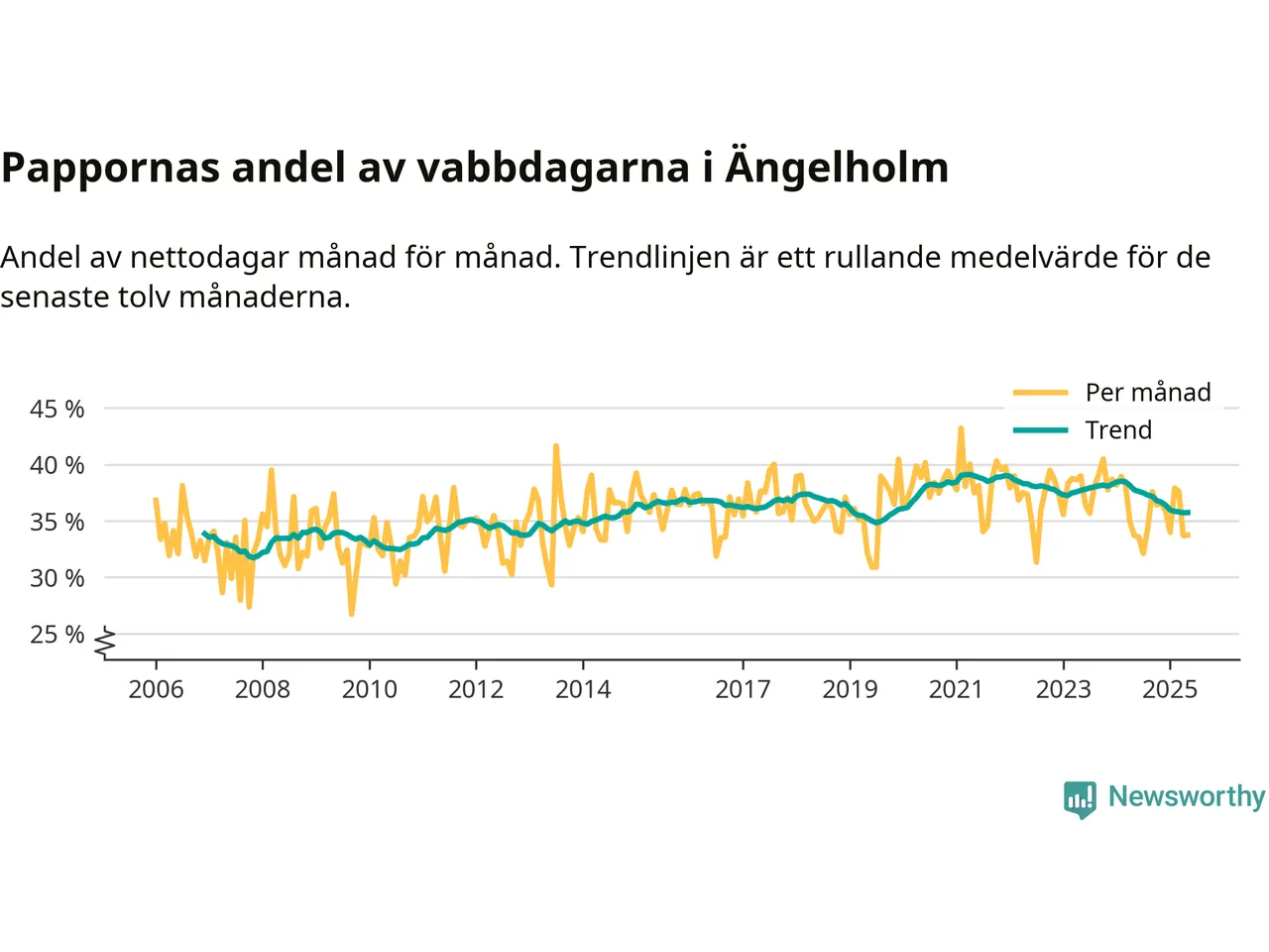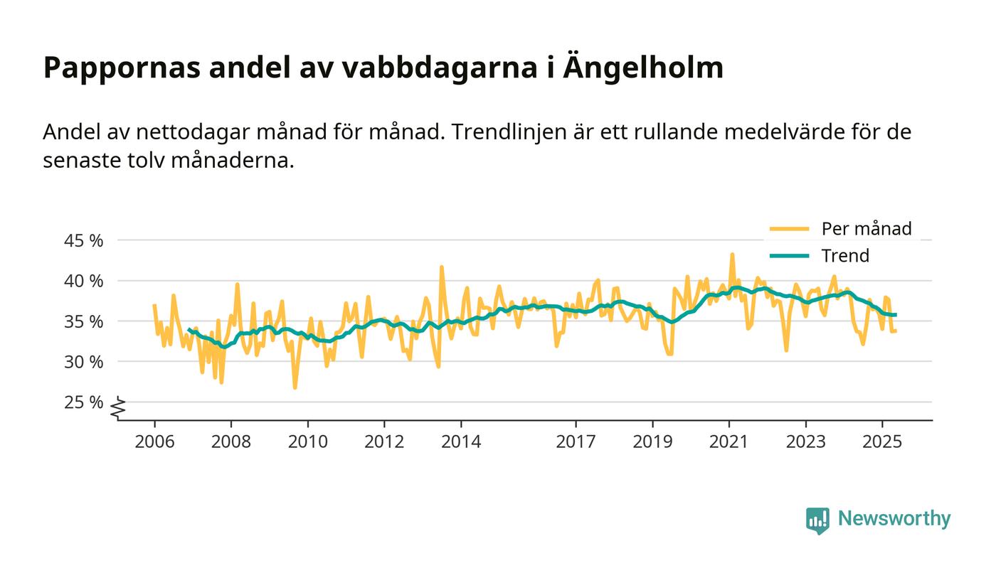 Ängelholm ligger en bit från ett jämställt uttag. Under de senaste tolv månaderna har männen stått för 36 procent av all vabb i kommunen. I år har andelen varit lägre än på nästan sex år.