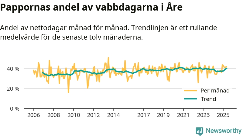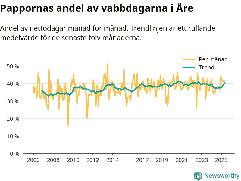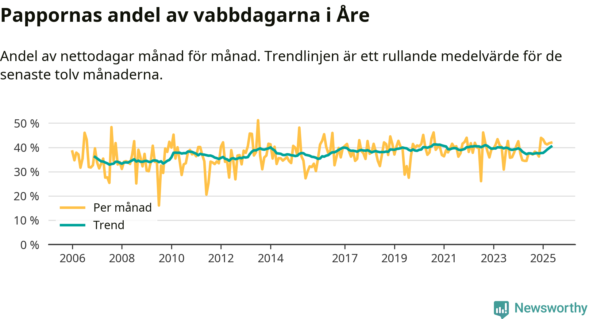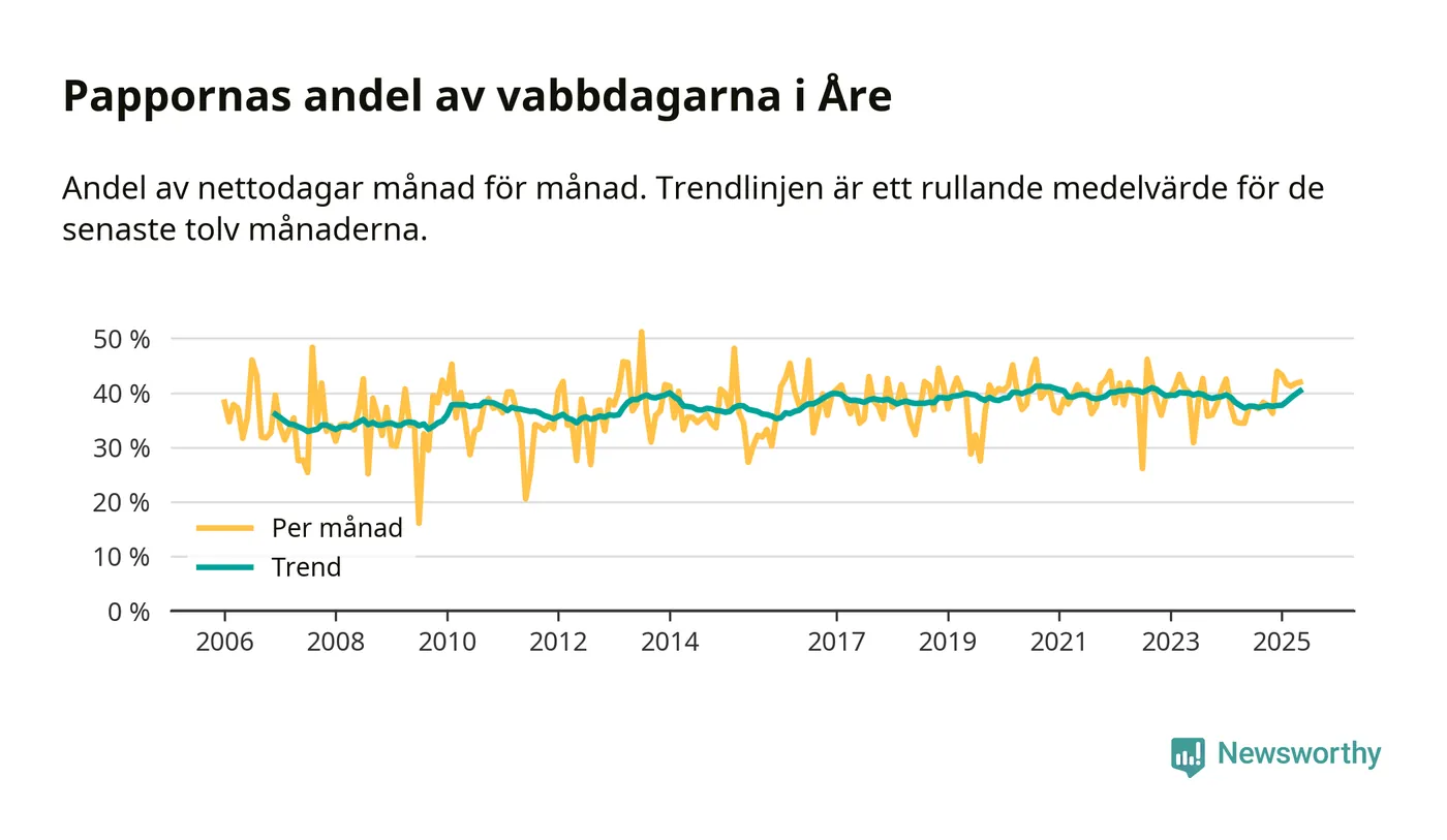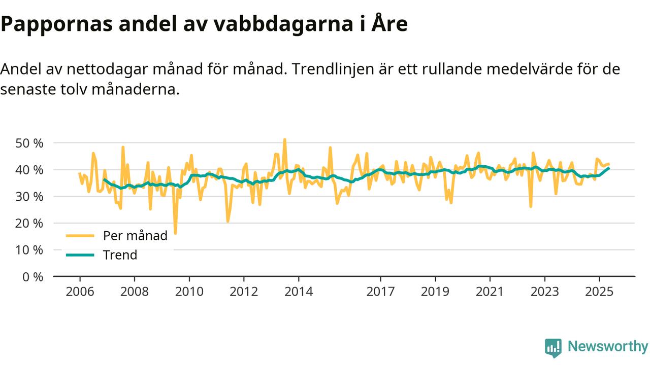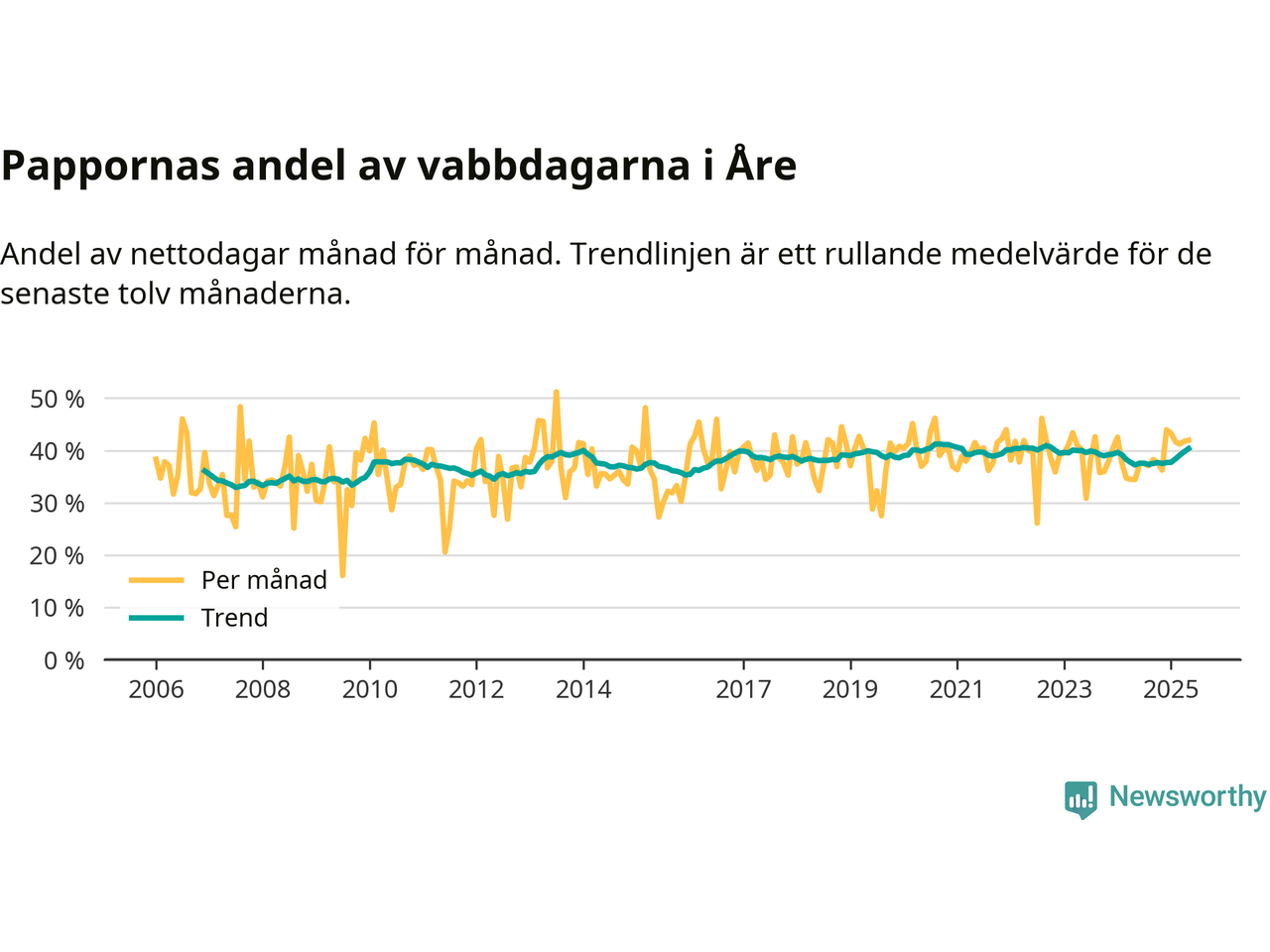 Pappor i Åre vabbar mer än rikssnittet (38 procent) och ungefär lika mycket som andra män i Jämtlands län. Andelen är näst högst i länet. Skillnaderna inom landet är stora. Dorotea är den enda kommun i landet som når 50–50-fördelning.