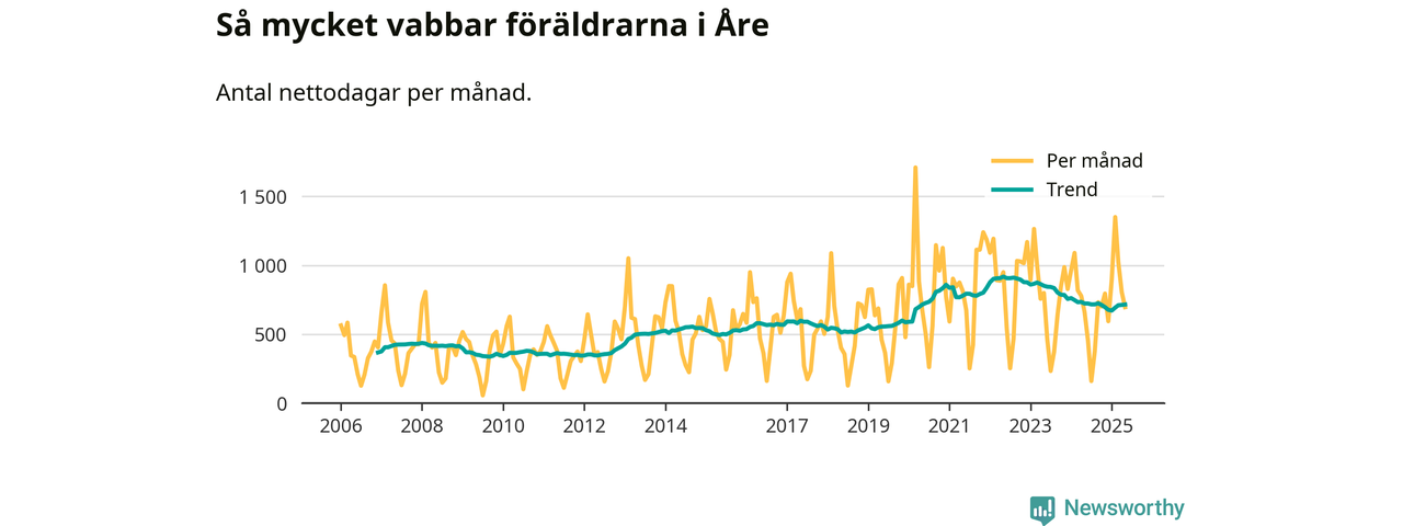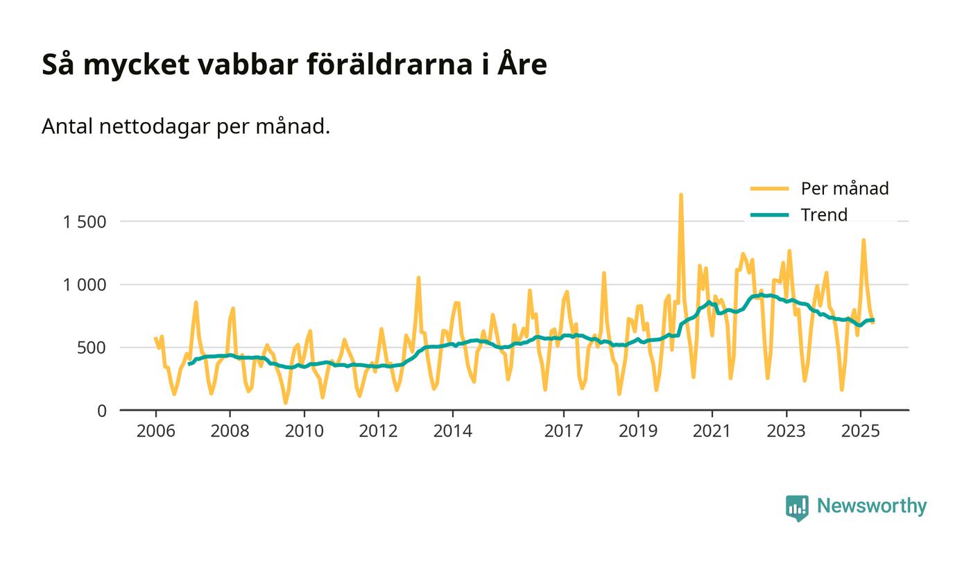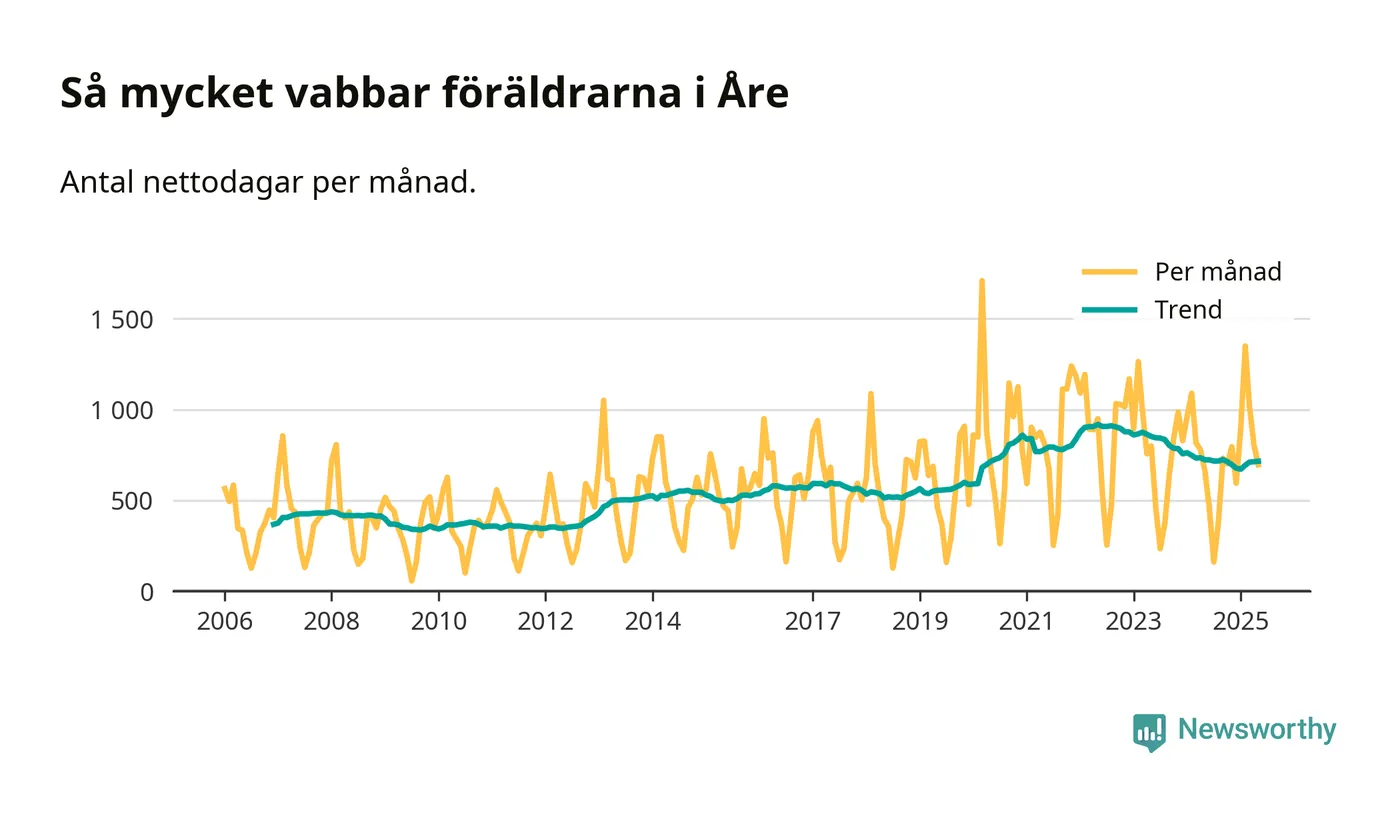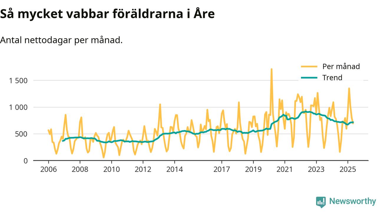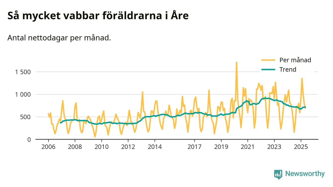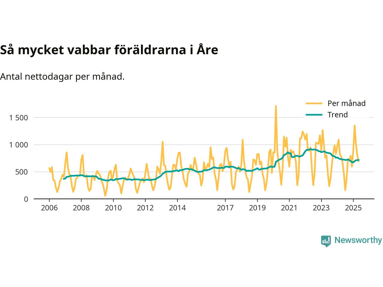 När coronapandemin drog in i mars 2020 peakade antalet vabbdagar både i Åre kommun och i riket som helhet. Under de senaste två åren har vabbuttaget börjat minska igen.