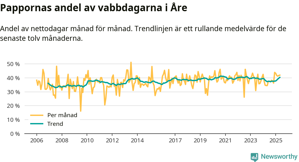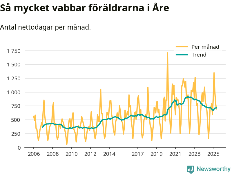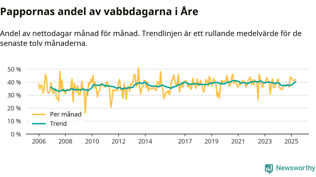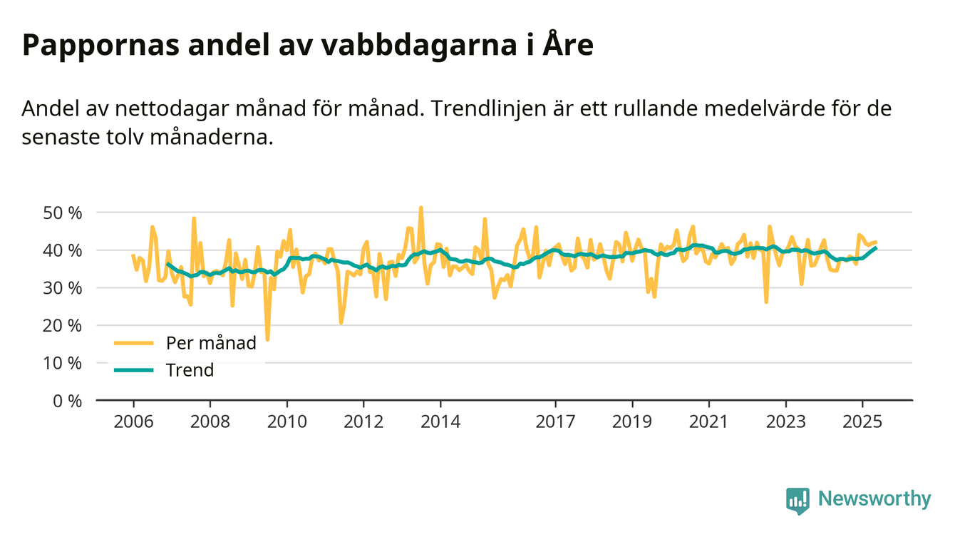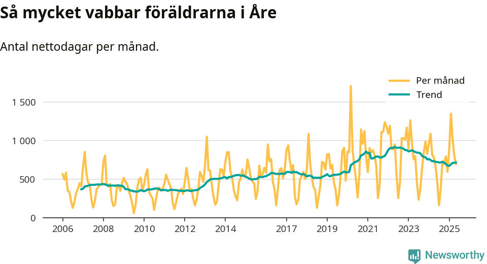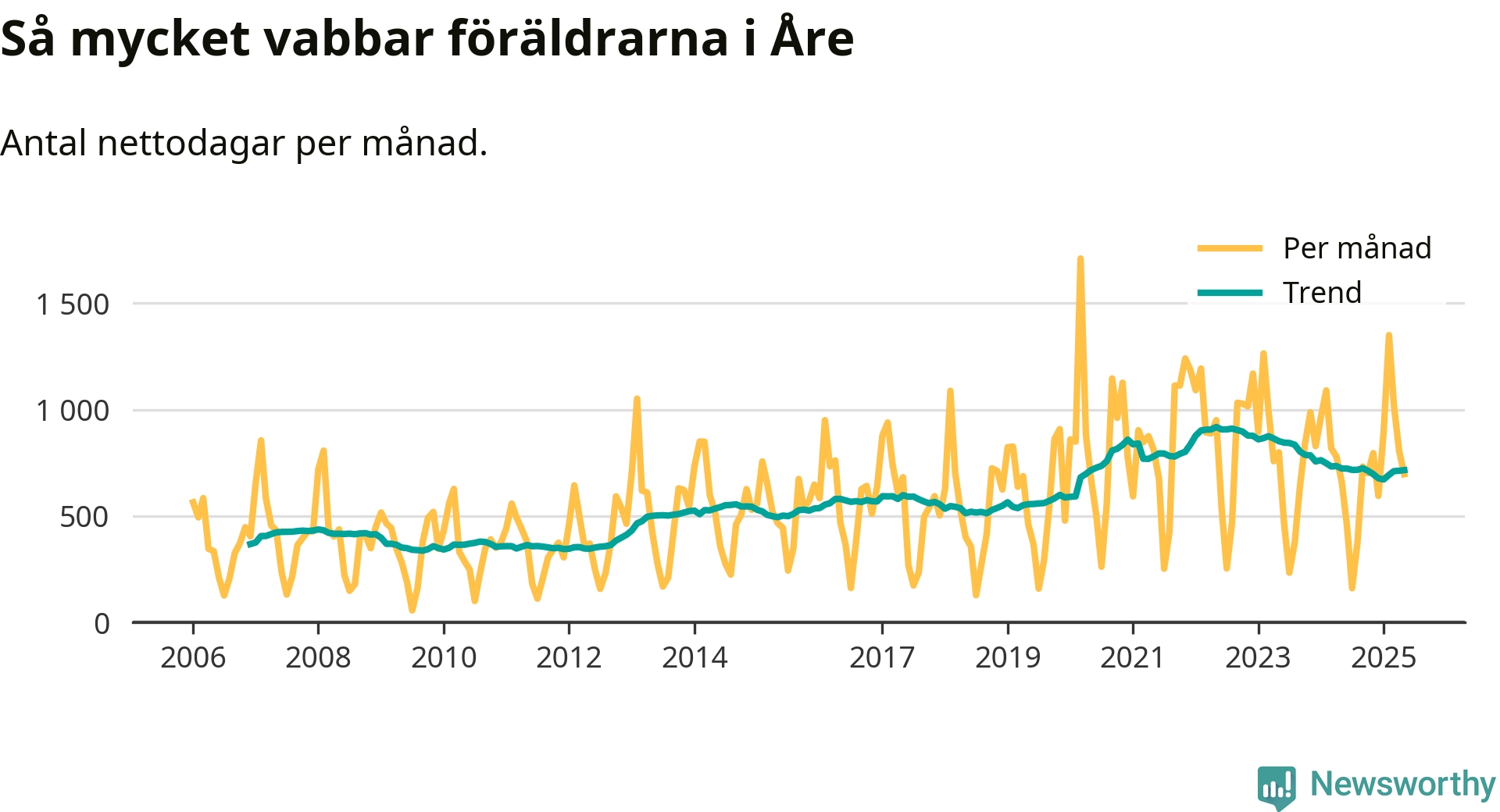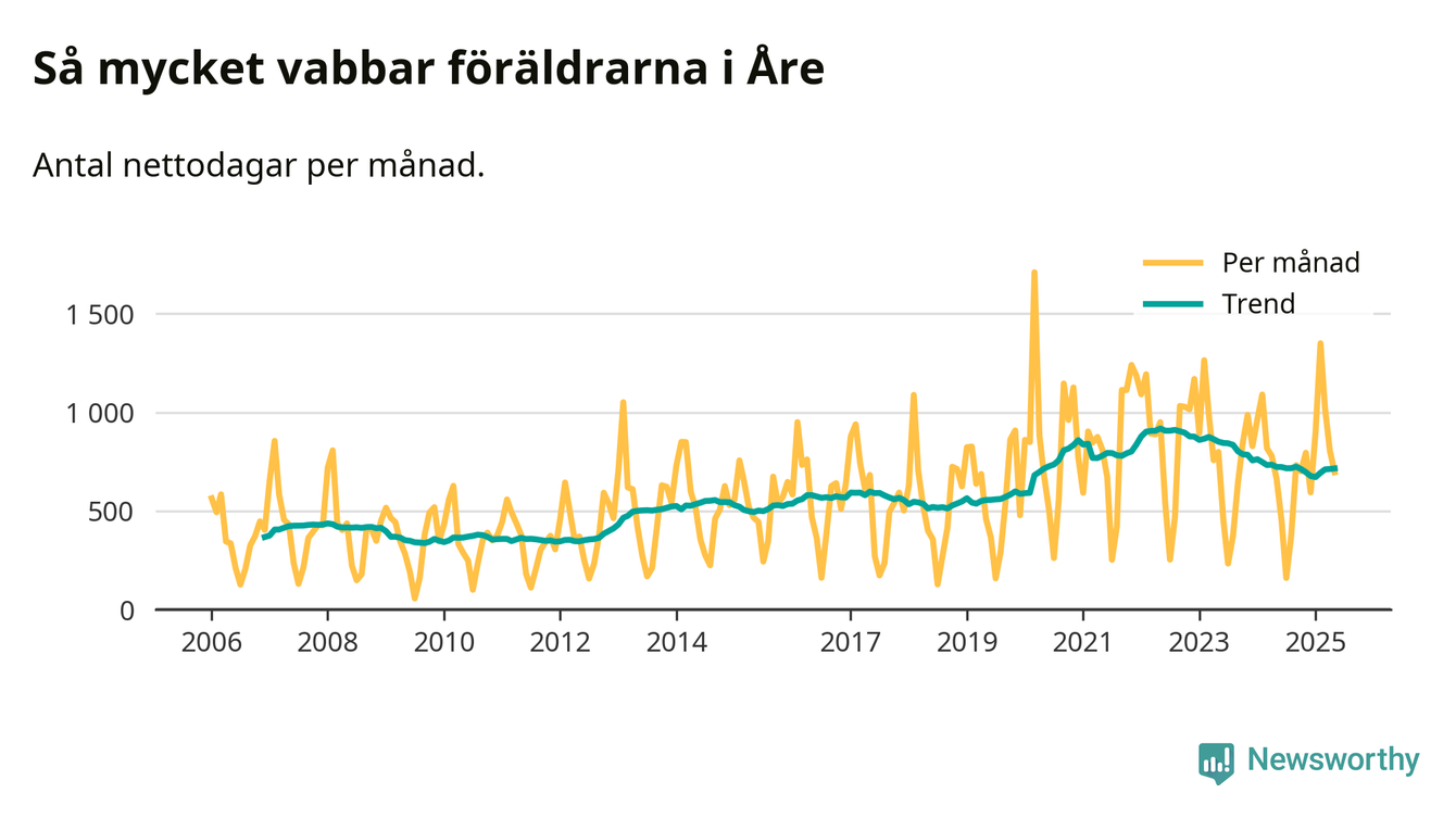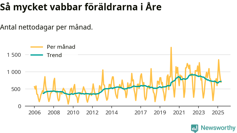 När coronapandemin drog in i mars 2020 peakade antalet vabbdagar både i Åre kommun och i riket som helhet. Under de senaste två åren har vabbuttaget börjat minska igen.