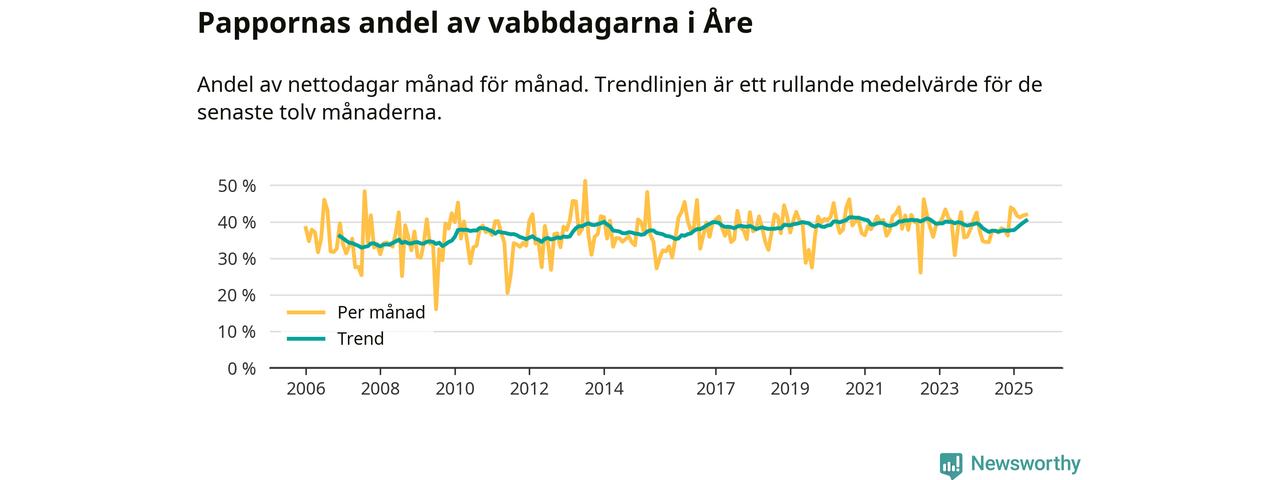 Åre ligger en bit från ett jämställt uttag. Under de senaste tolv månaderna har männen stått för 40 procent av all vabb i kommunen.
