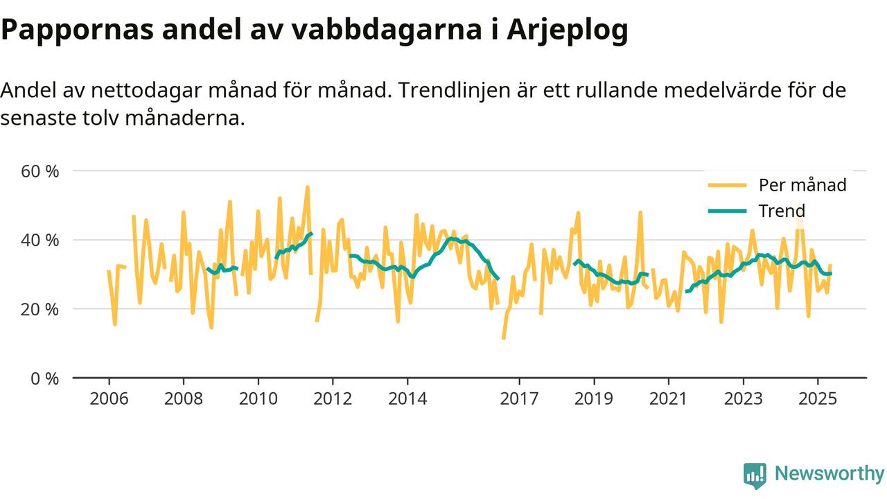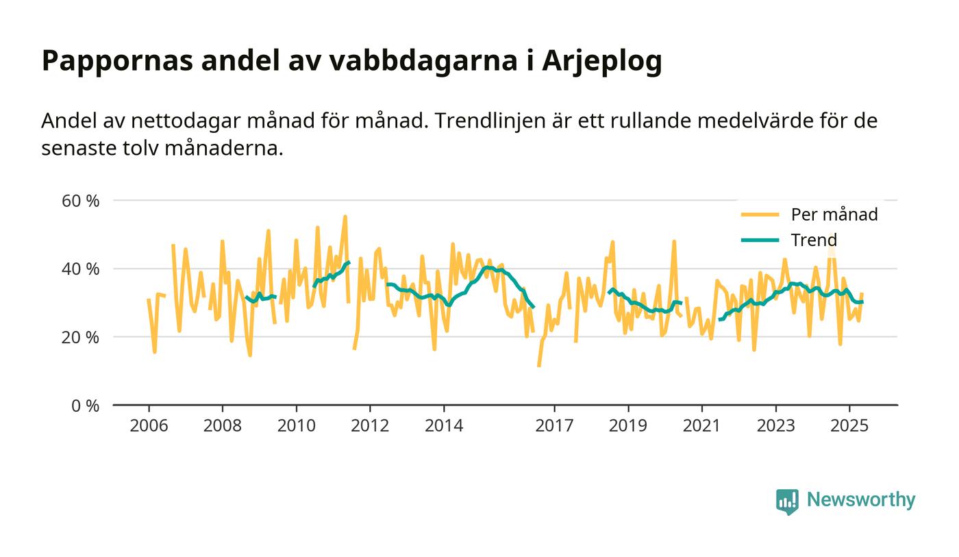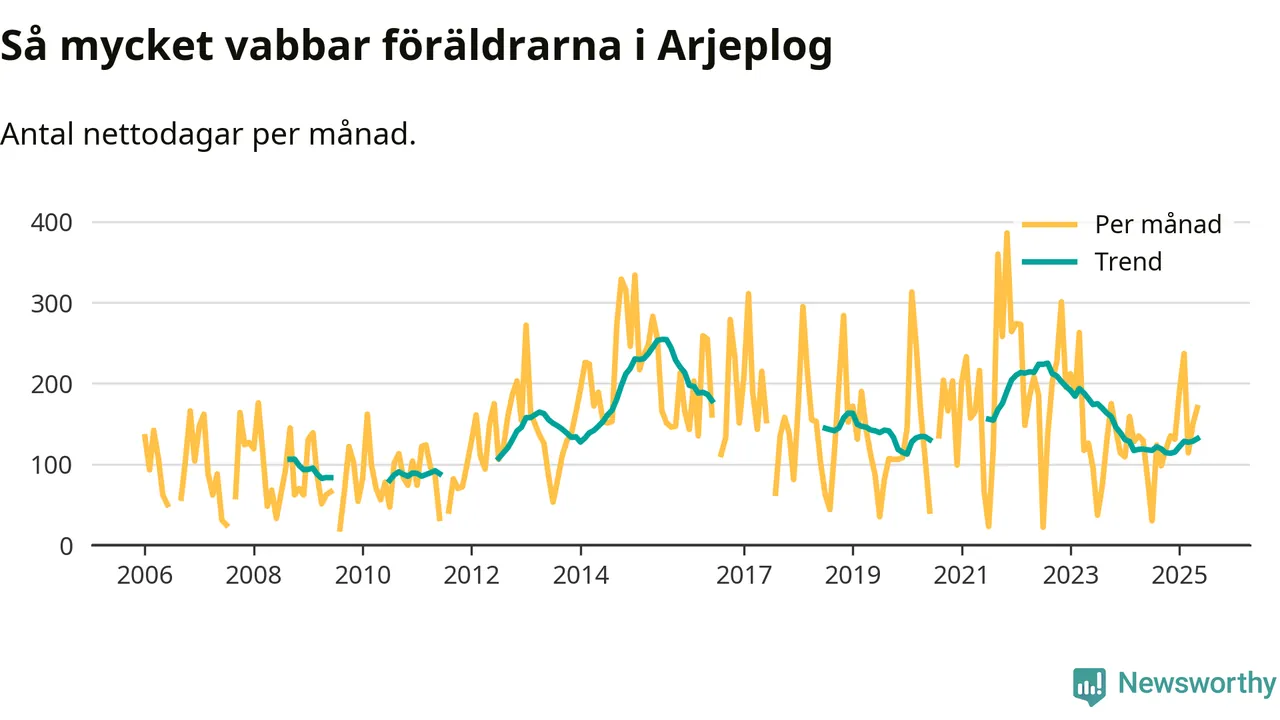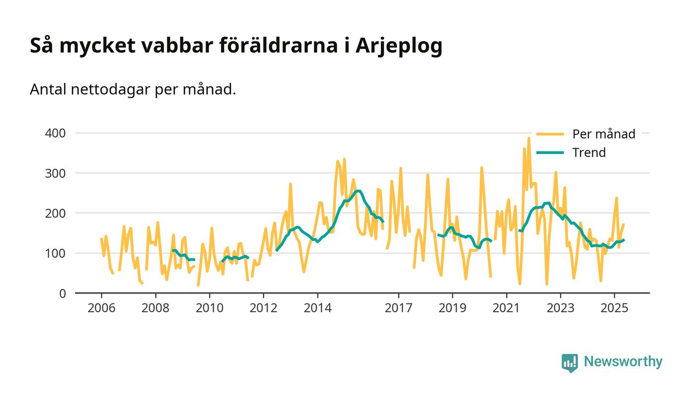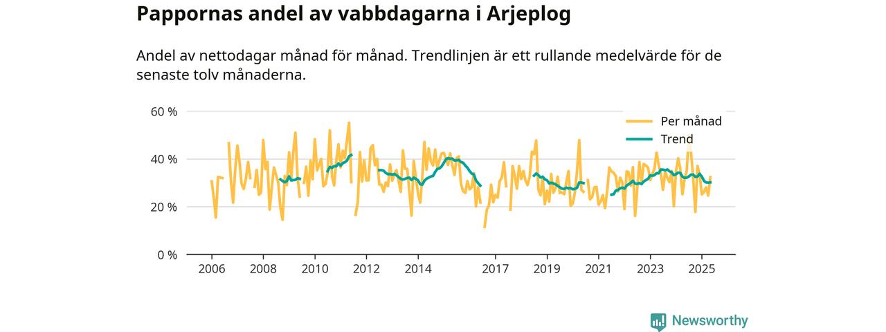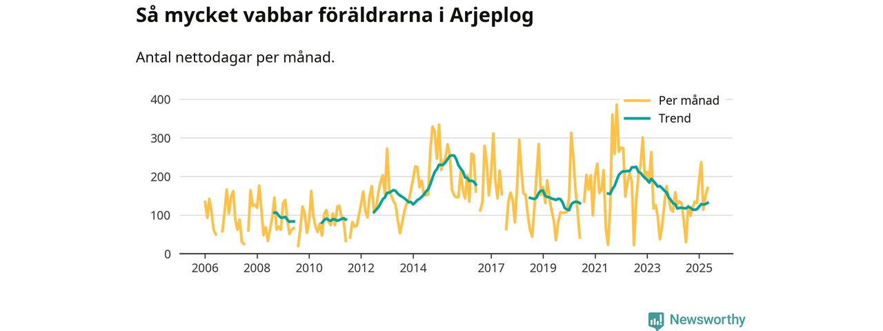 Arjeplog ligger en bra bit från ett jämställt uttag. Under de senaste tolv månaderna har männen stått för 30 procent av all vabb i kommunen. Pappornas uttag peakade sommaren 2011 då kommunens fäder var uppe i 42 procent av vabbdagarna 1.