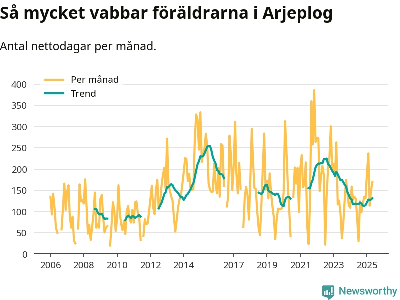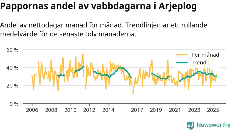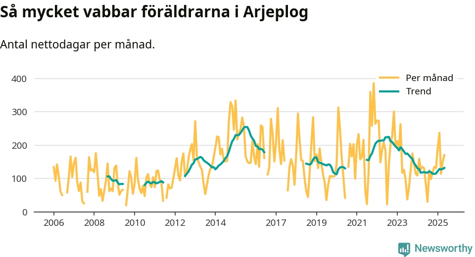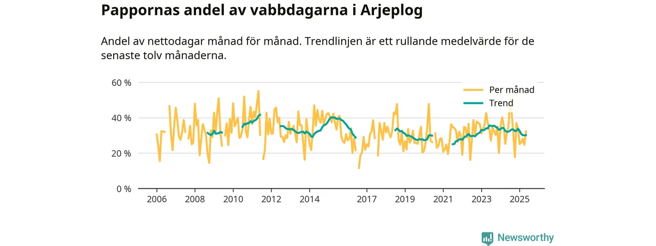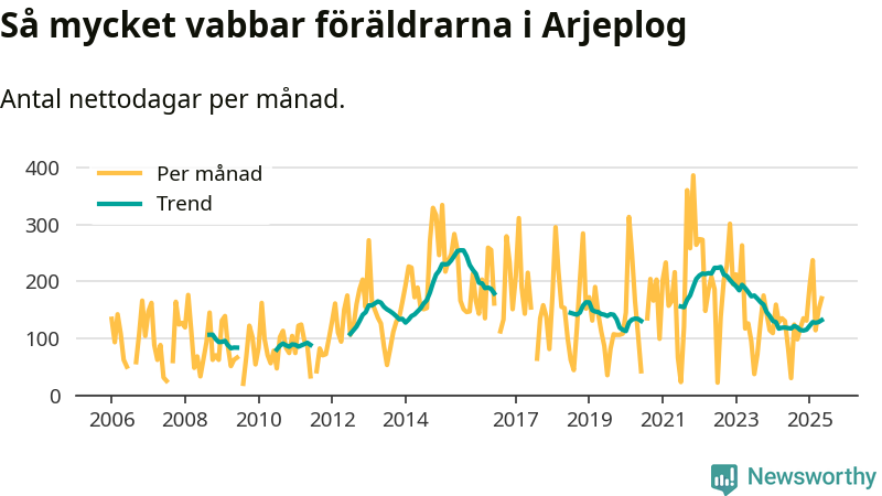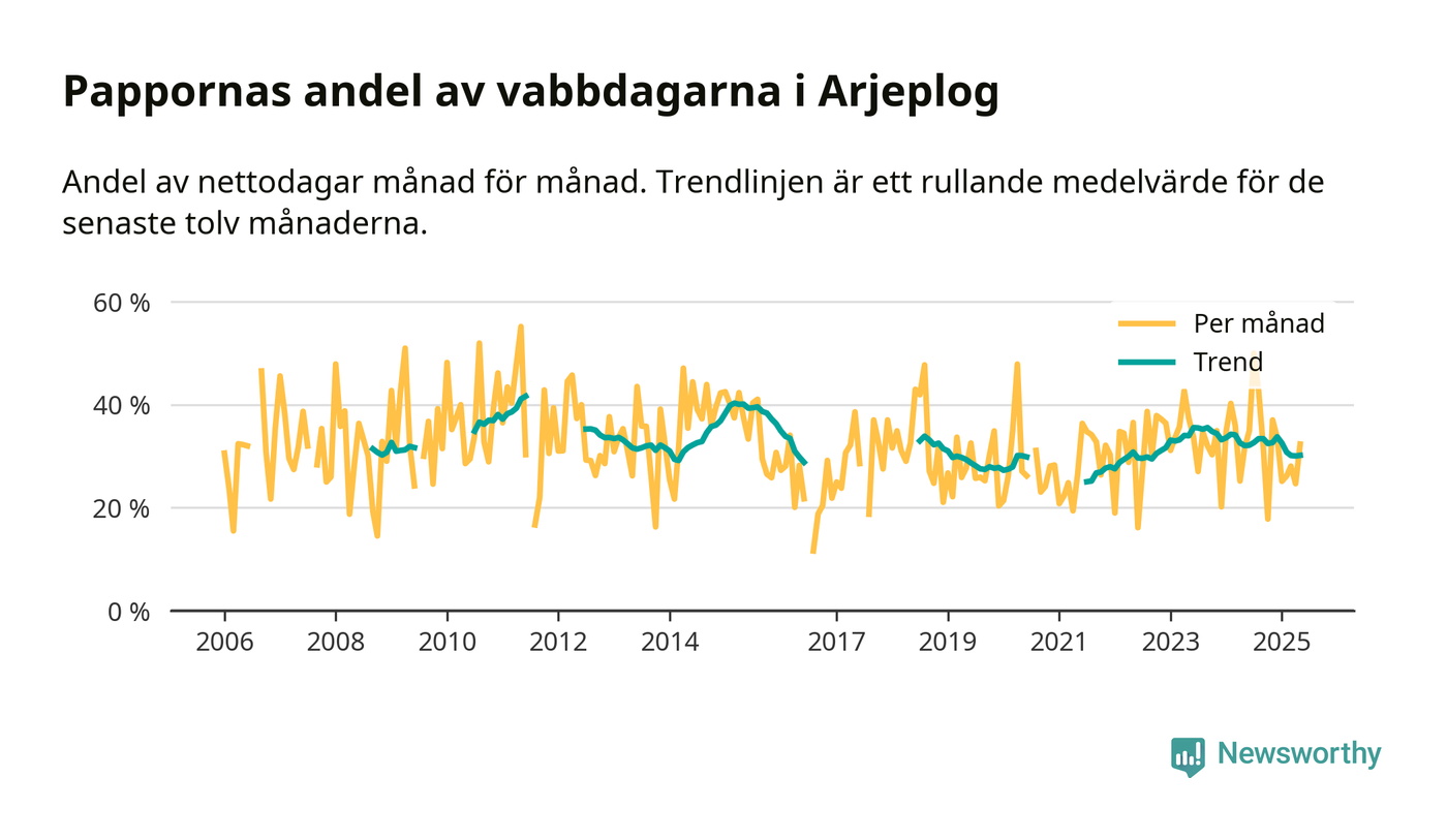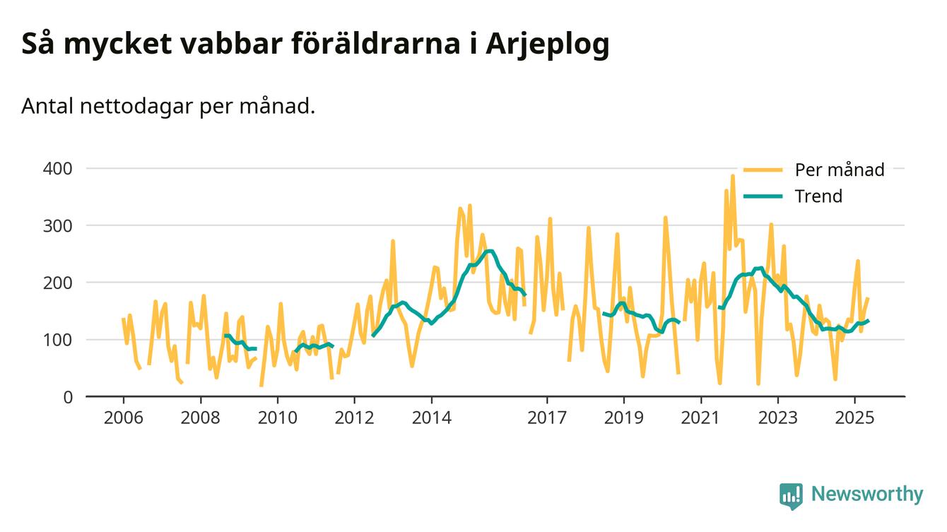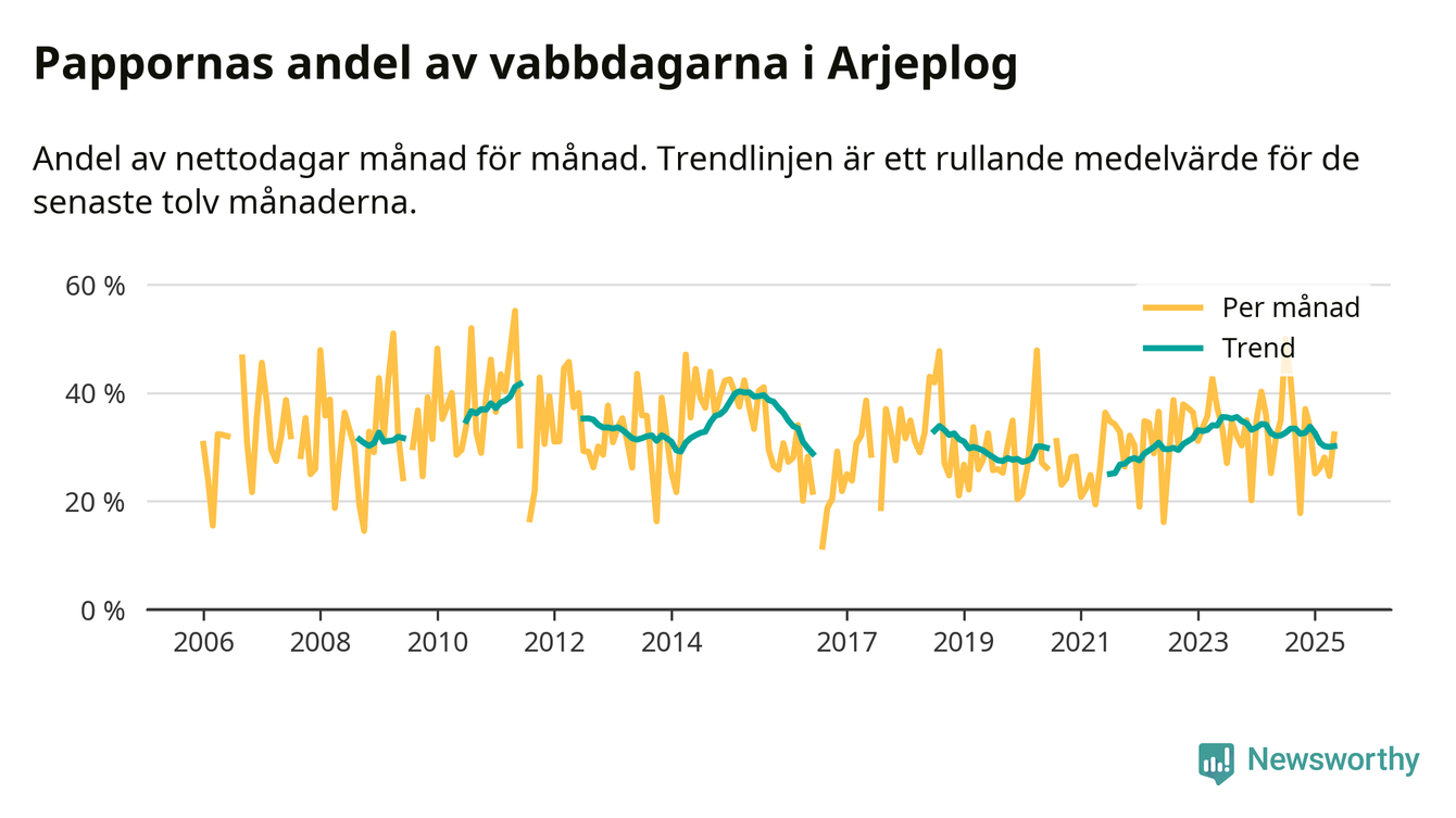 Arjeplog ligger en bra bit från ett jämställt uttag. Under de senaste tolv månaderna har männen stått för 30 procent av all vabb i kommunen. Pappornas uttag peakade sommaren 2011 då kommunens fäder var uppe i 42 procent av vabbdagarna 1.
