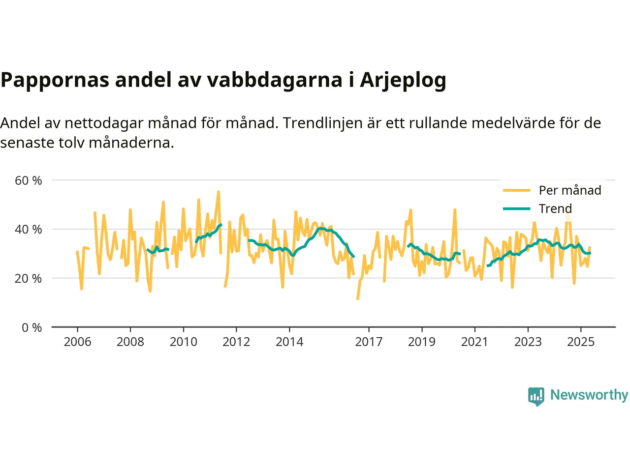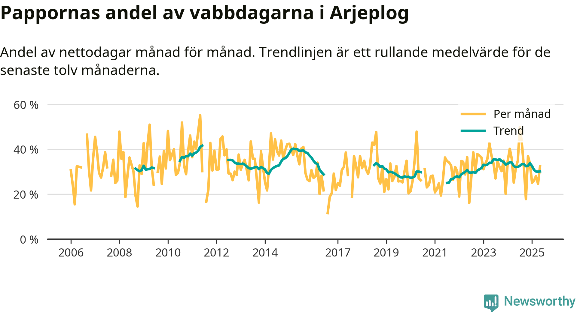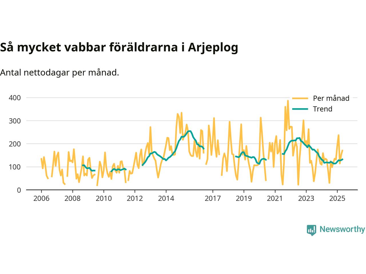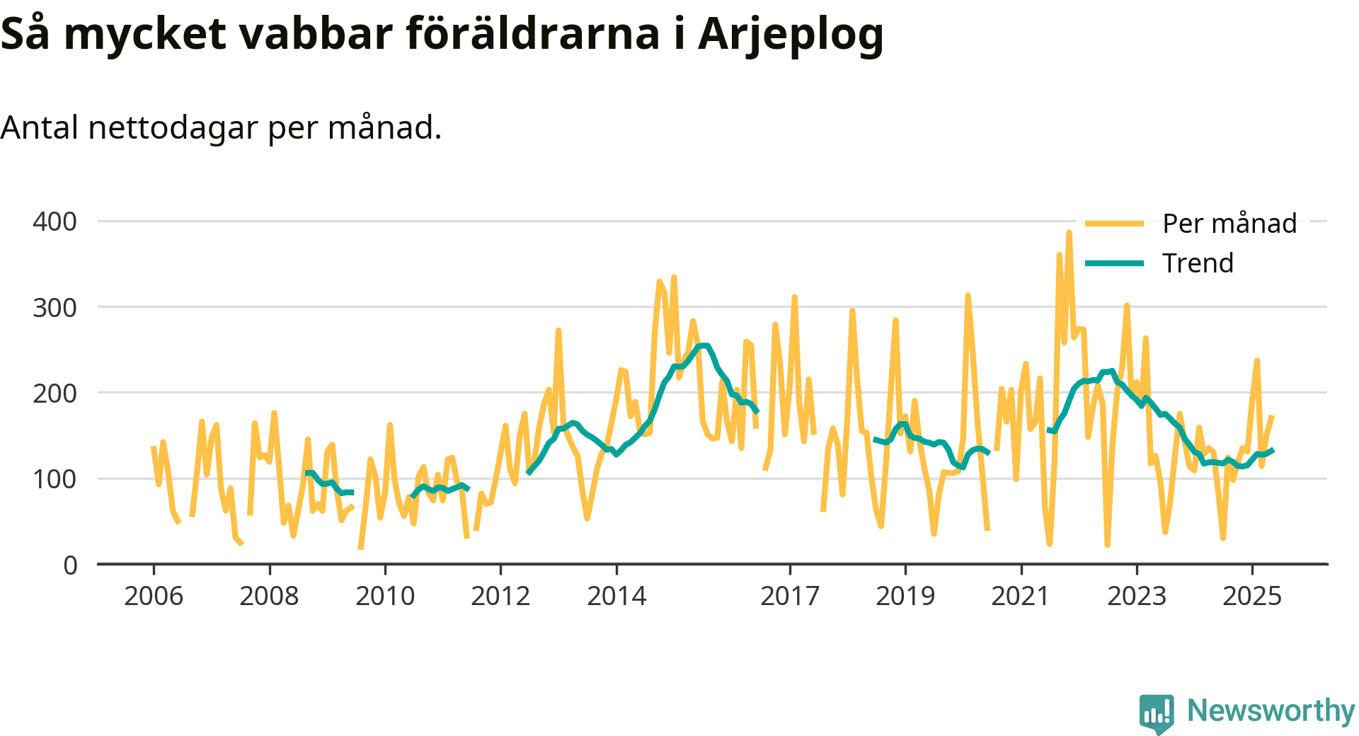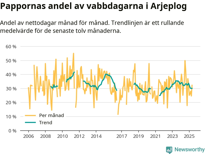 Arjeplog ligger en bra bit från ett jämställt uttag. Under de senaste tolv månaderna har männen stått för 30 procent av all vabb i kommunen. Pappornas uttag peakade sommaren 2011 då kommunens fäder var uppe i 42 procent av vabbdagarna 1.