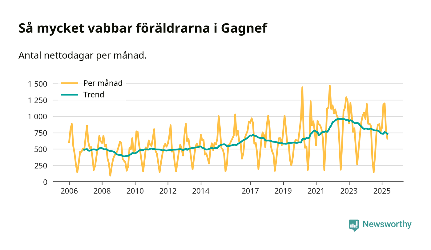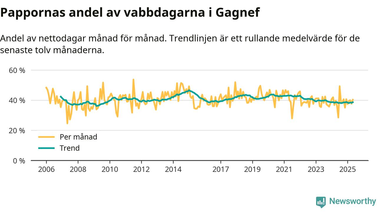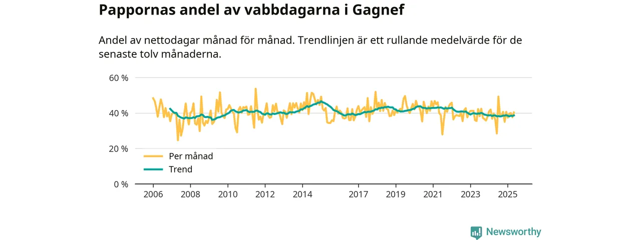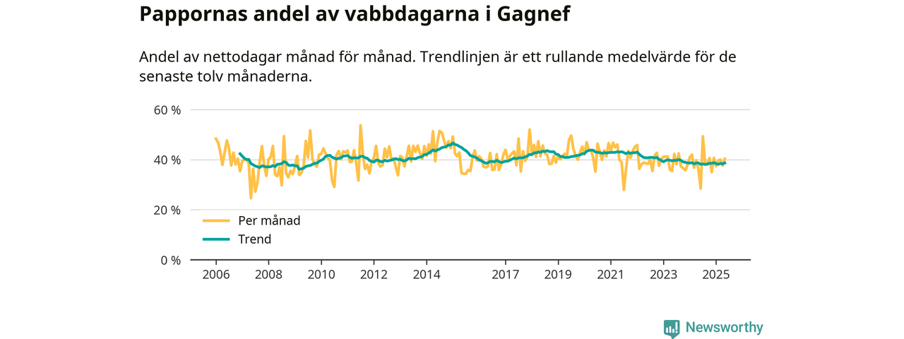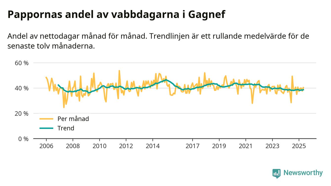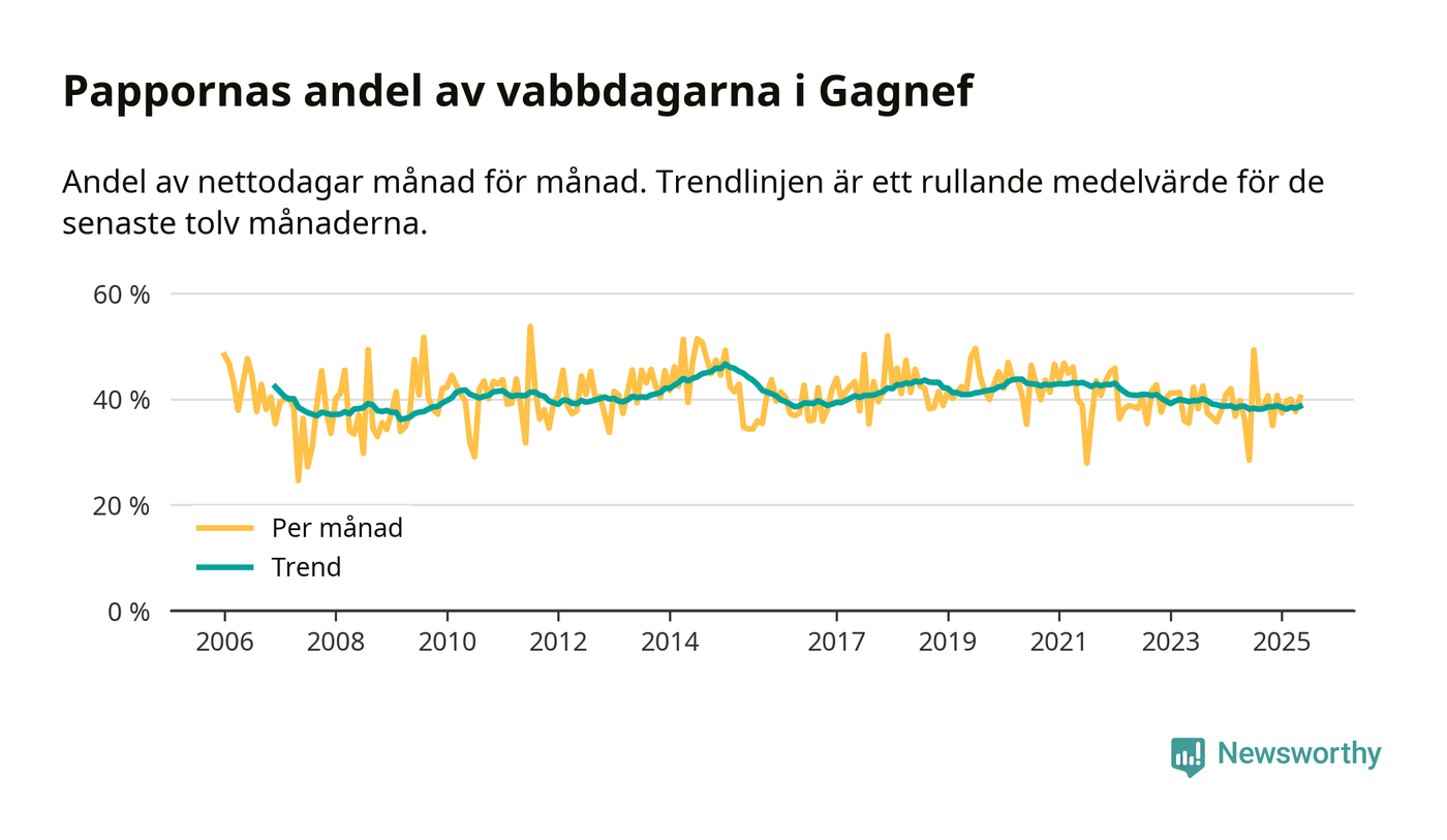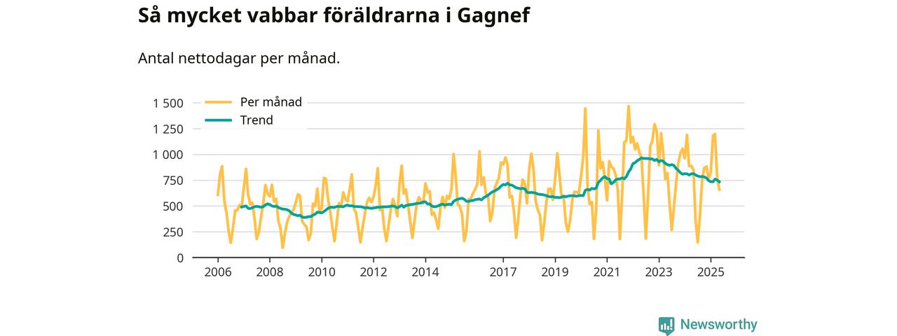 Gagnef ligger en bit från ett jämställt uttag. Under de senaste tolv månaderna har männen stått för 39 procent av all vabb i kommunen. Pappornas uttag peakade vintern 2015 då kommunens fäder var uppe i 47 procent av vabbdagarna 1.