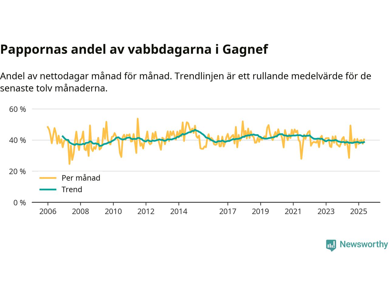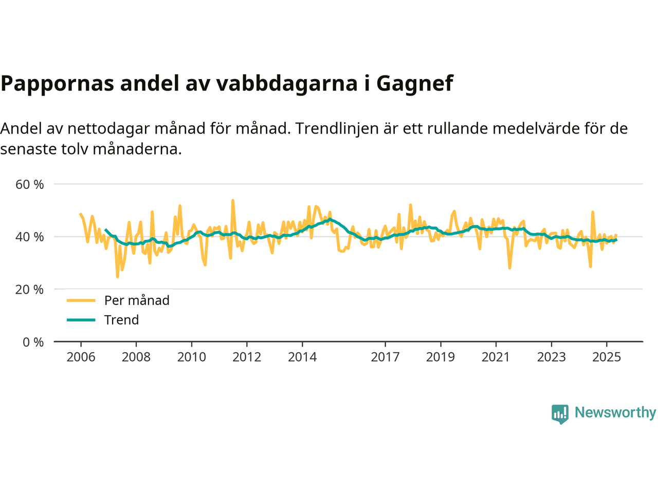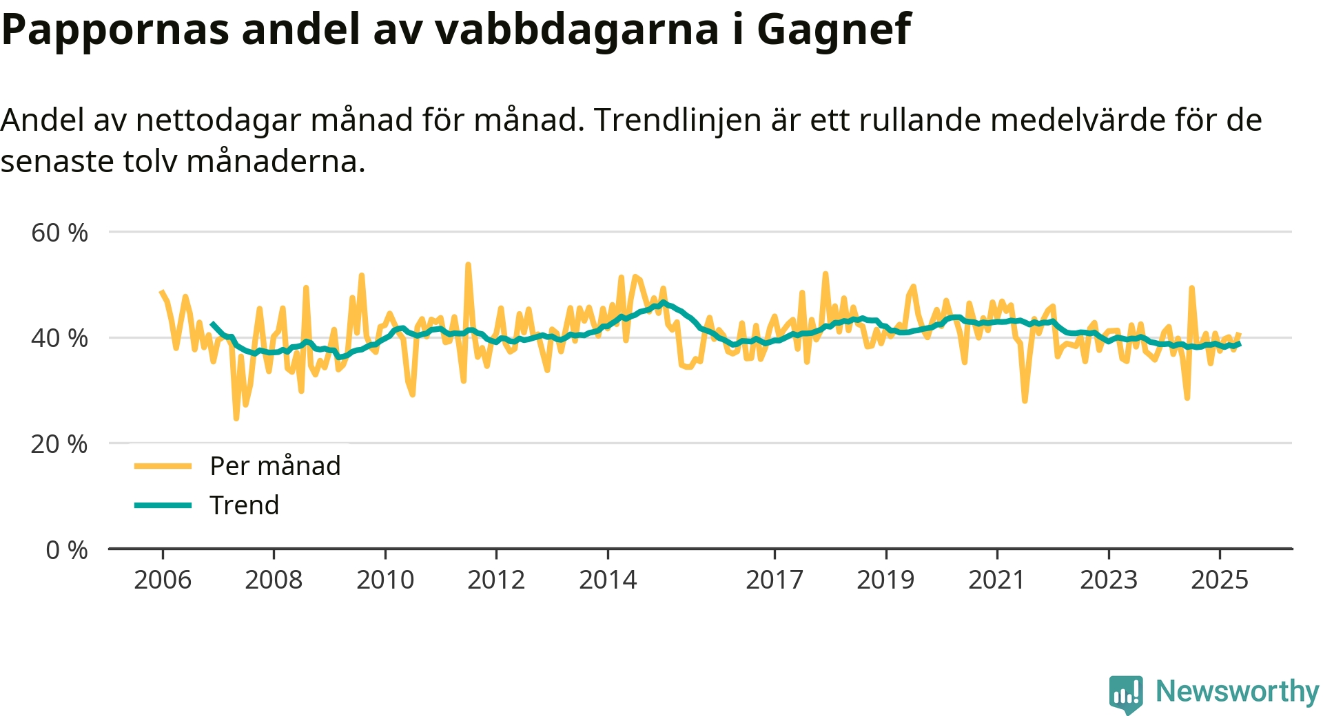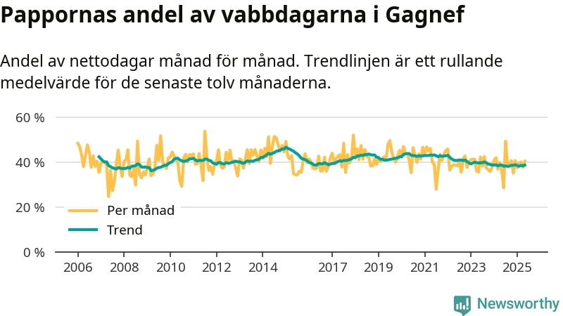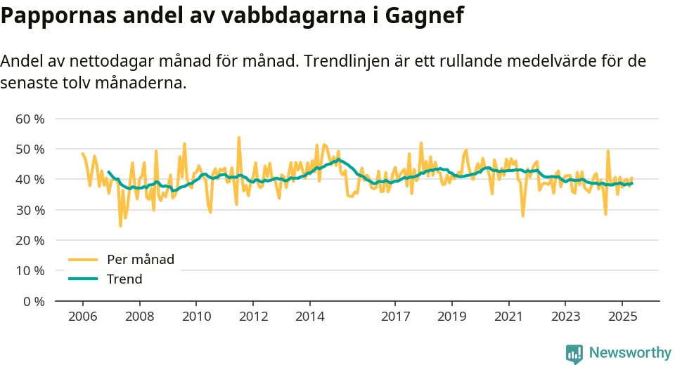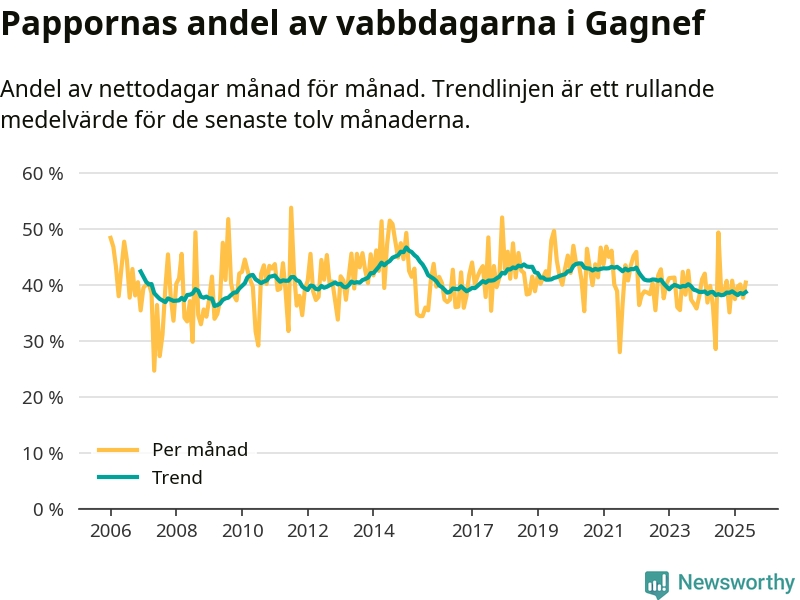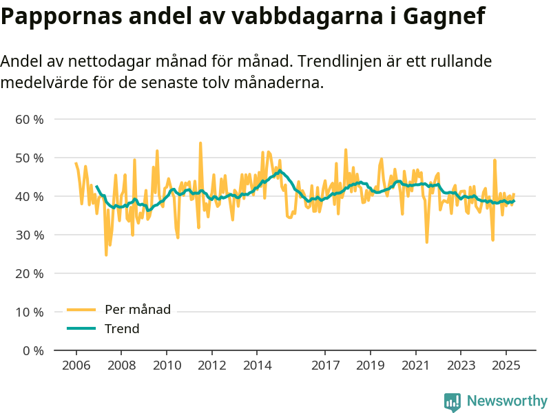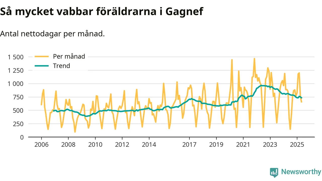 Gagnef ligger en bit från ett jämställt uttag. Under de senaste tolv månaderna har männen stått för 39 procent av all vabb i kommunen. Pappornas uttag peakade vintern 2015 då kommunens fäder var uppe i 47 procent av vabbdagarna 1.