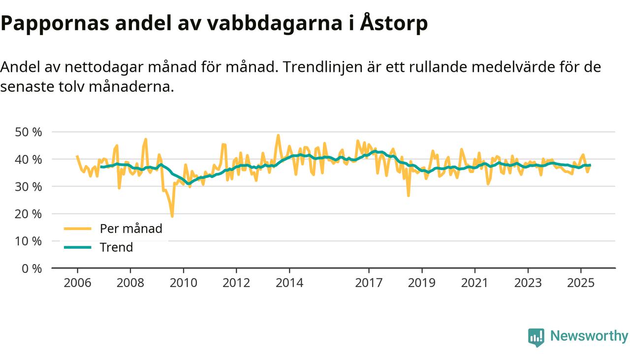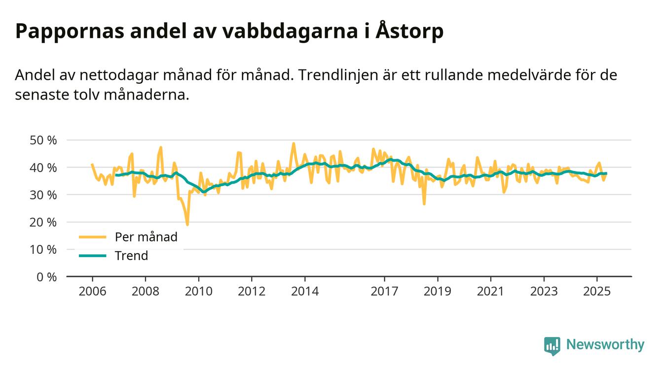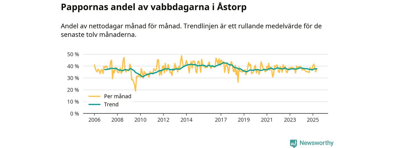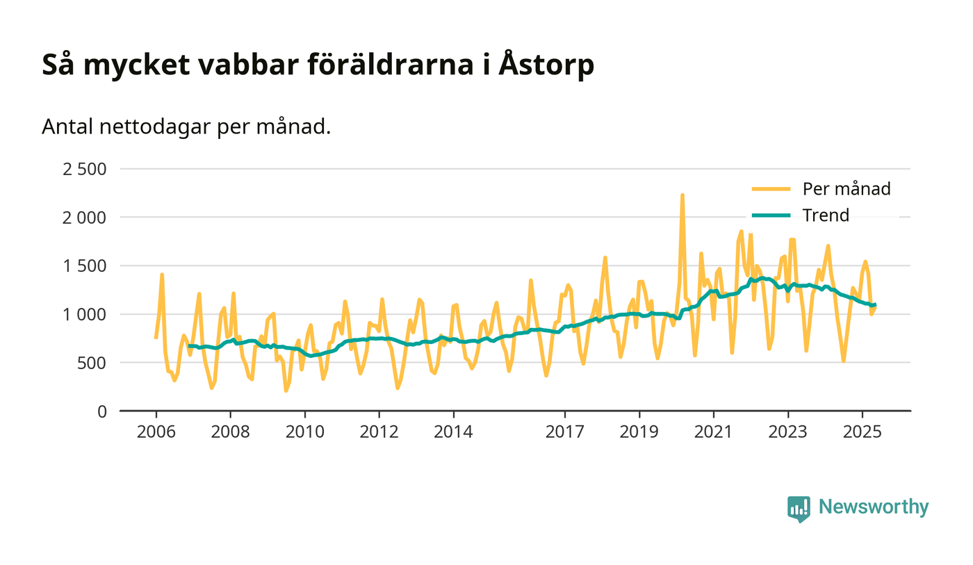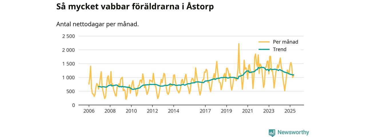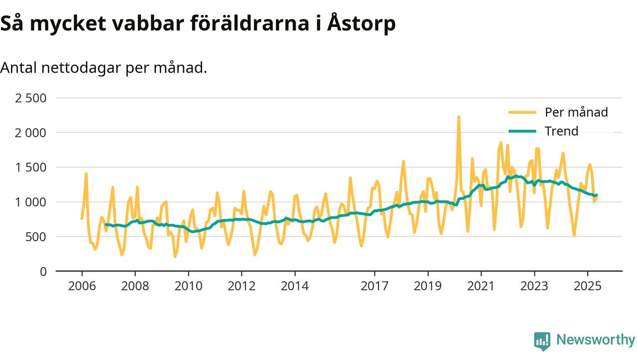 Åstorp ligger en bit från ett jämställt uttag. Under de senaste tolv månaderna har männen stått för 38 procent av all vabb i kommunen. Pappornas uttag peakade våren 2017 då kommunens fäder var uppe i 43 procent av vabbdagarna 1.