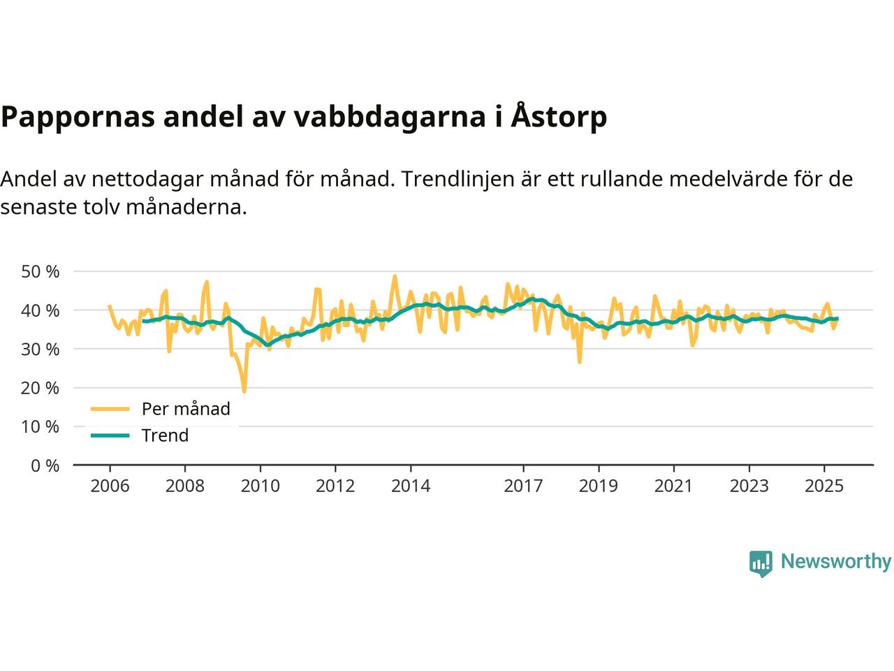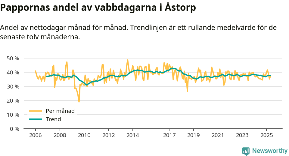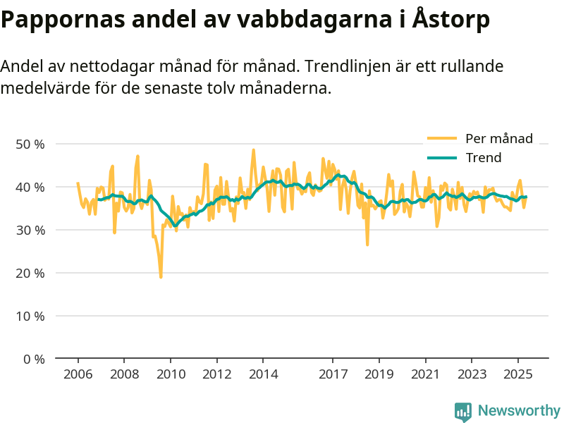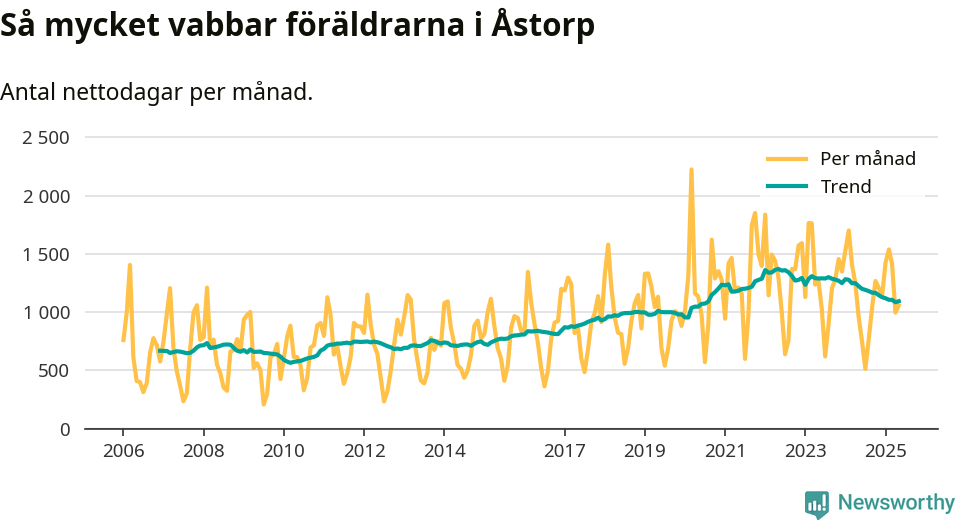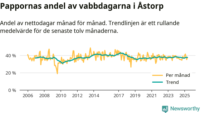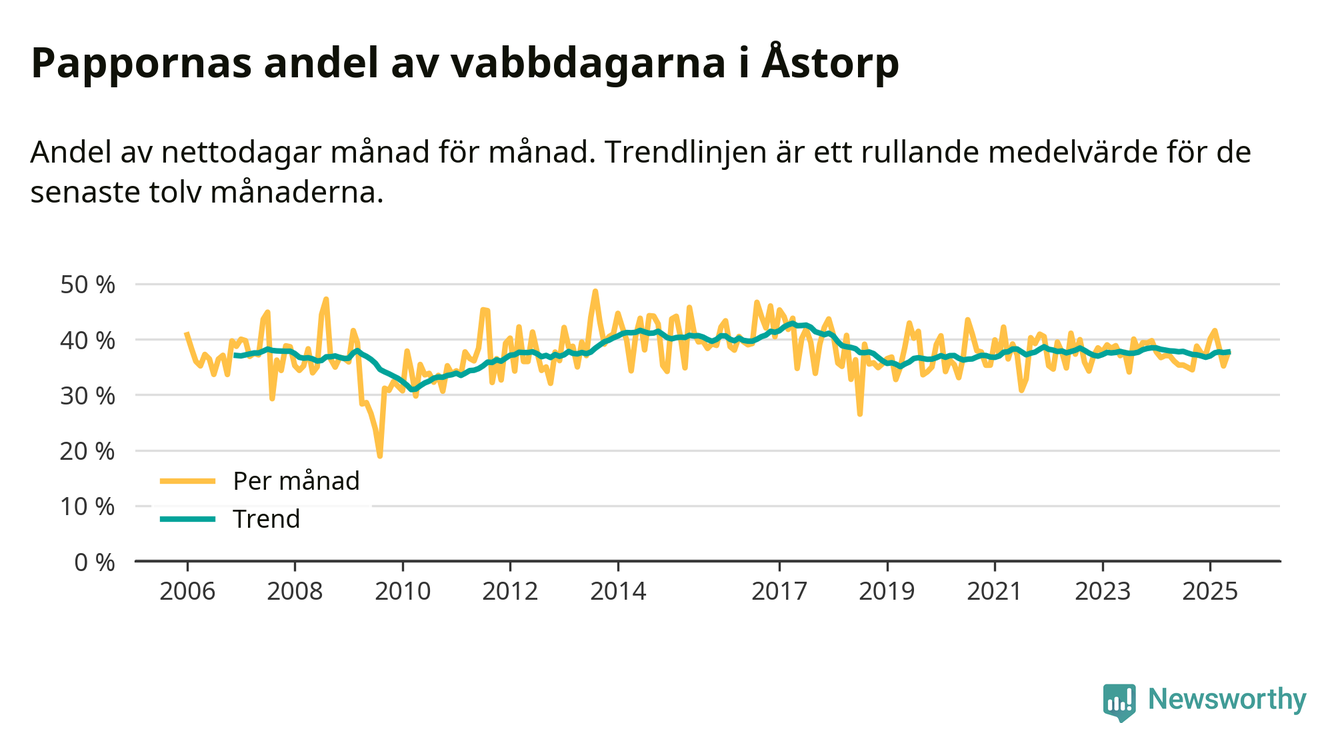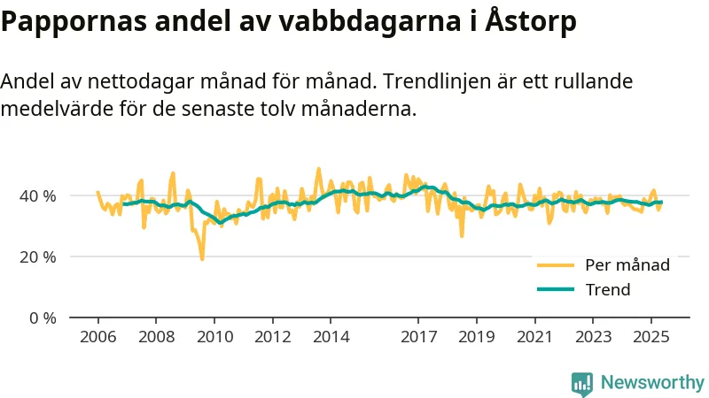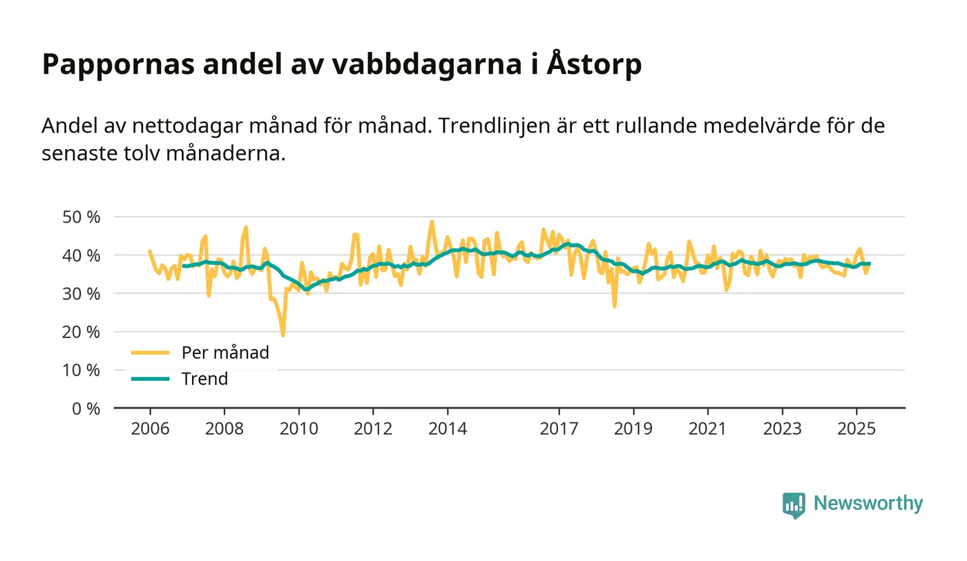 Åstorp ligger en bit från ett jämställt uttag. Under de senaste tolv månaderna har männen stått för 38 procent av all vabb i kommunen. Pappornas uttag peakade våren 2017 då kommunens fäder var uppe i 43 procent av vabbdagarna 1.