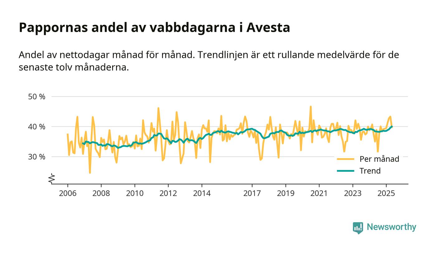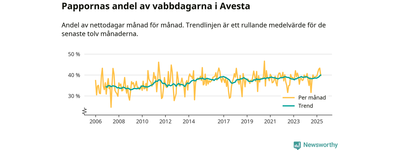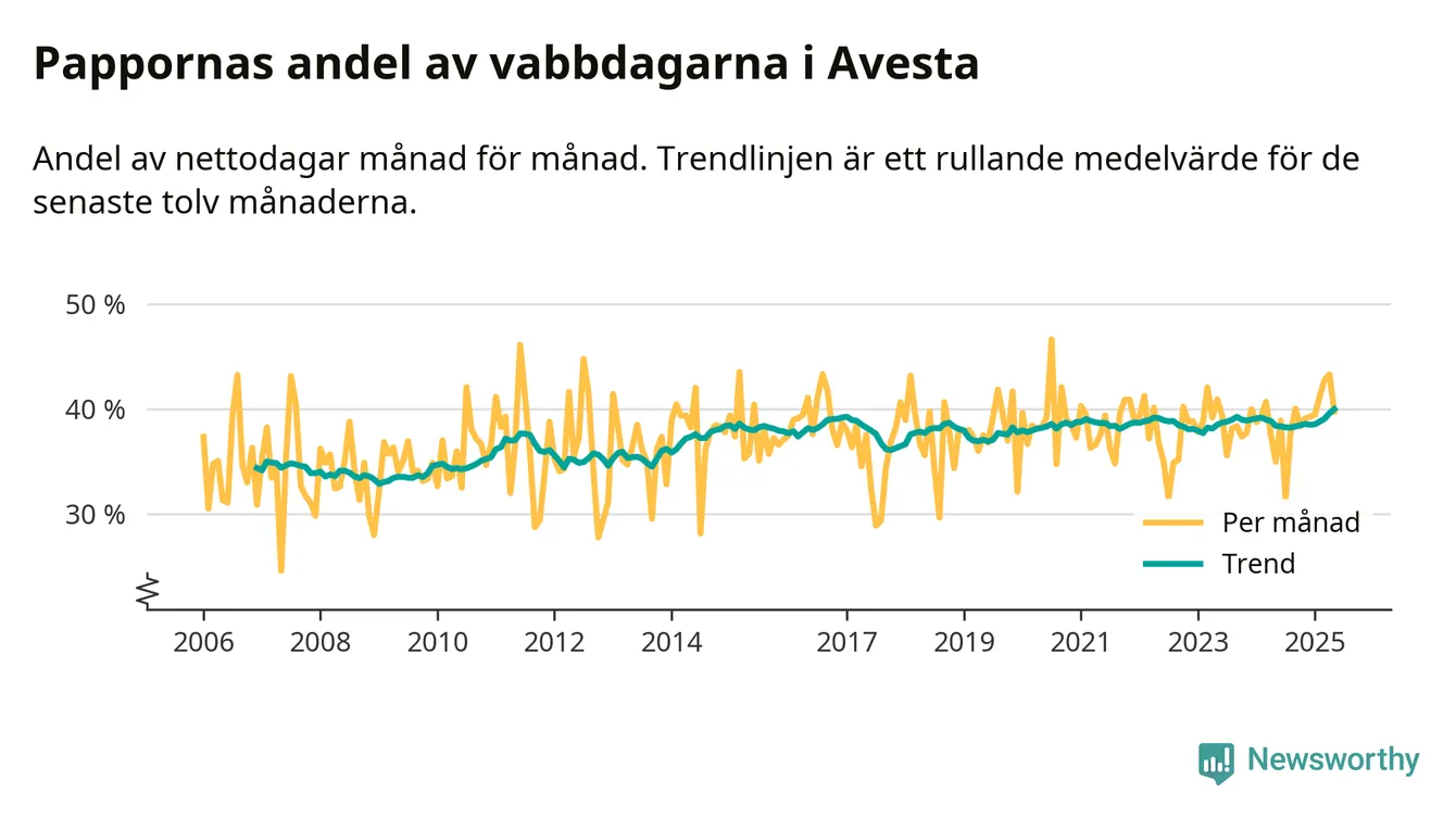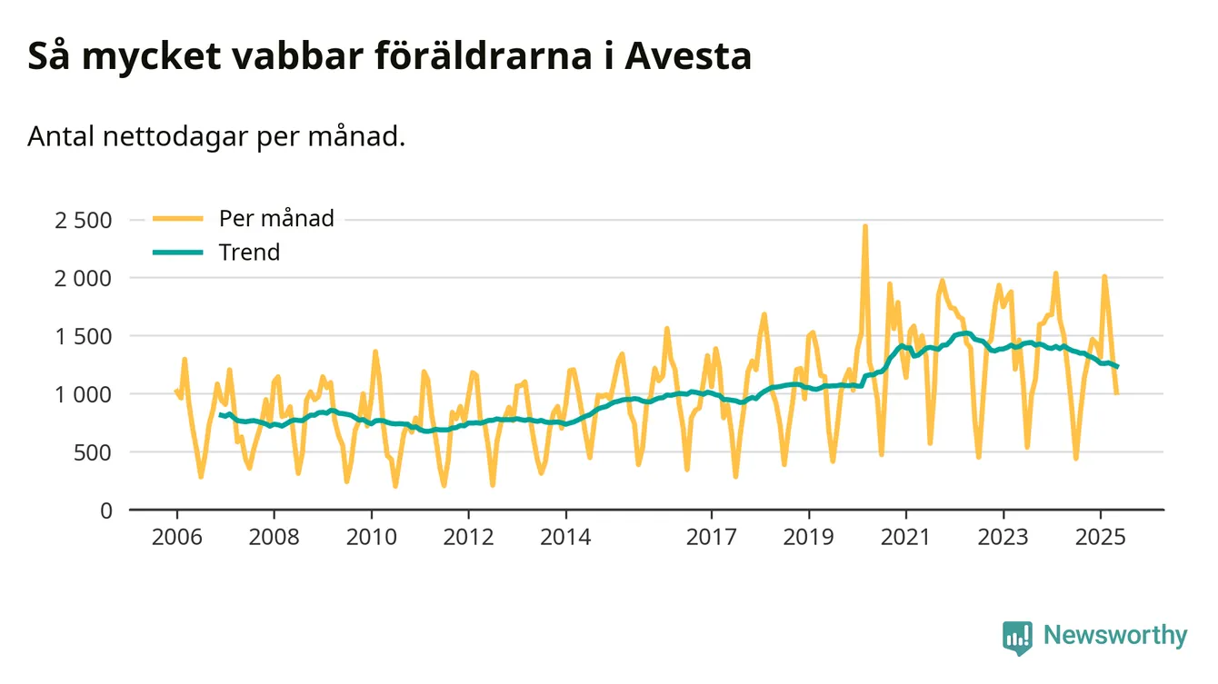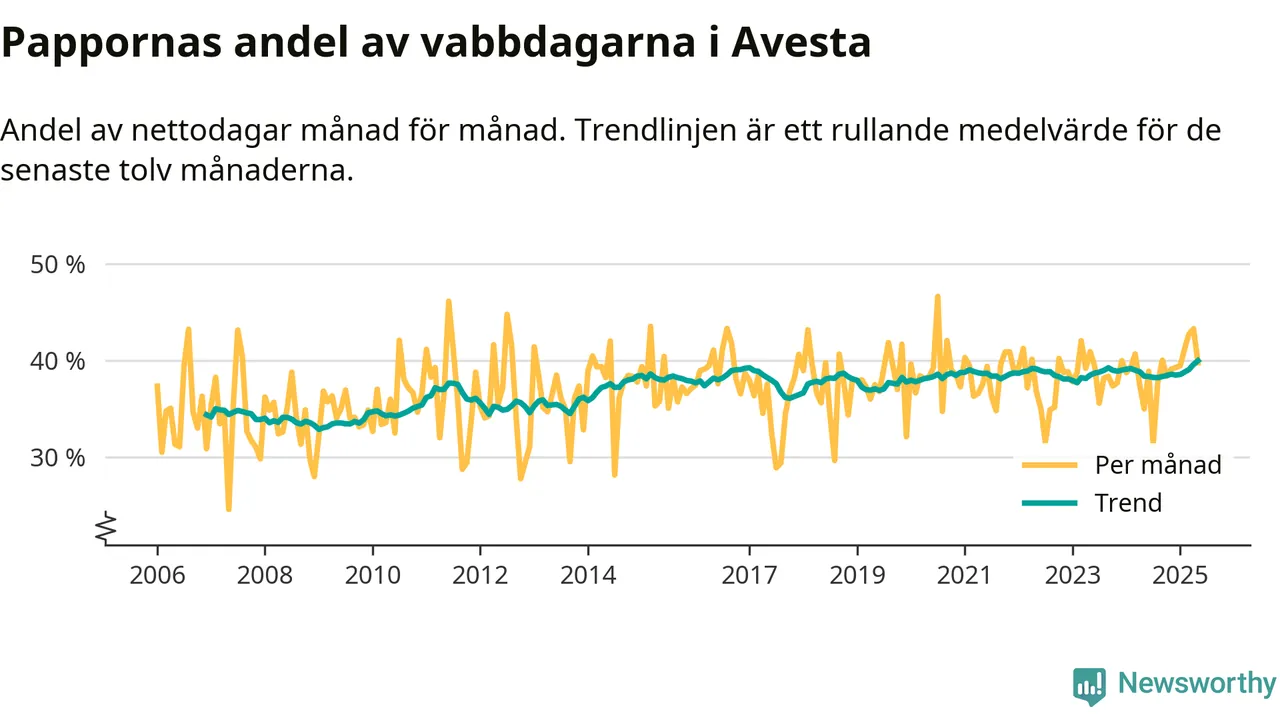 Avesta ligger en bit från ett jämställt uttag. Under de senaste tolv månaderna har männen stått för 40 procent av all vabb i kommunen. Det är ändåen historiskt hög andel, sett till de senaste två decennierna.