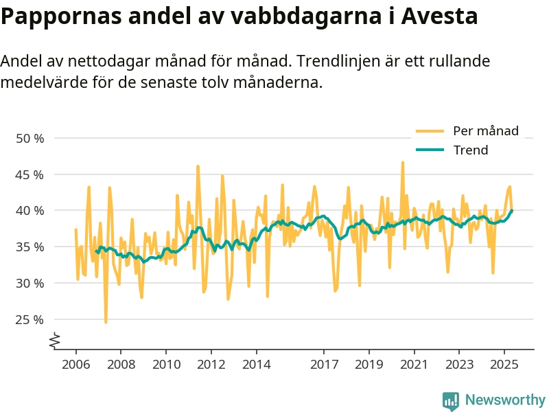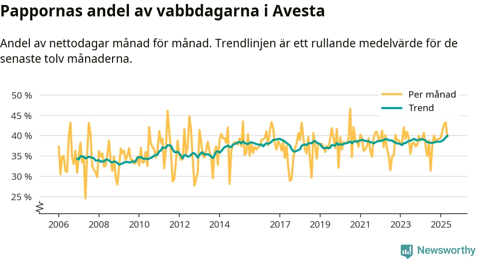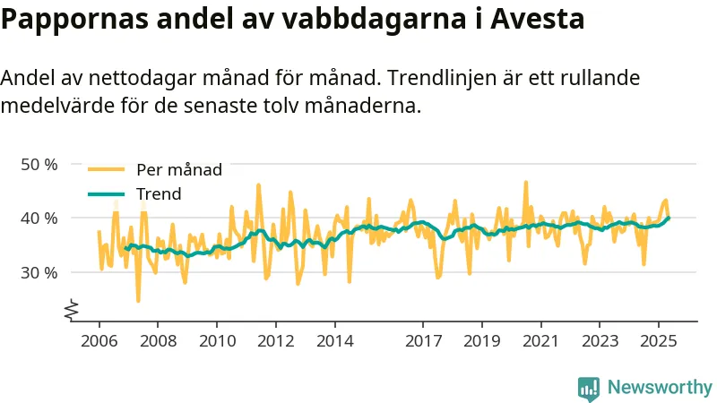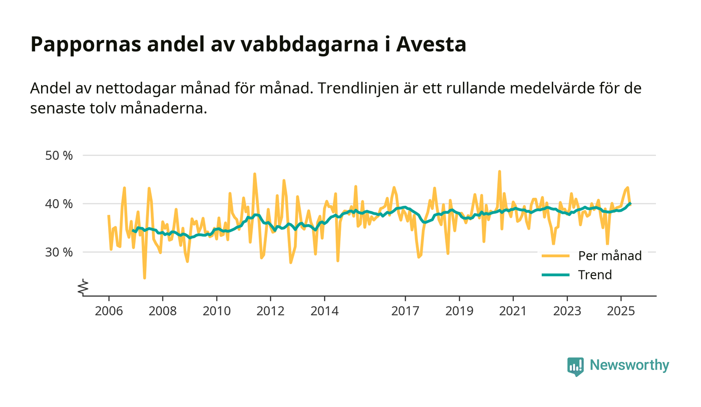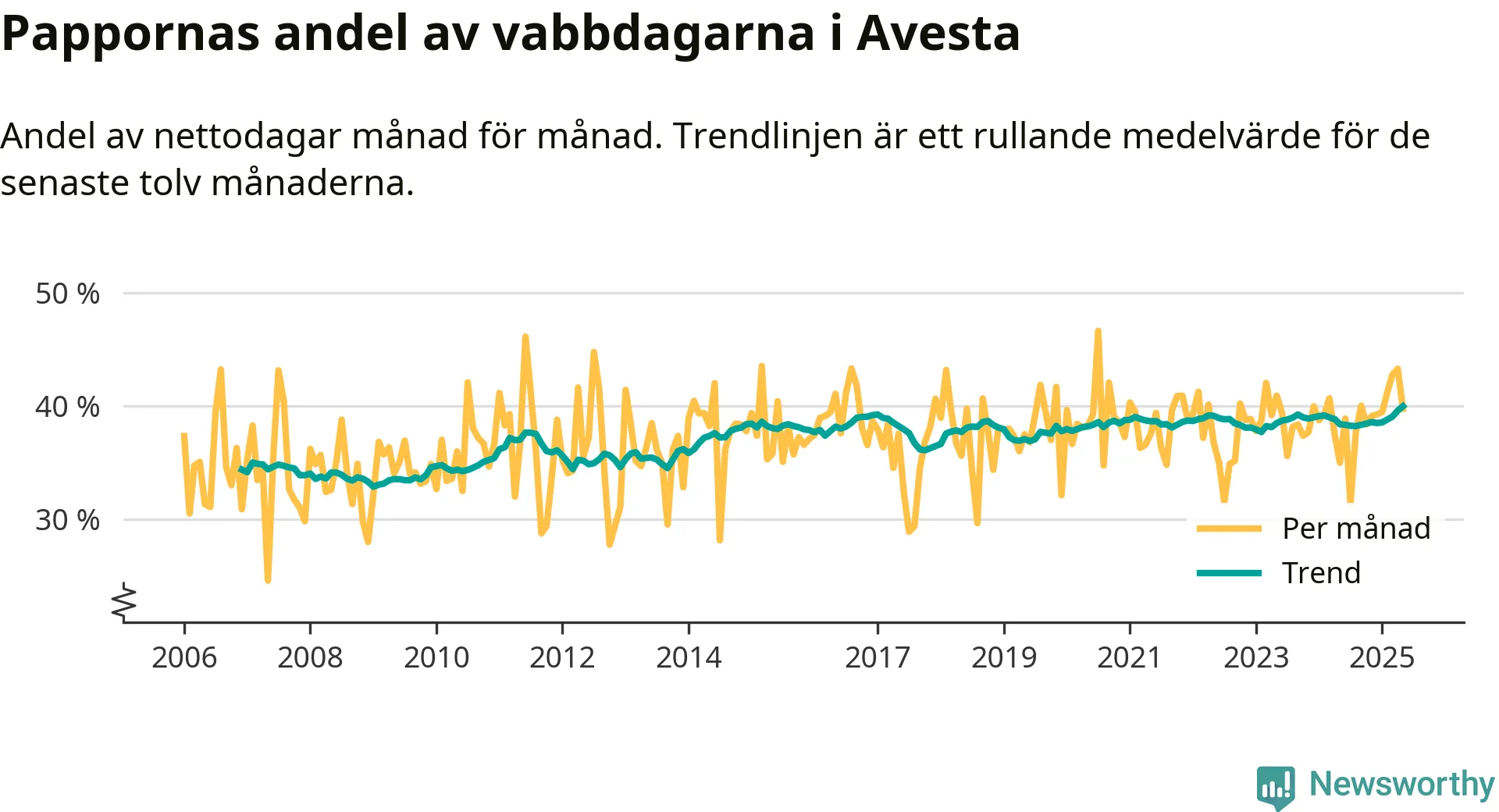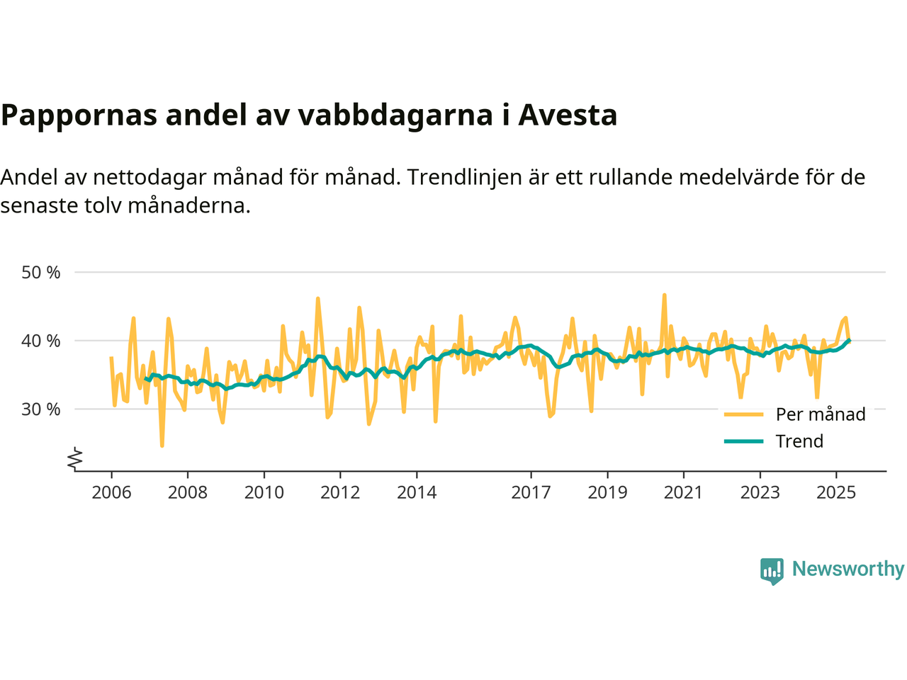 Avesta ligger en bit från ett jämställt uttag. Under de senaste tolv månaderna har männen stått för 40 procent av all vabb i kommunen. Det är ändåen historiskt hög andel, sett till de senaste två decennierna.