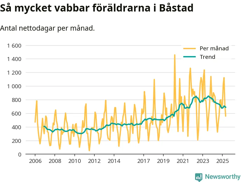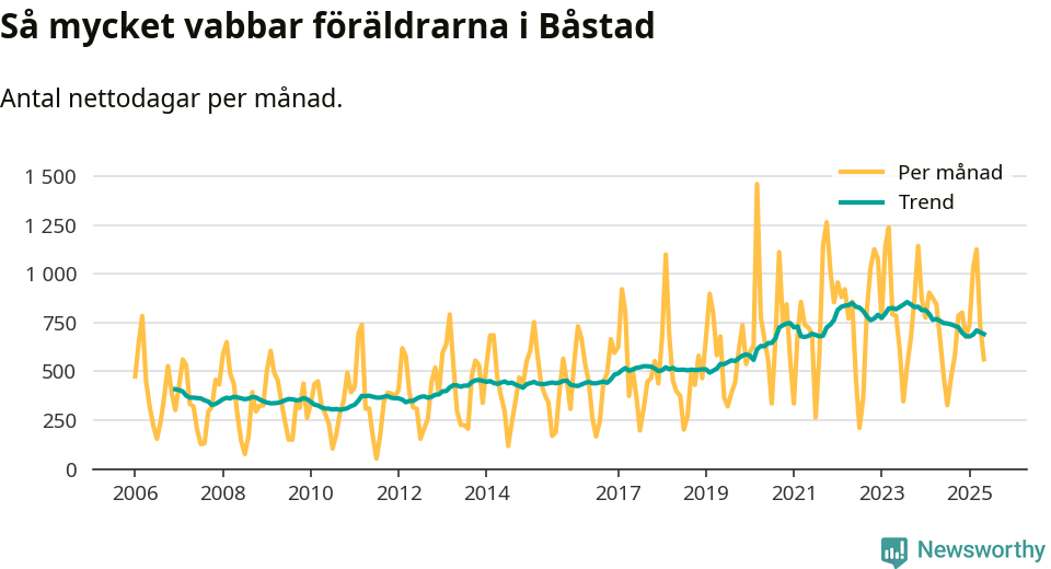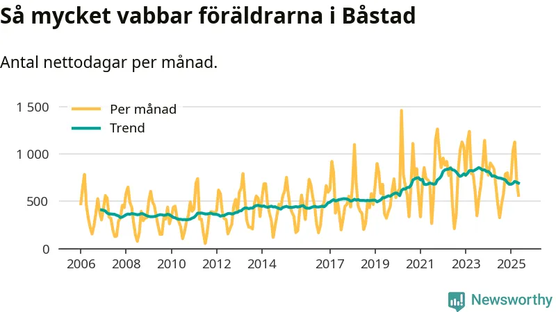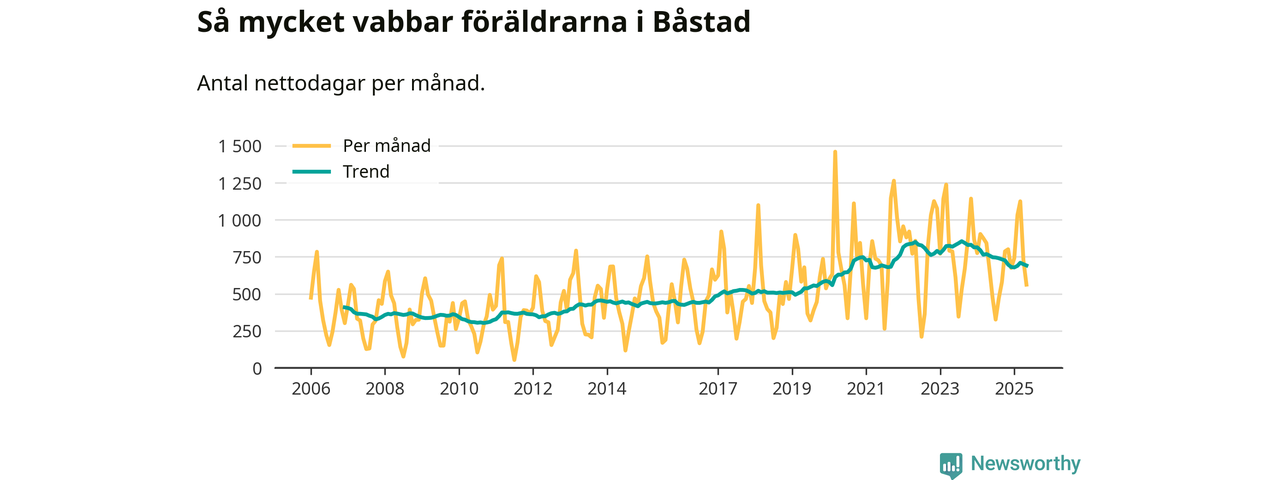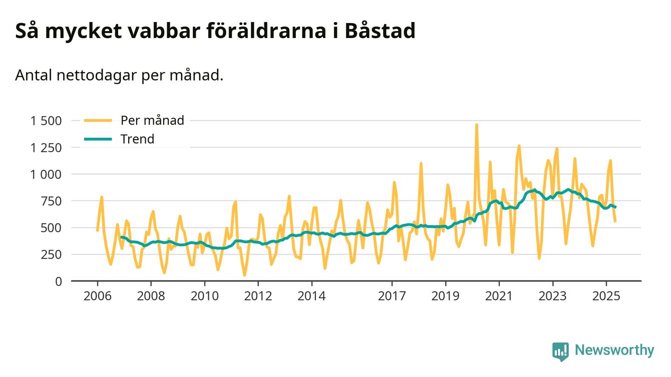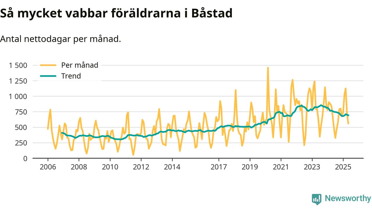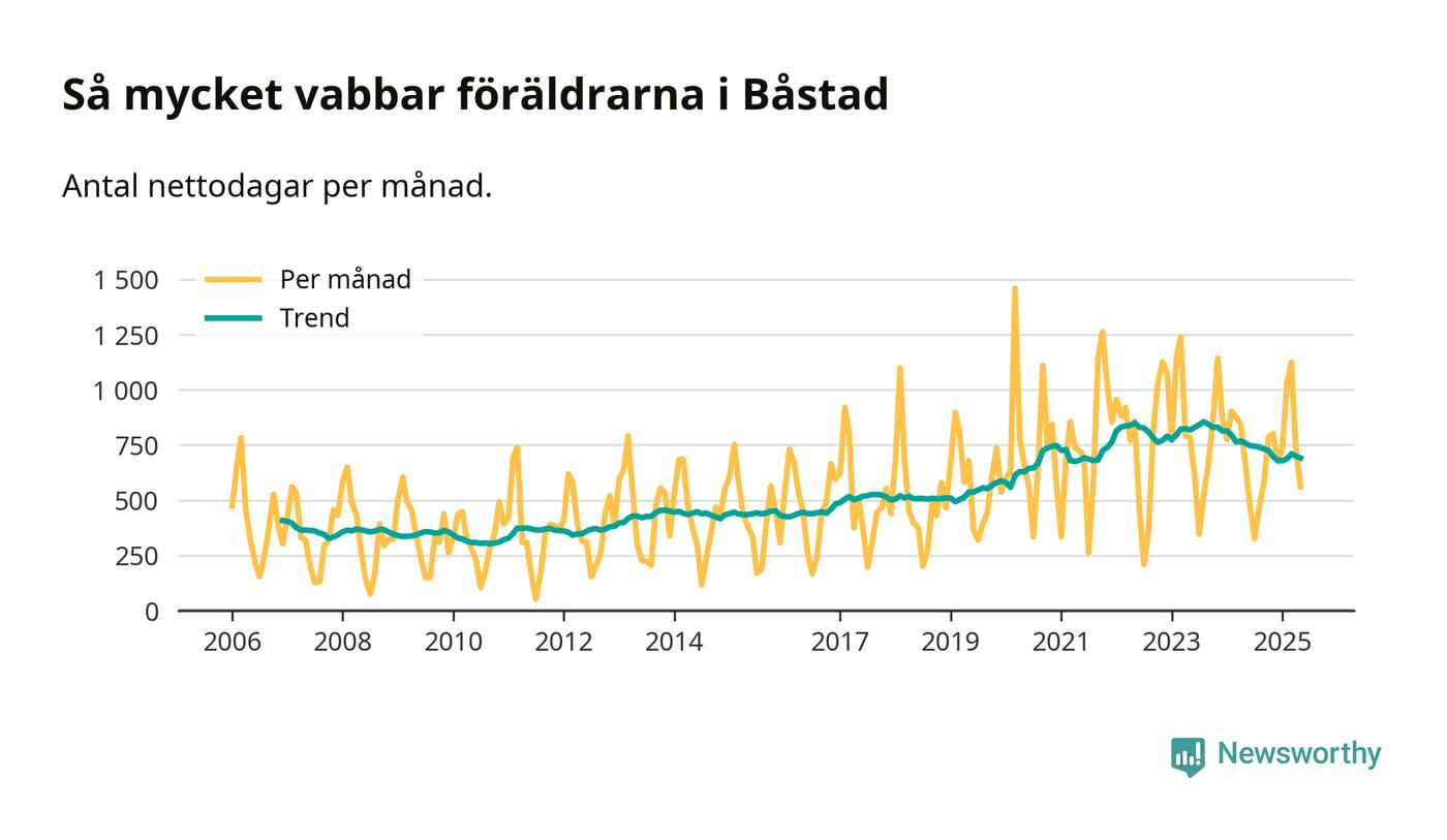 När coronapandemin drog in i mars 2020 peakade antalet vabbdagar både i Båstads kommun och i riket som helhet. Under de senaste två åren har vabbuttaget börjat minska igen.