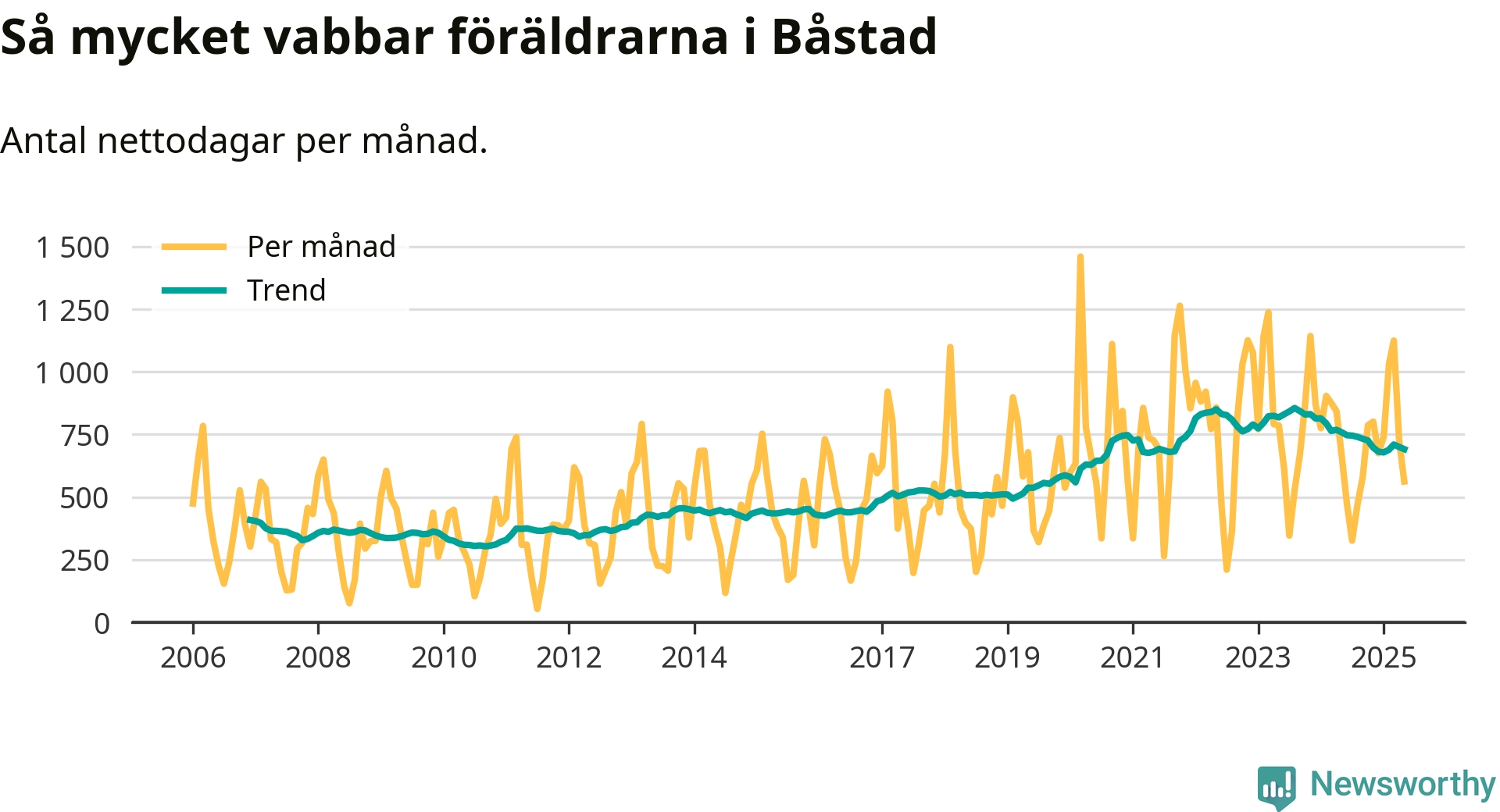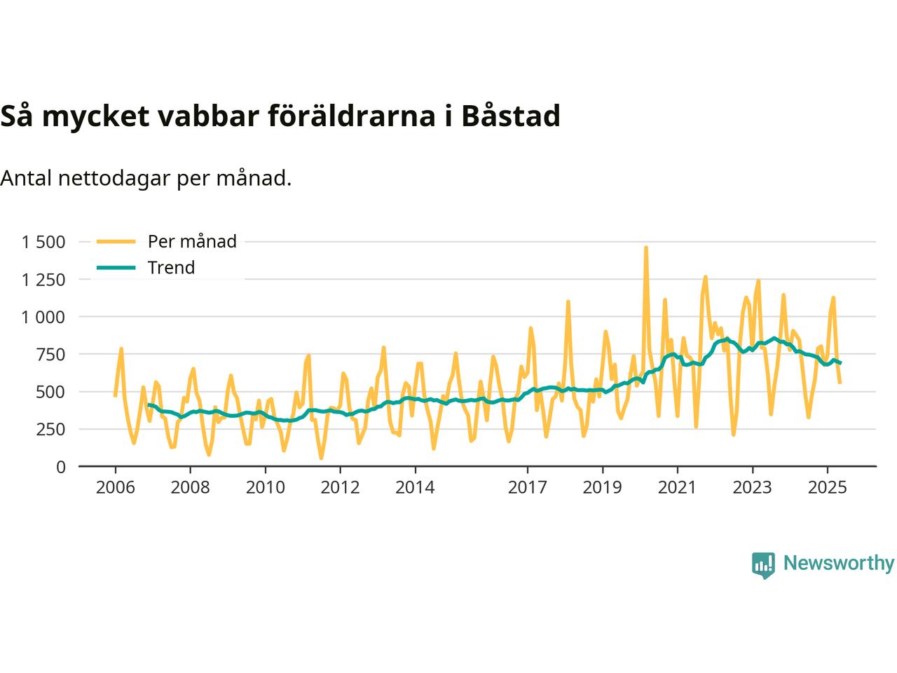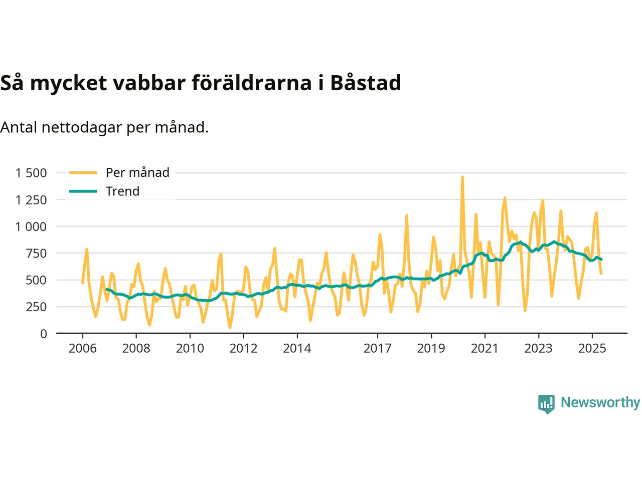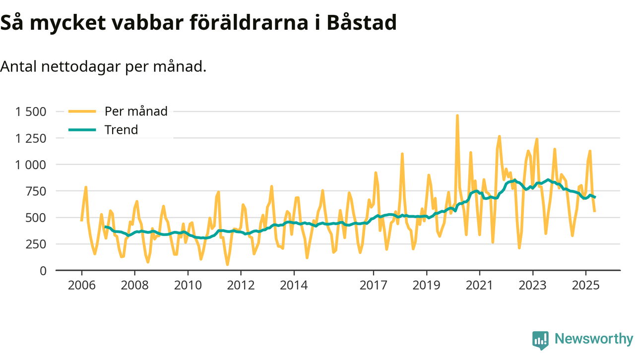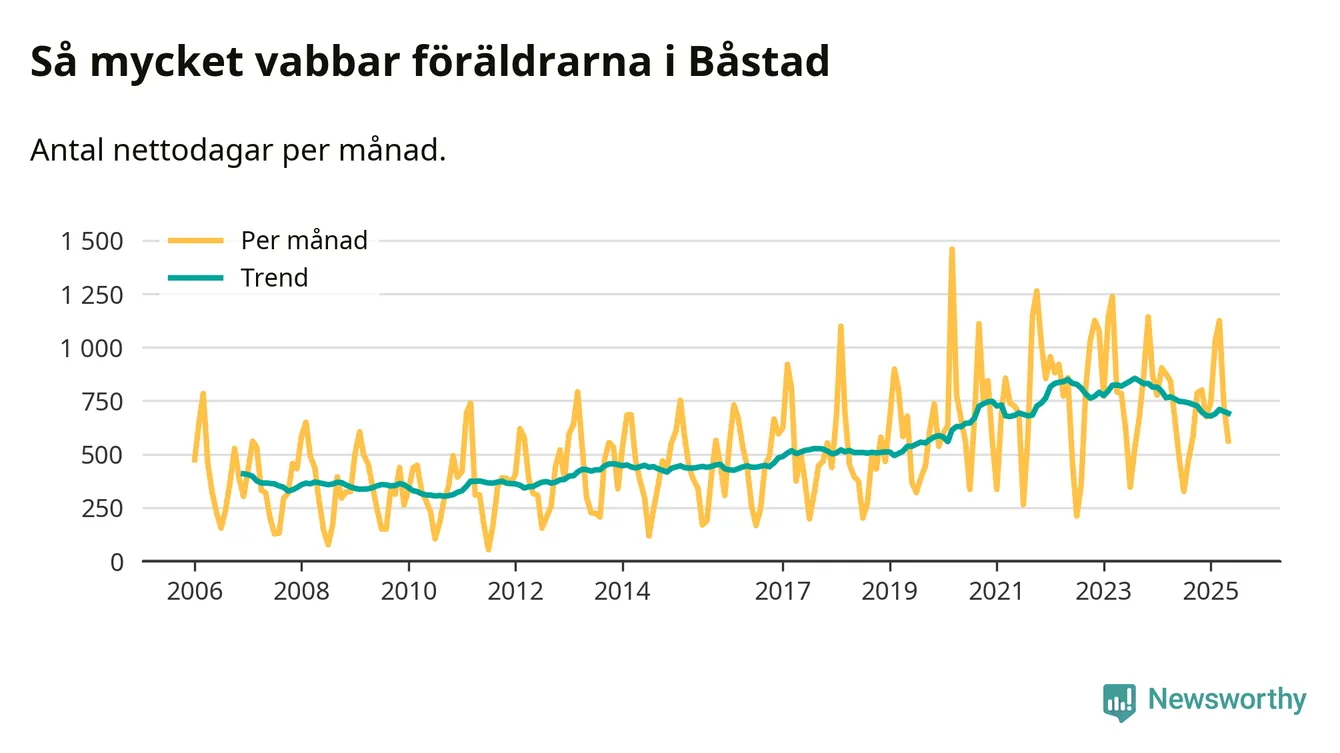 När coronapandemin drog in i mars 2020 peakade antalet vabbdagar både i Båstads kommun och i riket som helhet. Under de senaste två åren har vabbuttaget börjat minska igen.