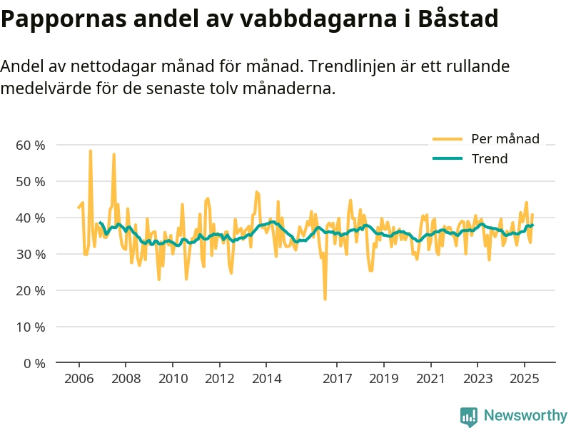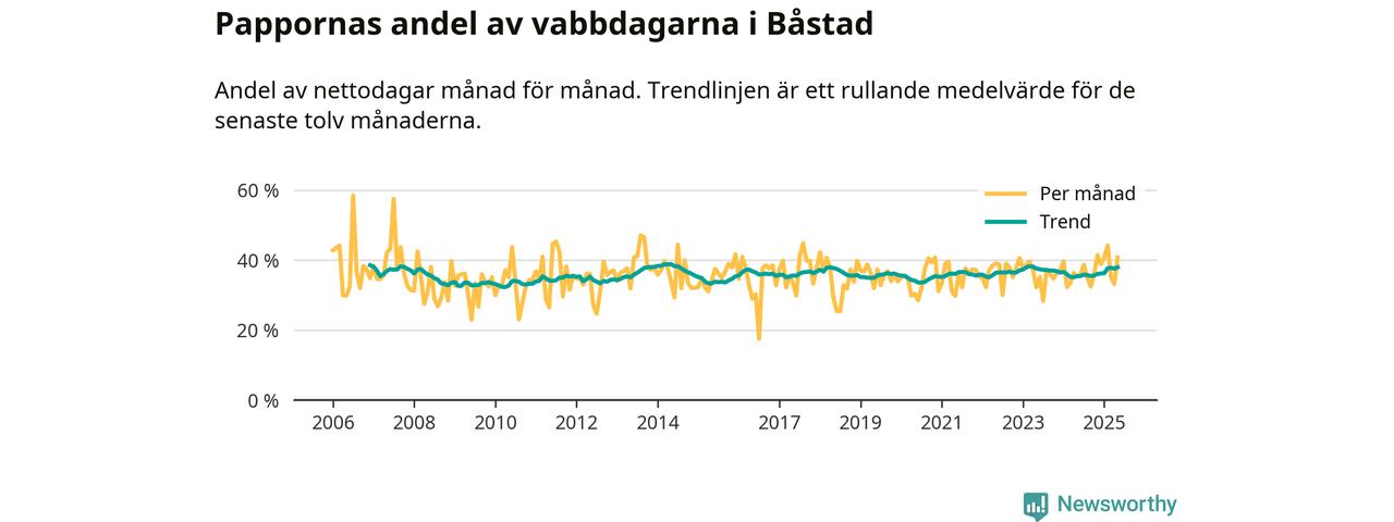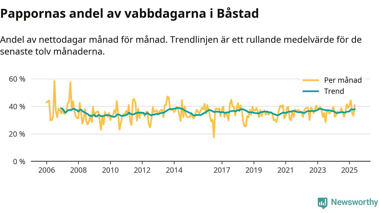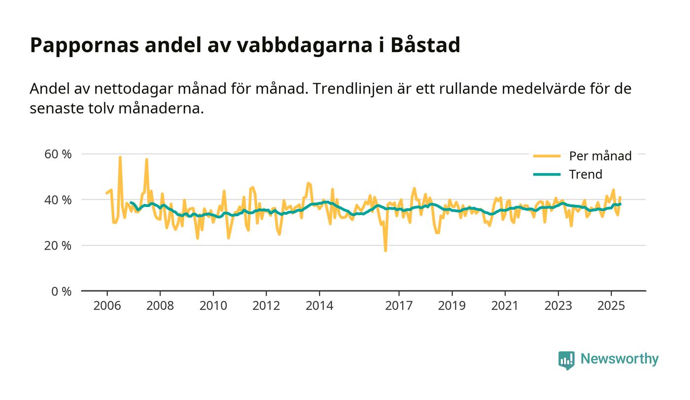 Pappor i Båstad vabbar ungefär som rikssnittet, men mer än andra män i Skåne län (36 procent). Skillnaderna inom landet är stora. Dorotea är den enda kommun i landet som når 50–50-fördelning.