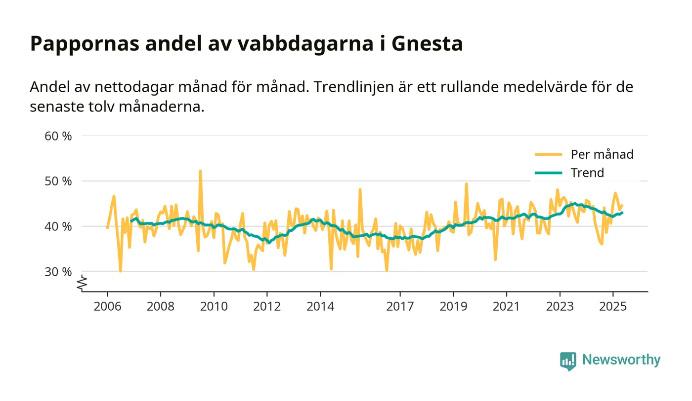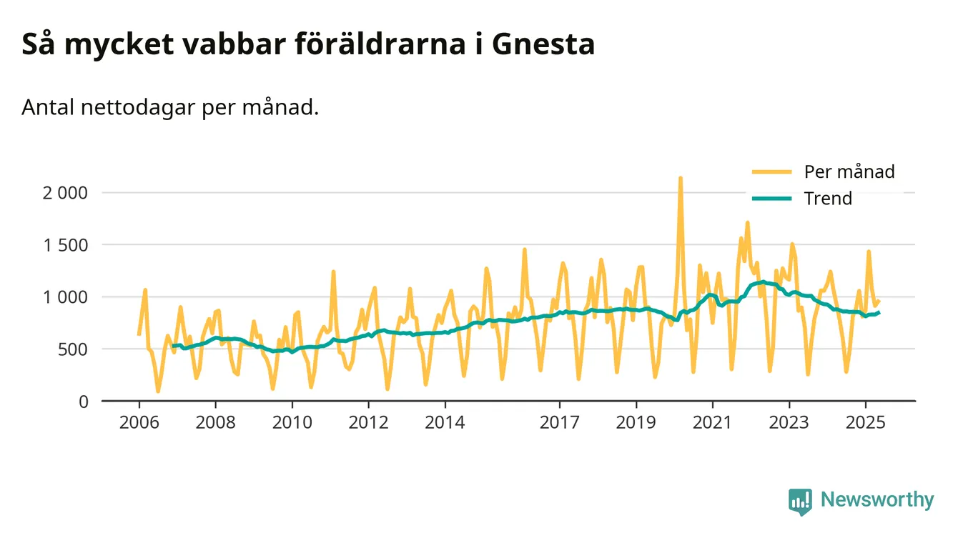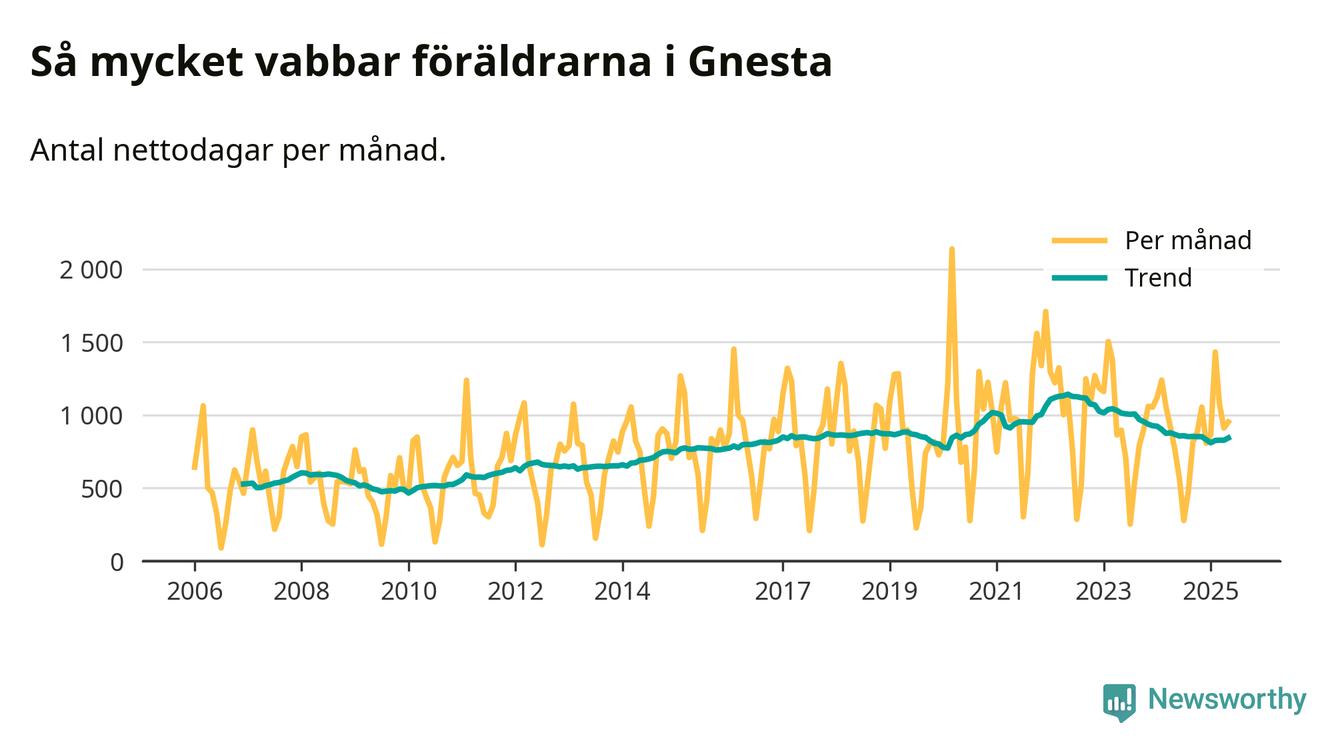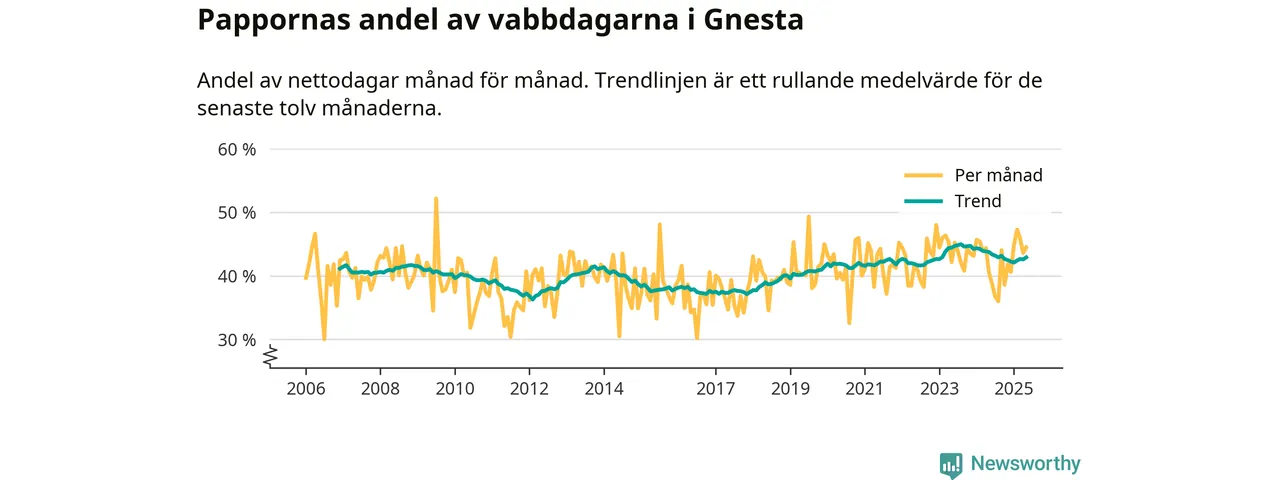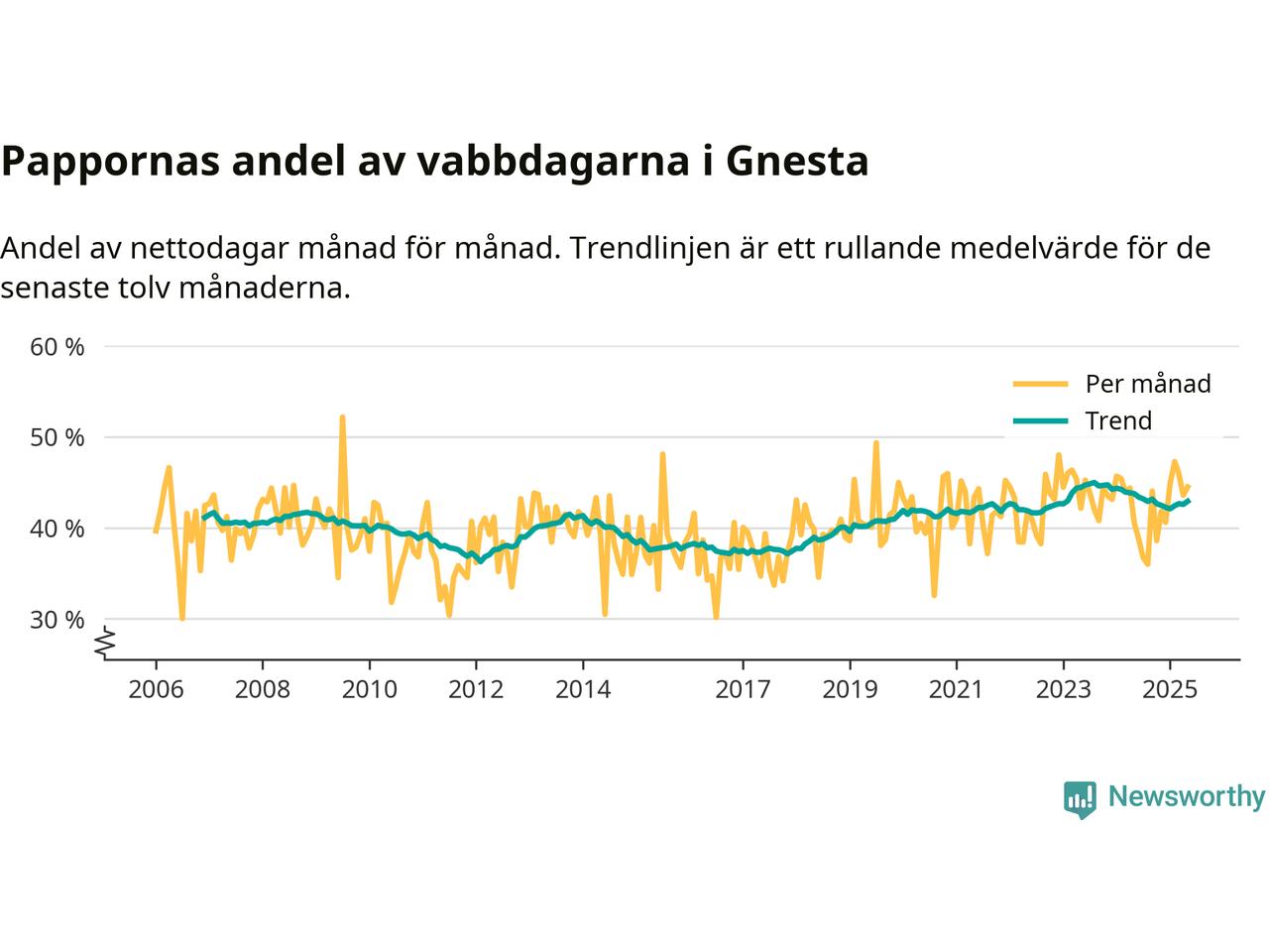 Gnesta ligger en bit från ett jämställt uttag. Under de senaste tolv månaderna har männen stått för 43 procent av all vabb i kommunen. Pappornas uttag peakade sommaren 2023 då kommunens fäder var uppe i 45 procent av vabbdagarna 1.