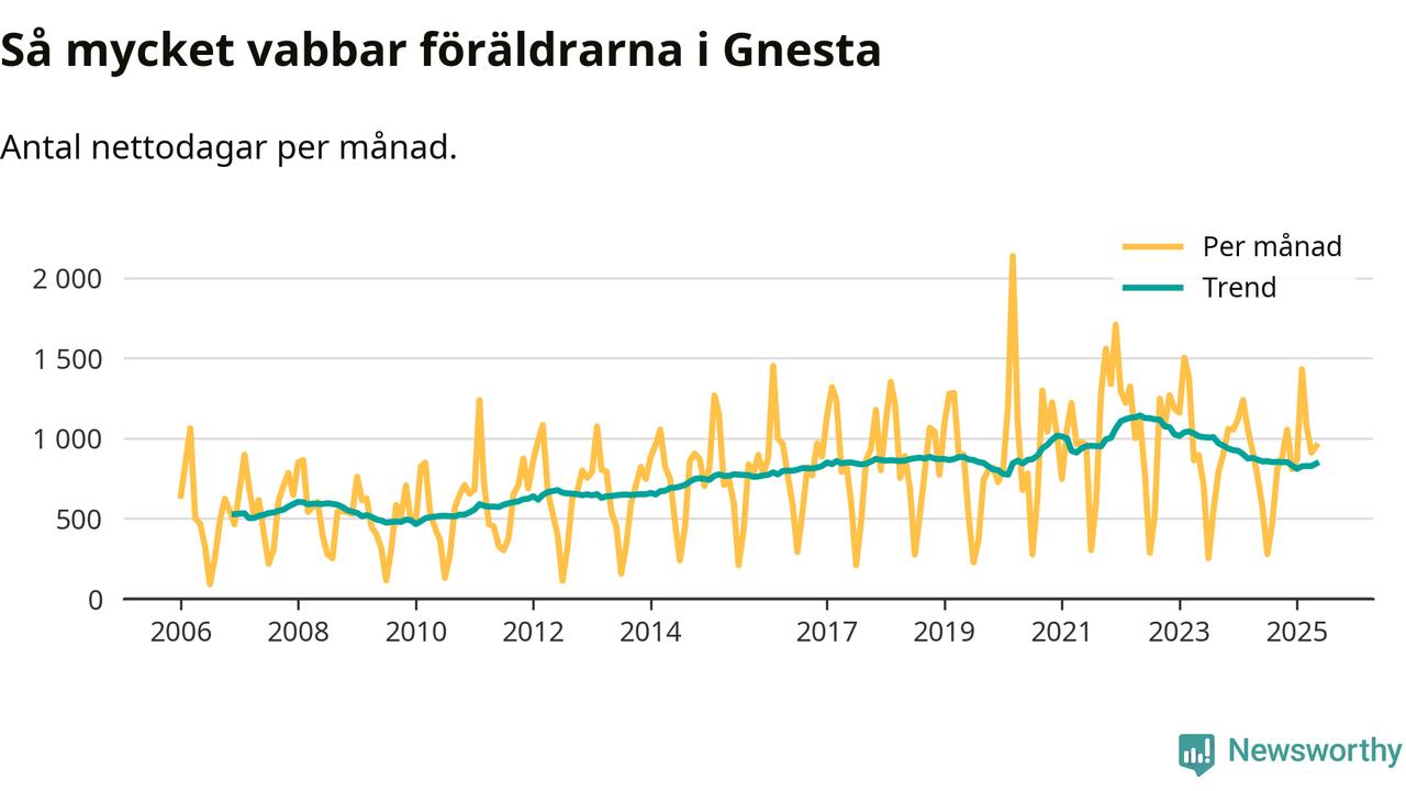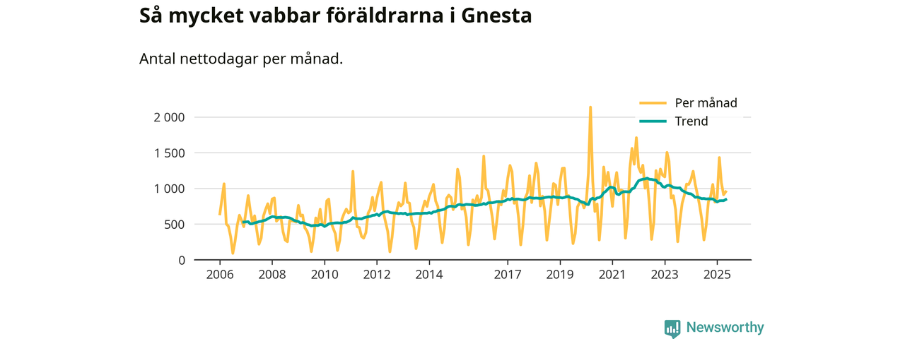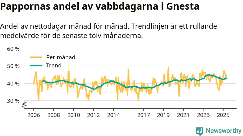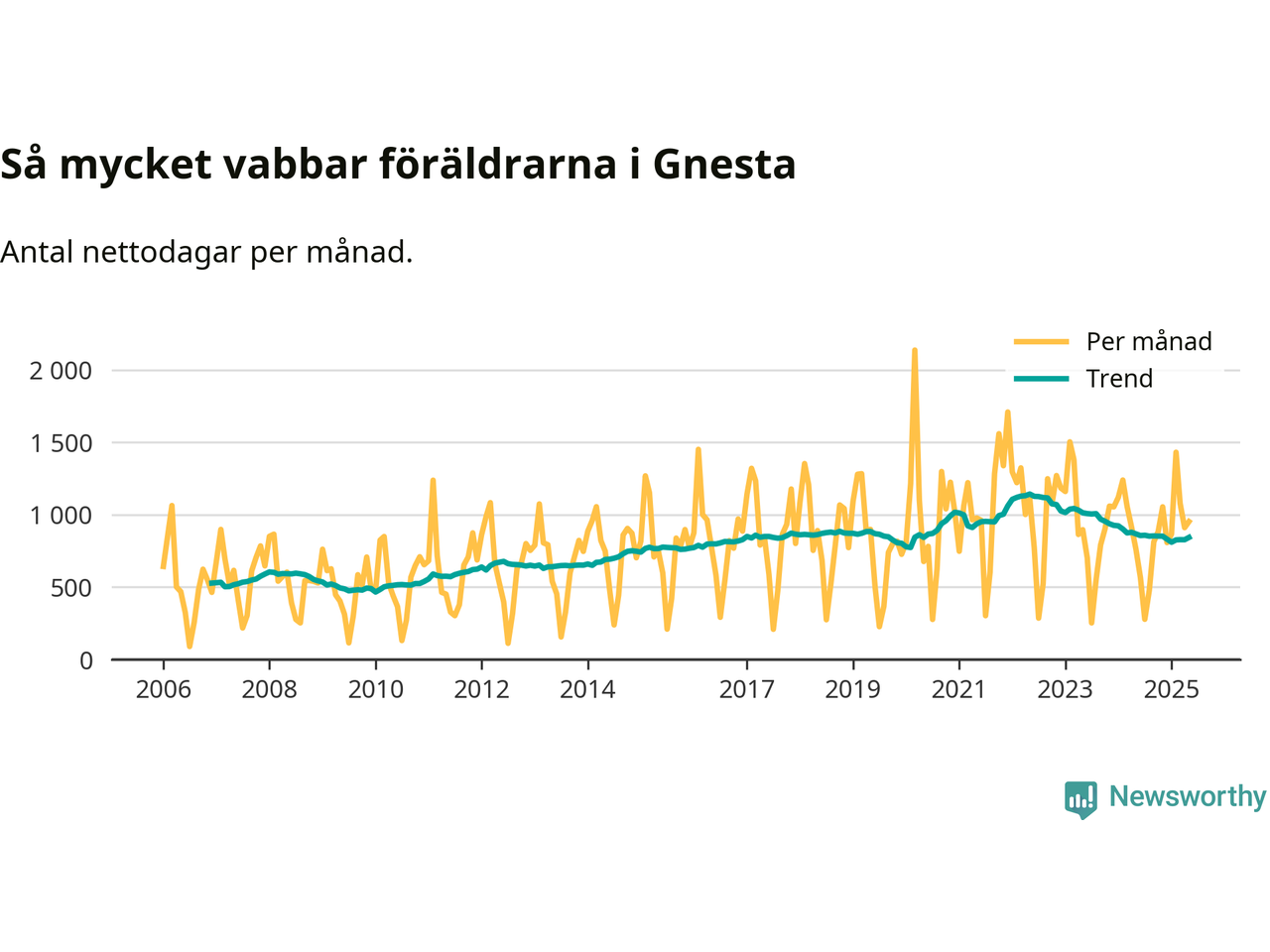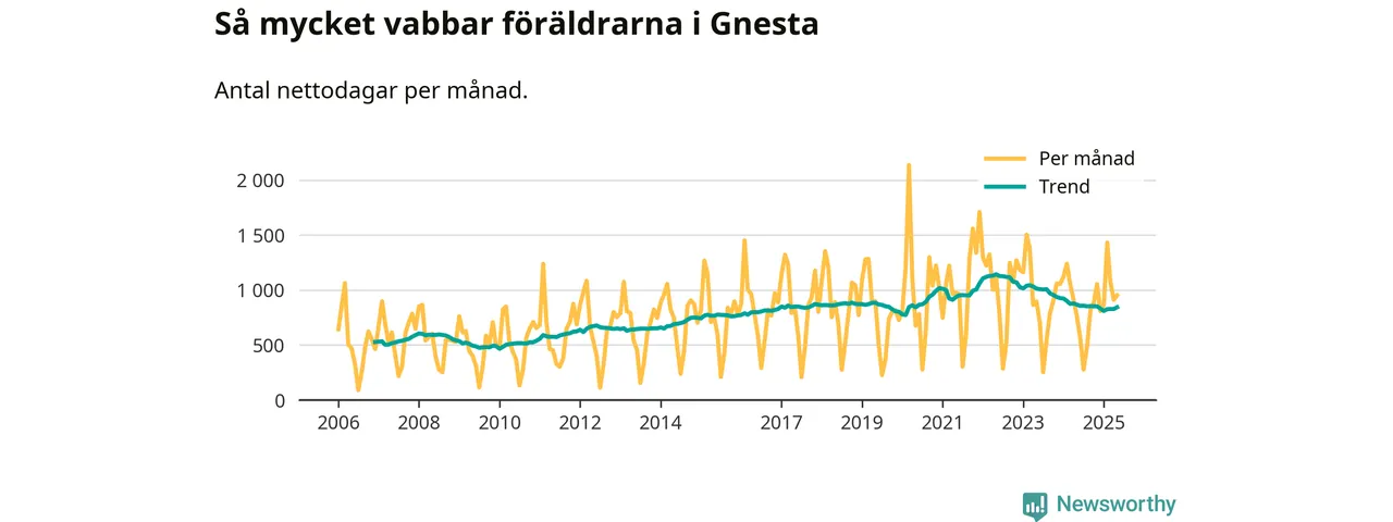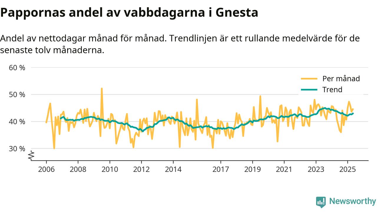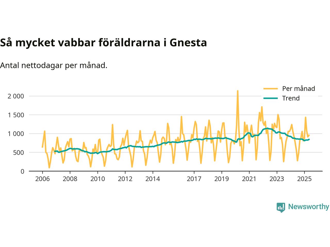 Gnesta ligger en bit från ett jämställt uttag. Under de senaste tolv månaderna har männen stått för 43 procent av all vabb i kommunen. Pappornas uttag peakade sommaren 2023 då kommunens fäder var uppe i 45 procent av vabbdagarna 1.