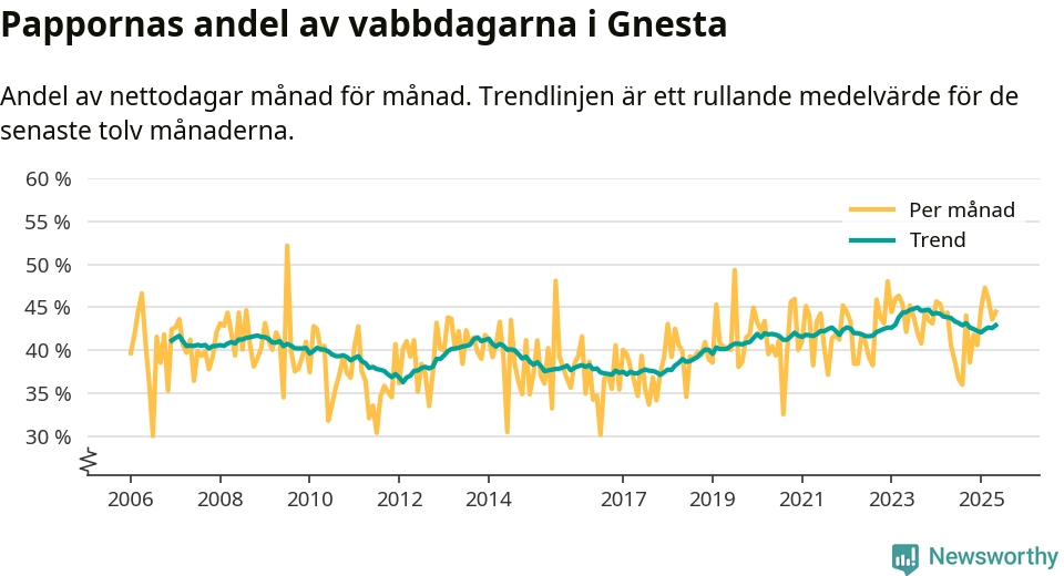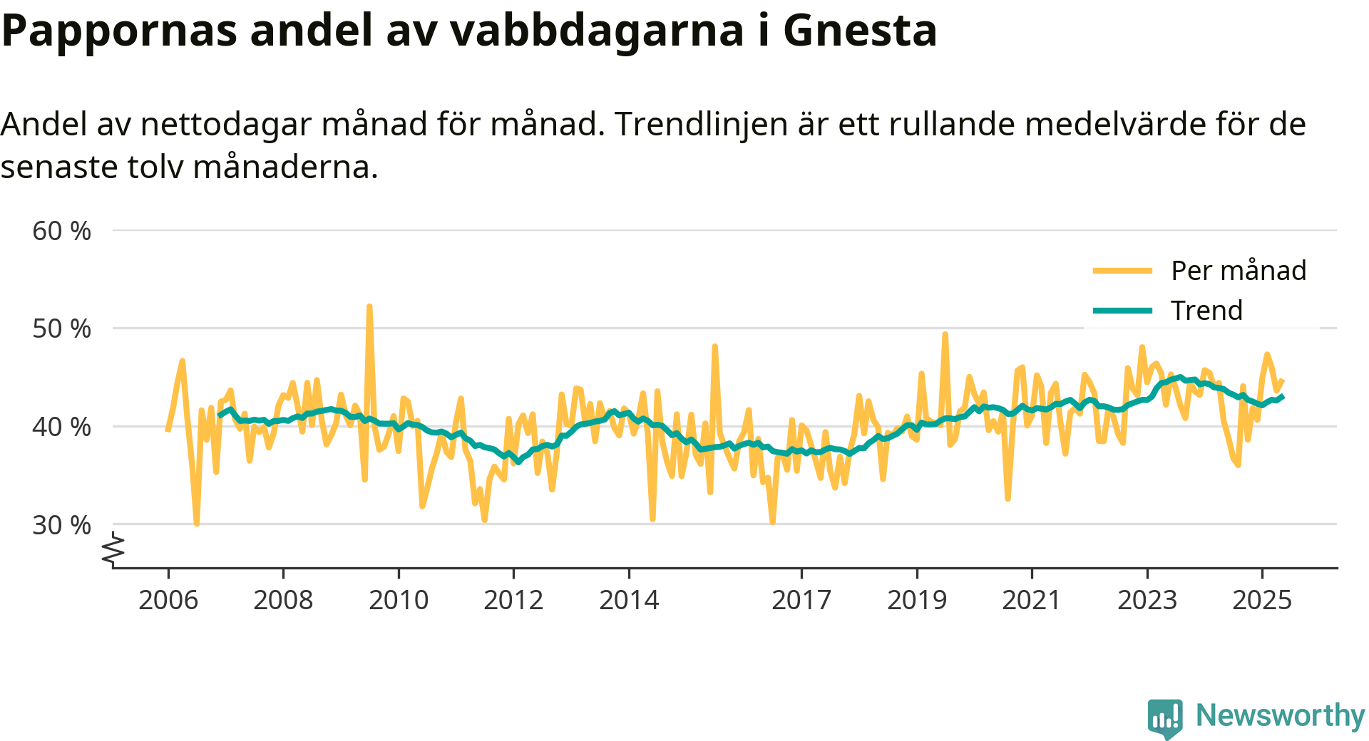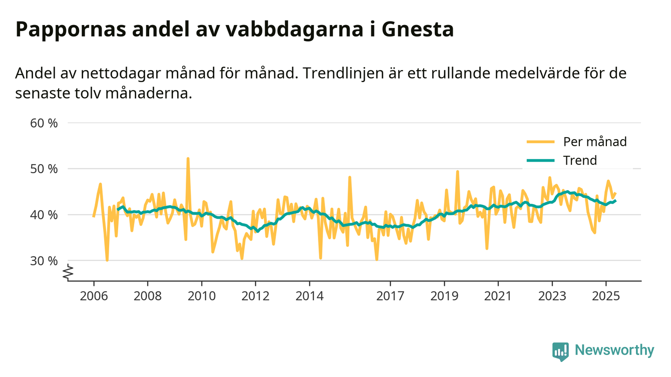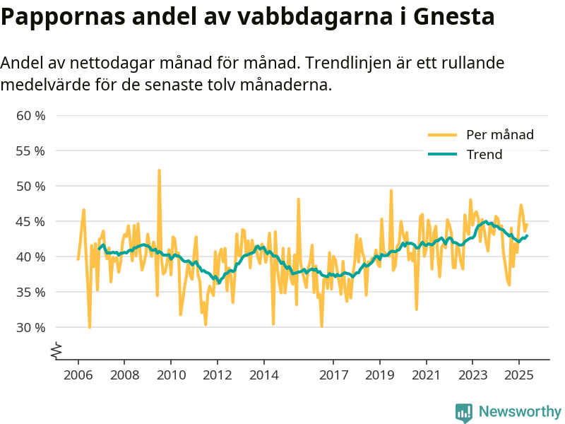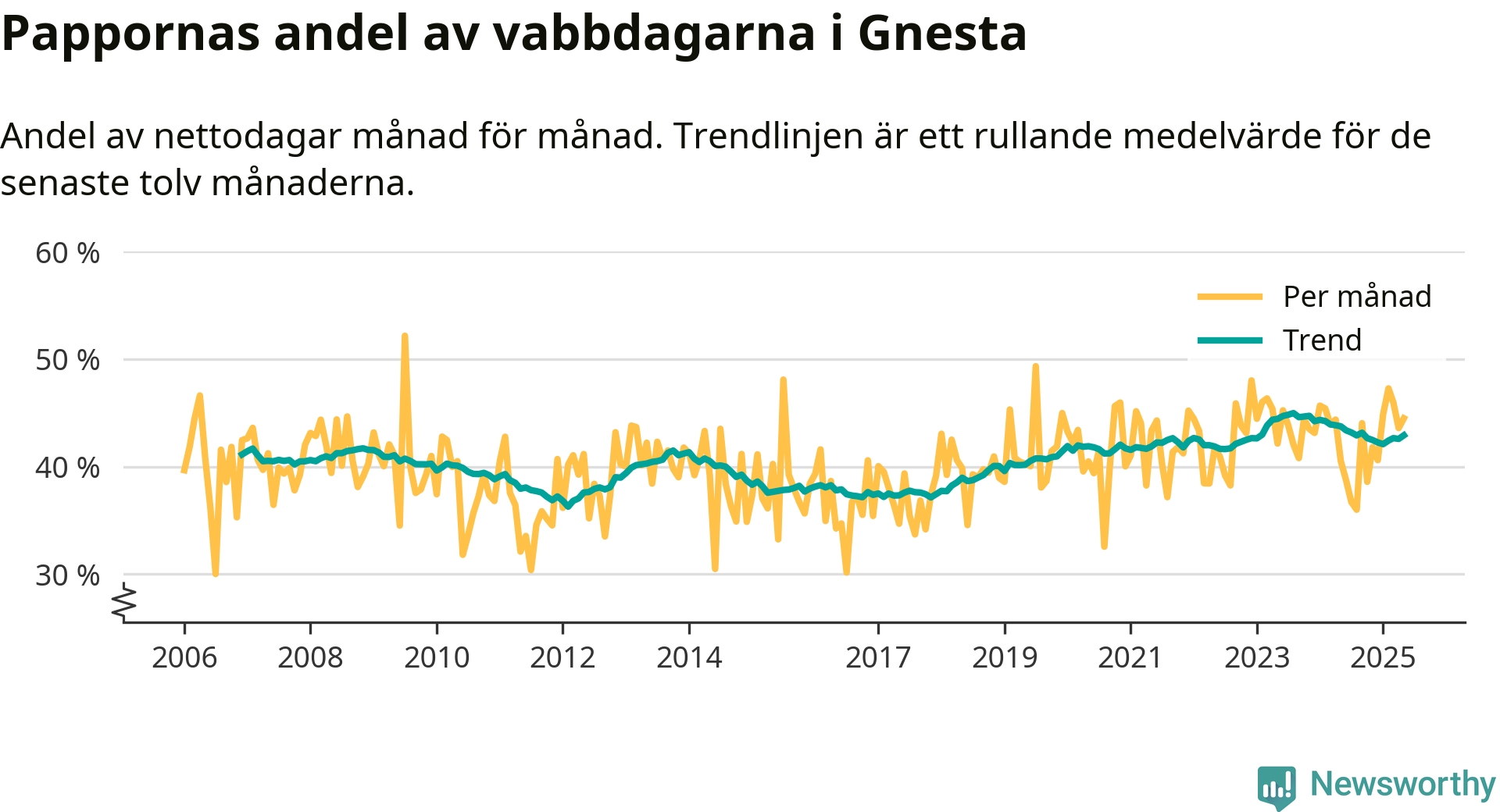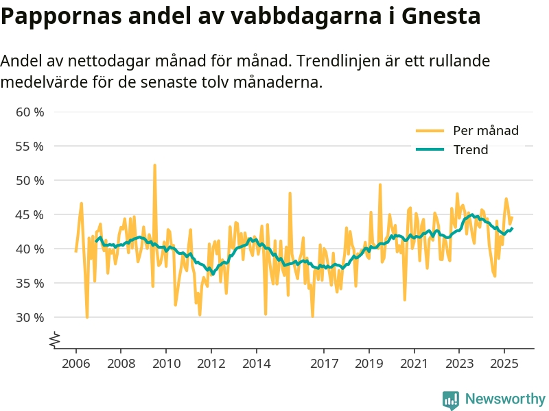 Gnesta ligger en bit från ett jämställt uttag. Under de senaste tolv månaderna har männen stått för 43 procent av all vabb i kommunen. Pappornas uttag peakade sommaren 2023 då kommunens fäder var uppe i 45 procent av vabbdagarna 1.