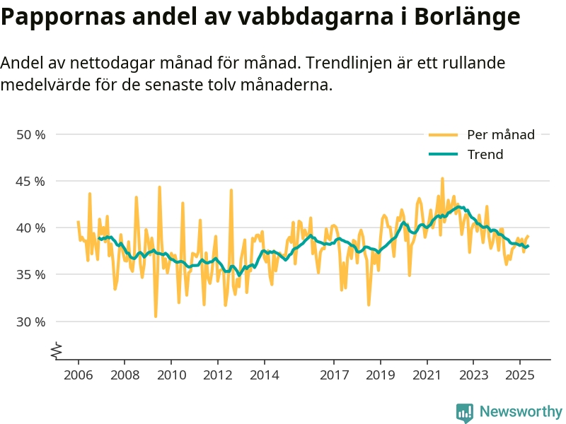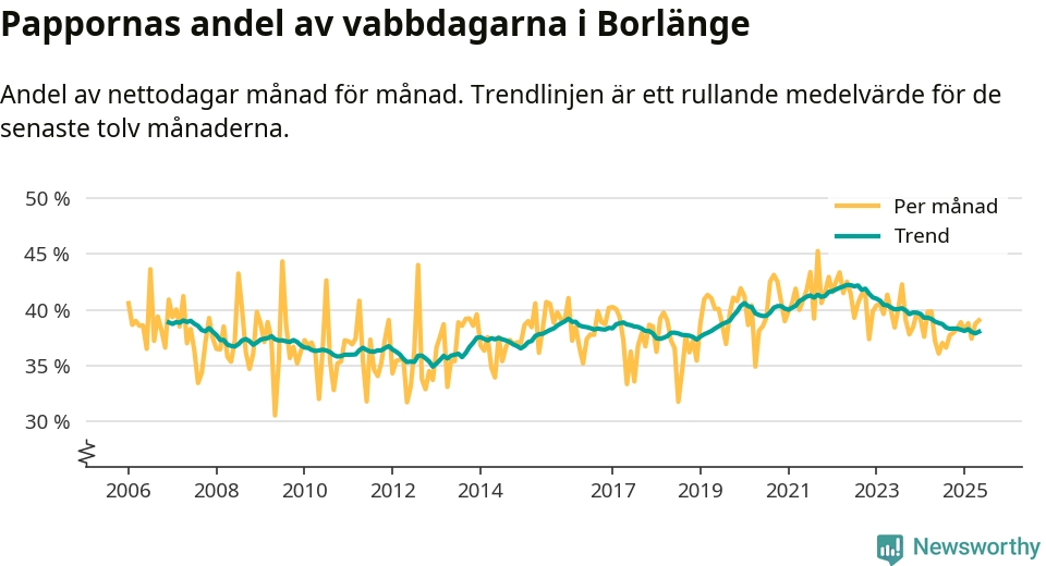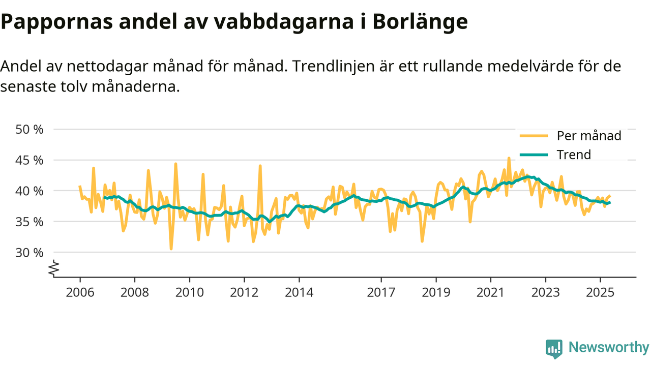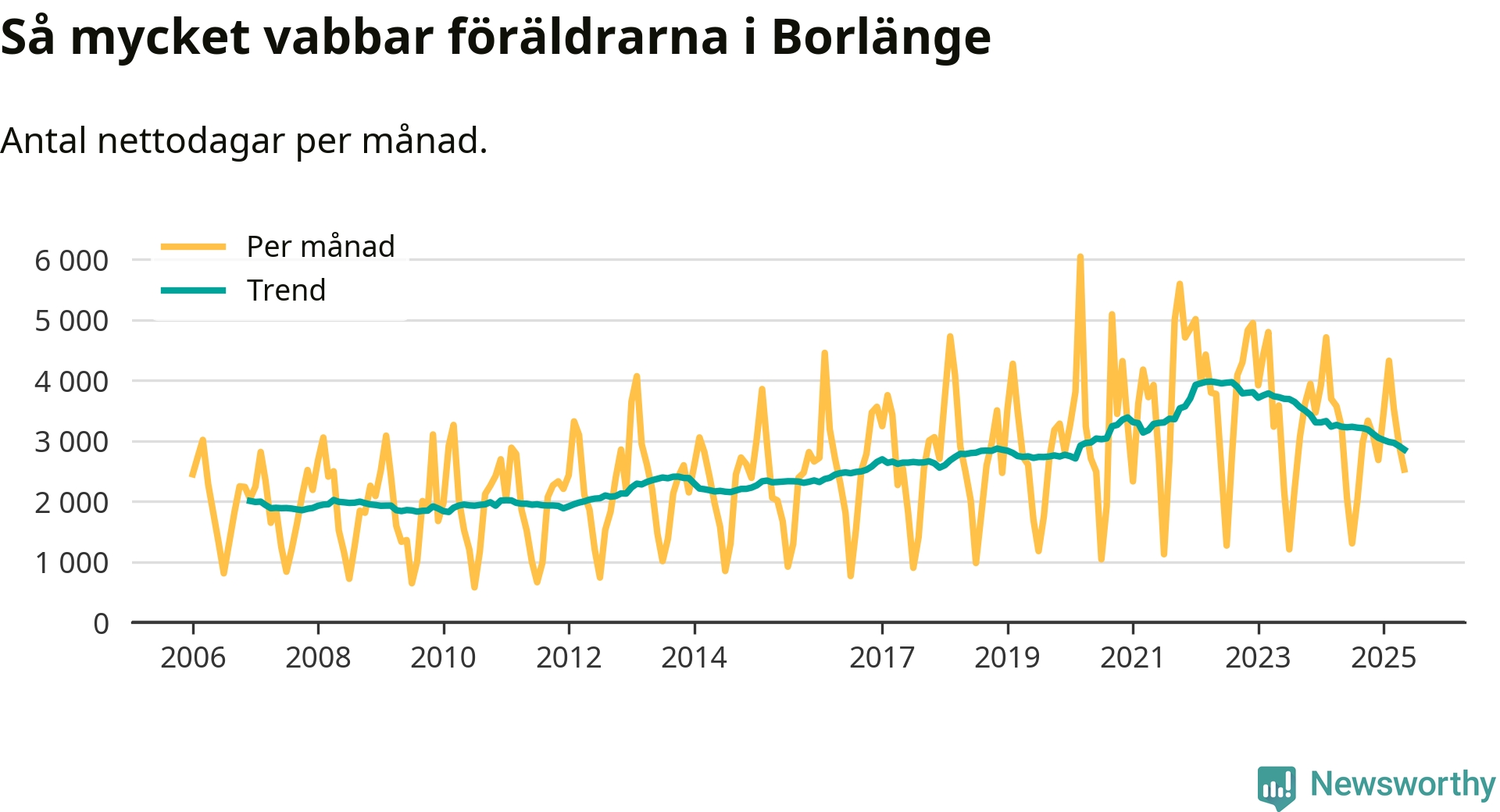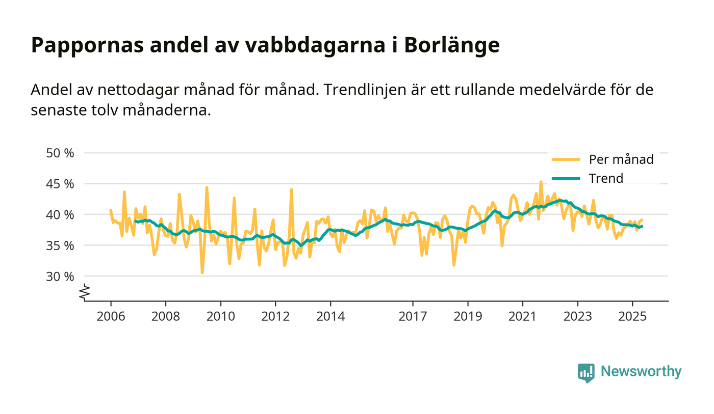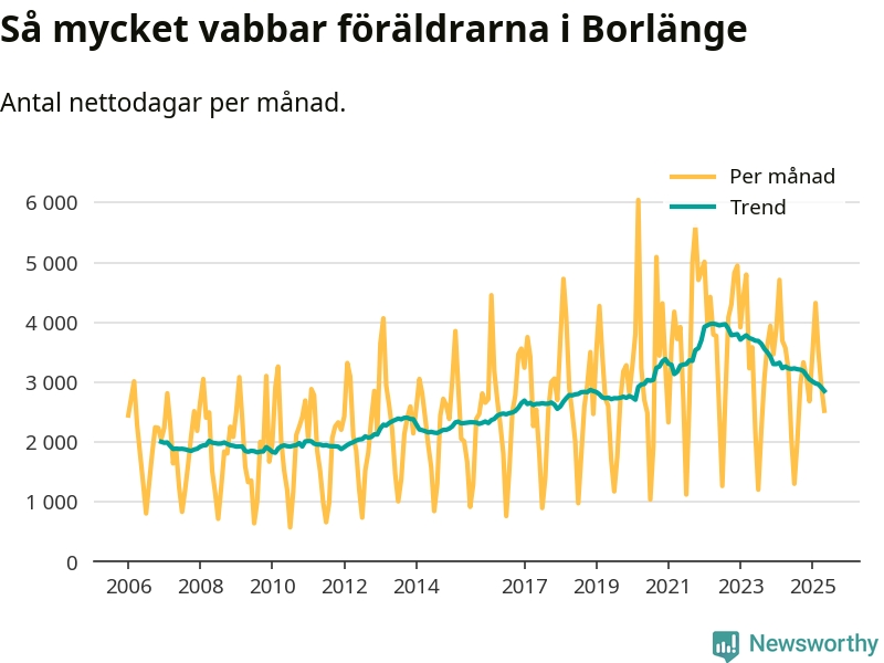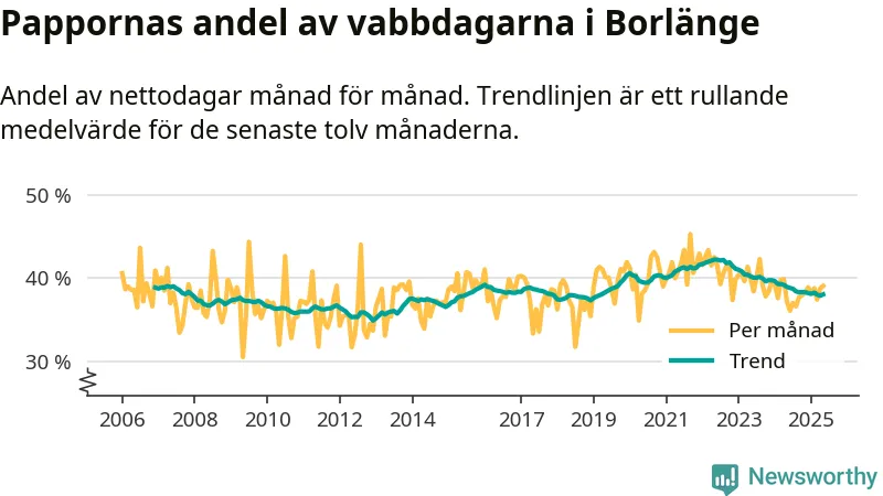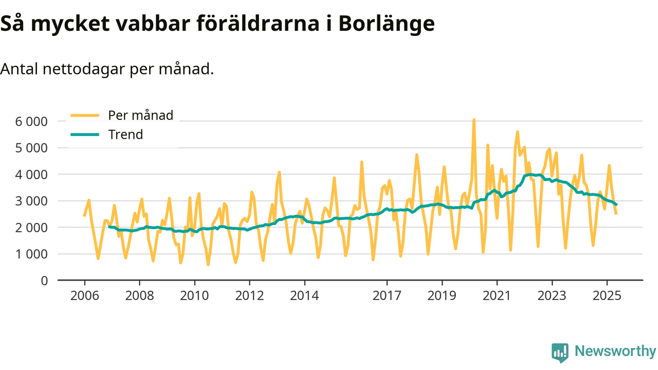 När coronapandemin drog in i mars 2020 peakade antalet vabbdagar både i Borlänge kommun och i riket som helhet. Under de senaste två åren har vabbuttaget börjat minska igen.