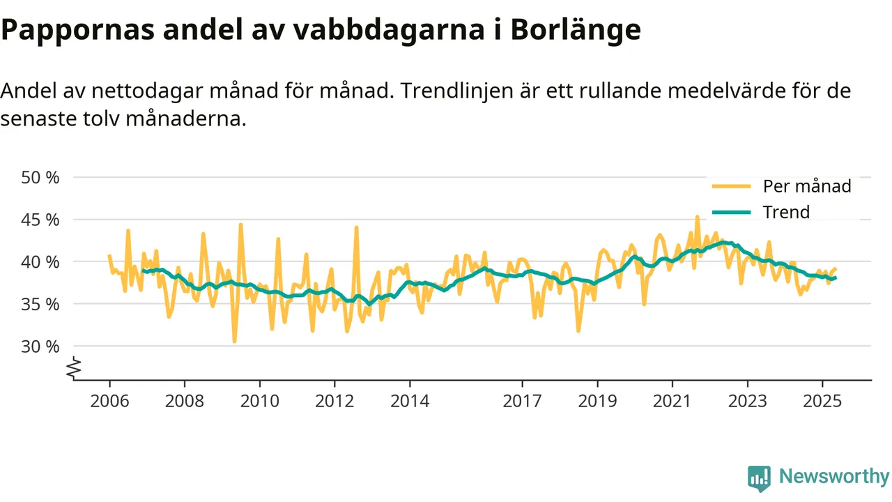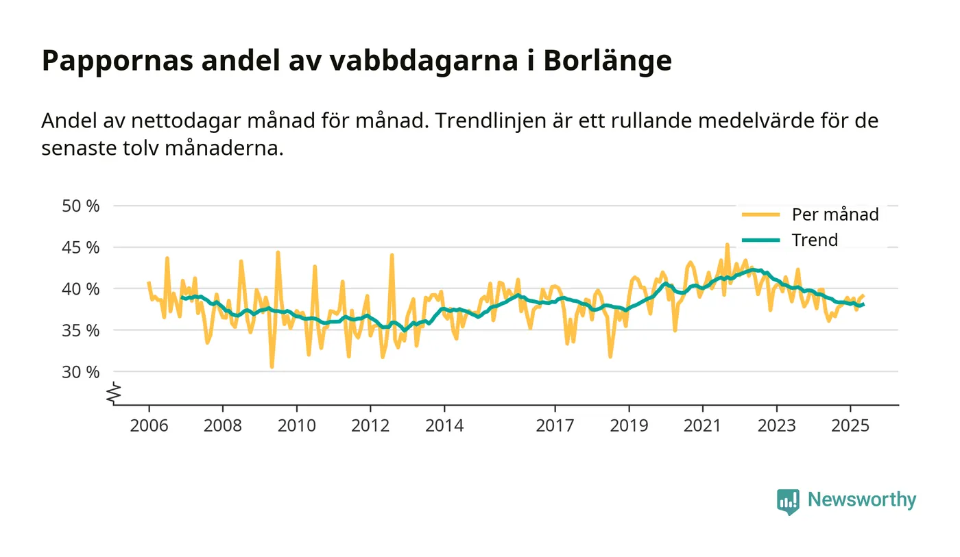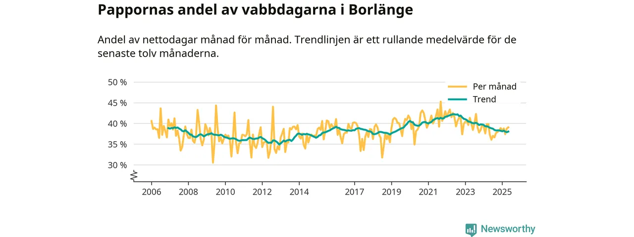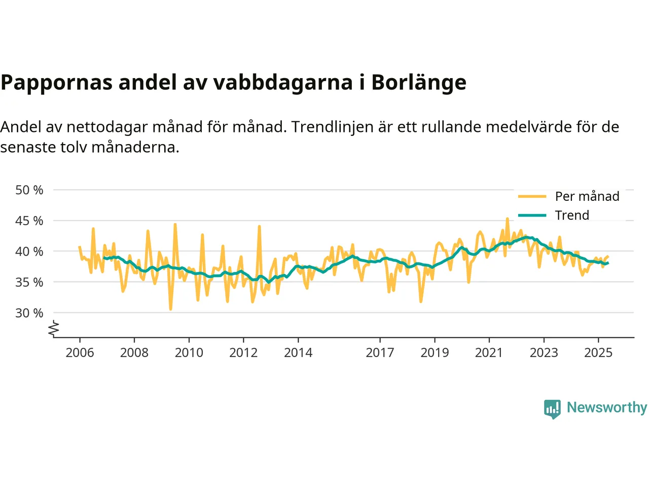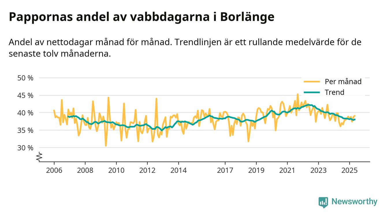 Borlänge ligger en bit från ett jämställt uttag. Under de senaste tolv månaderna har männen stått för 38 procent av all vabb i kommunen. I år har andelen varit lägre än på över sex år.