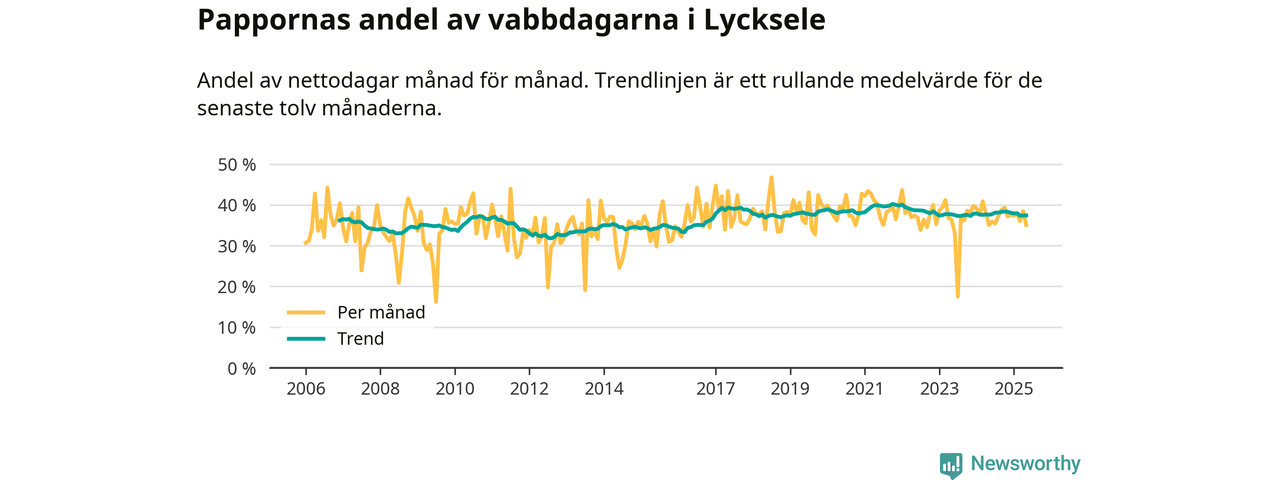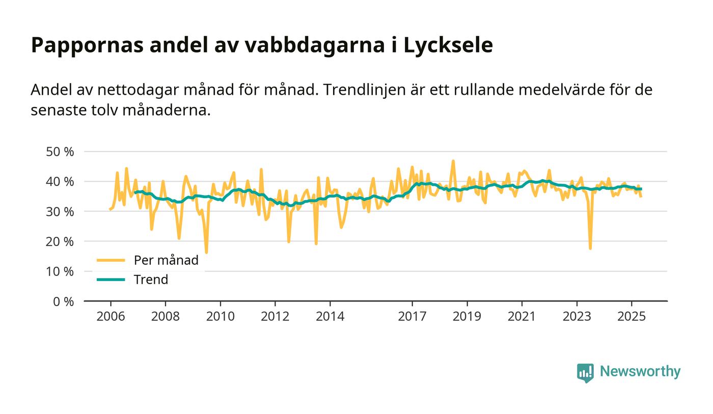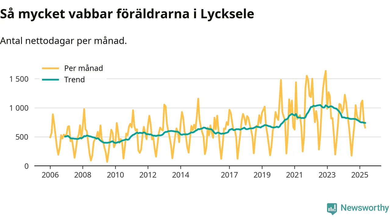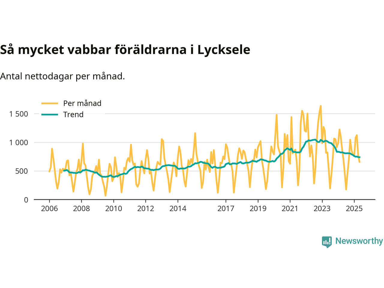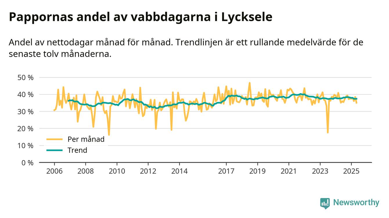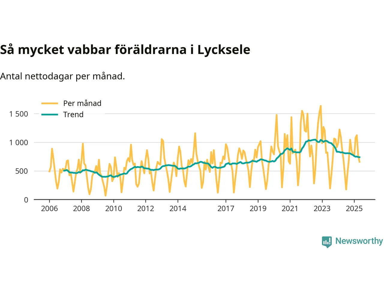 Lycksele ligger en bit från ett jämställt uttag. Under de senaste tolv månaderna har männen stått för 37 procent av all vabb i kommunen. Pappornas uttag peakade hösten 2021 då kommunens fäder var uppe i 40 procent av vabbdagarna 1.
