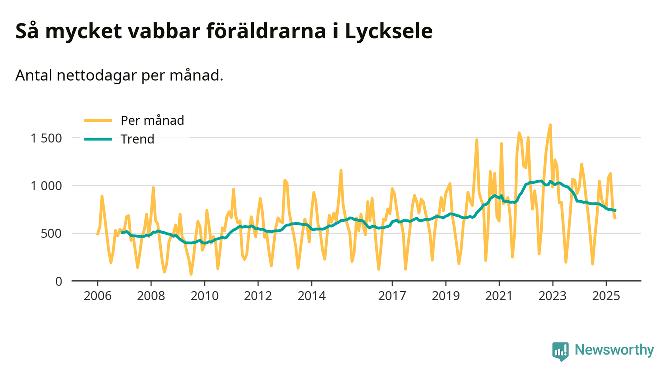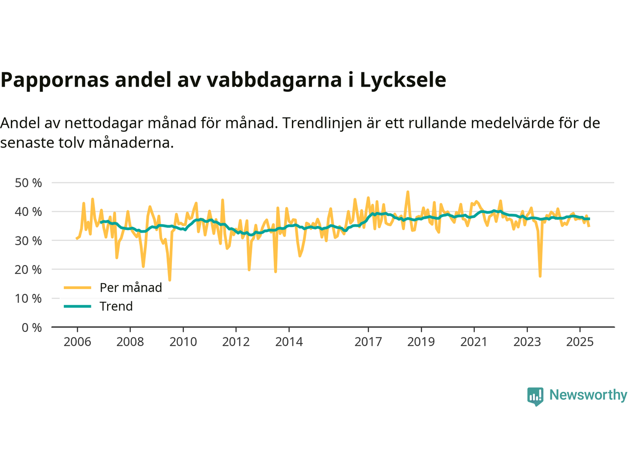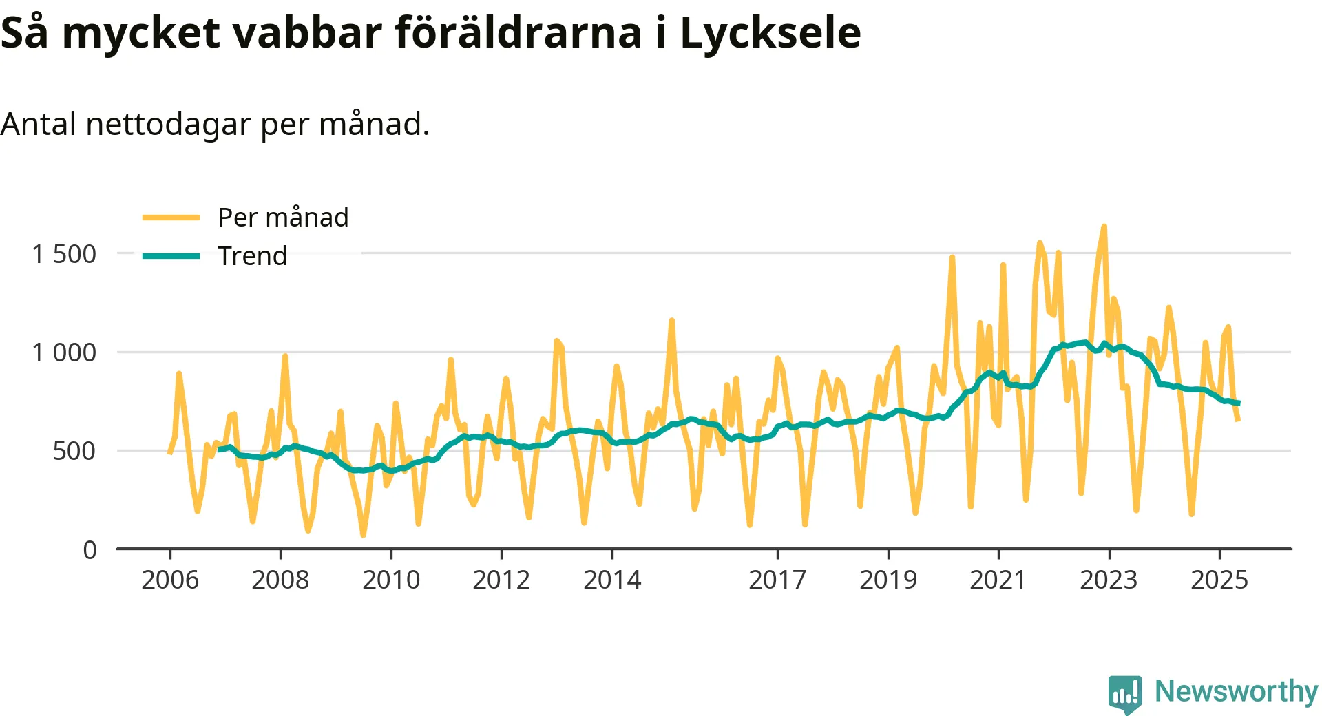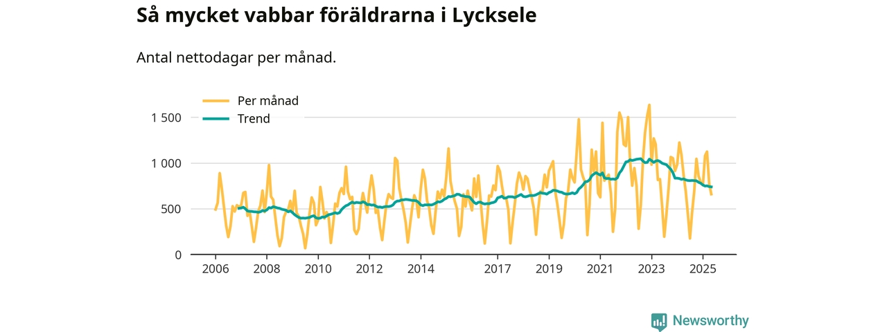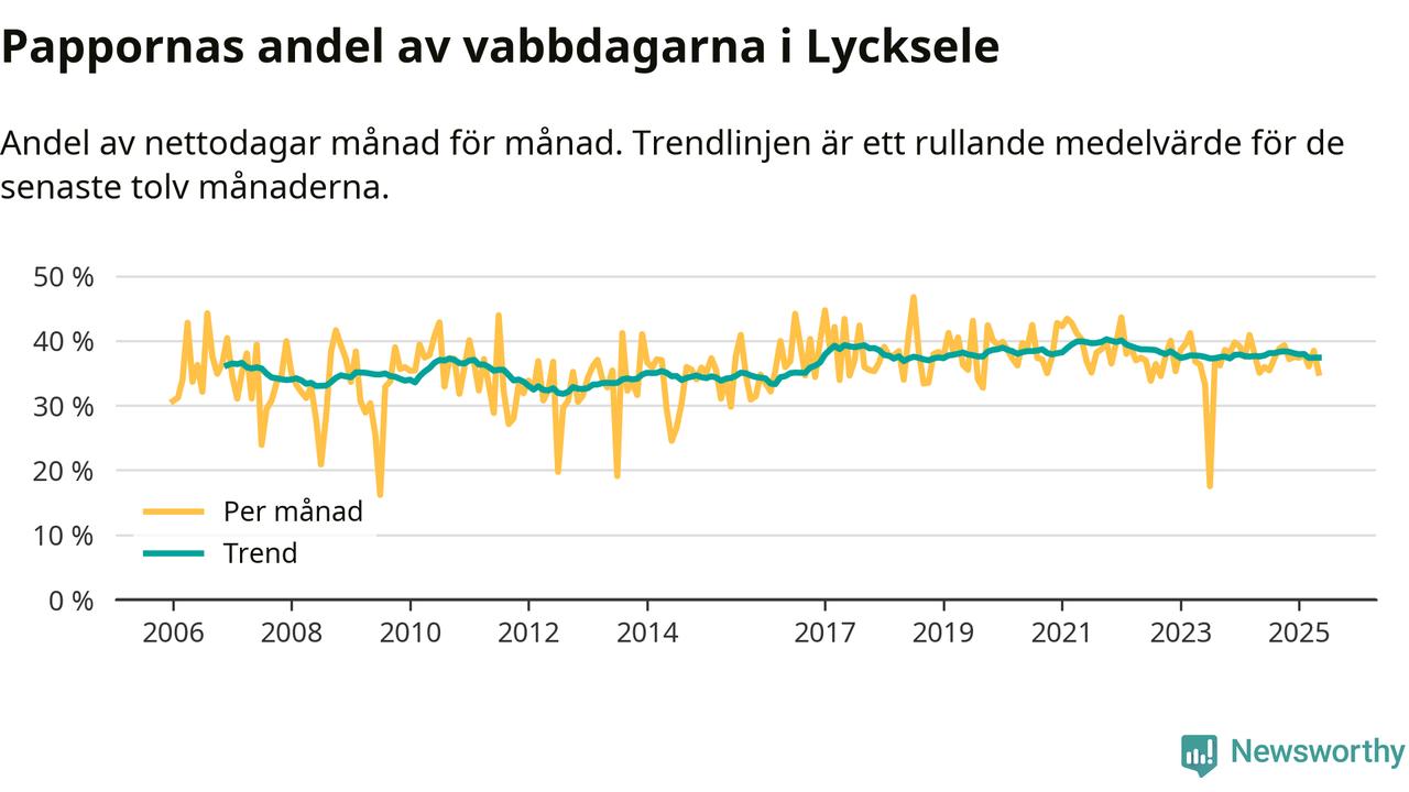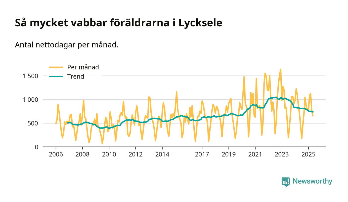 Lycksele ligger en bit från ett jämställt uttag. Under de senaste tolv månaderna har männen stått för 37 procent av all vabb i kommunen. Pappornas uttag peakade hösten 2021 då kommunens fäder var uppe i 40 procent av vabbdagarna 1.