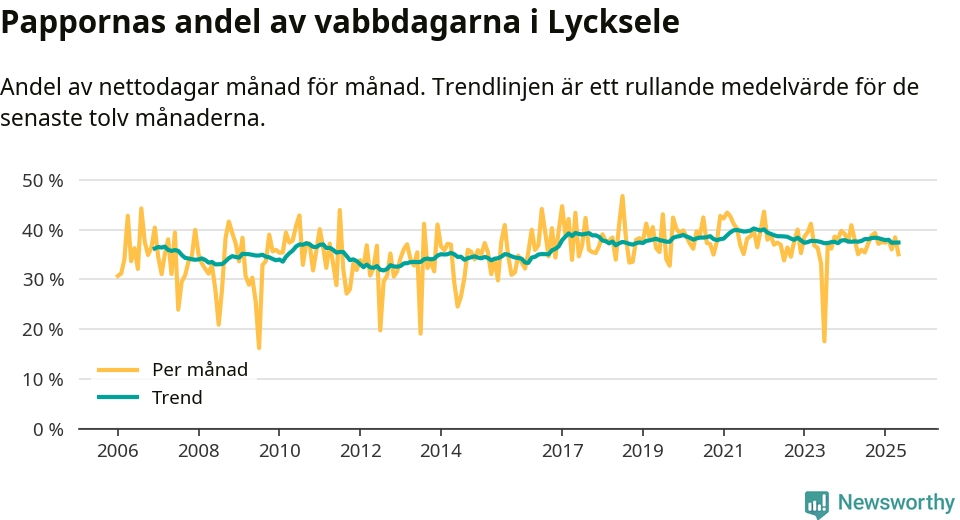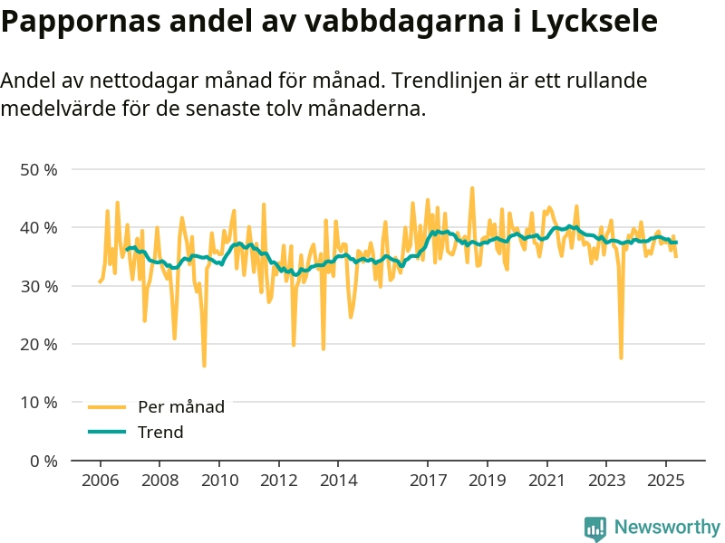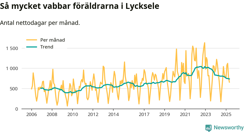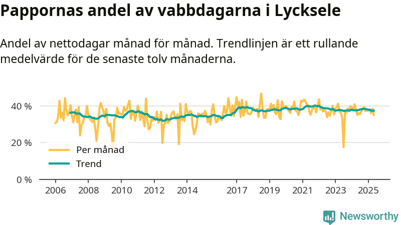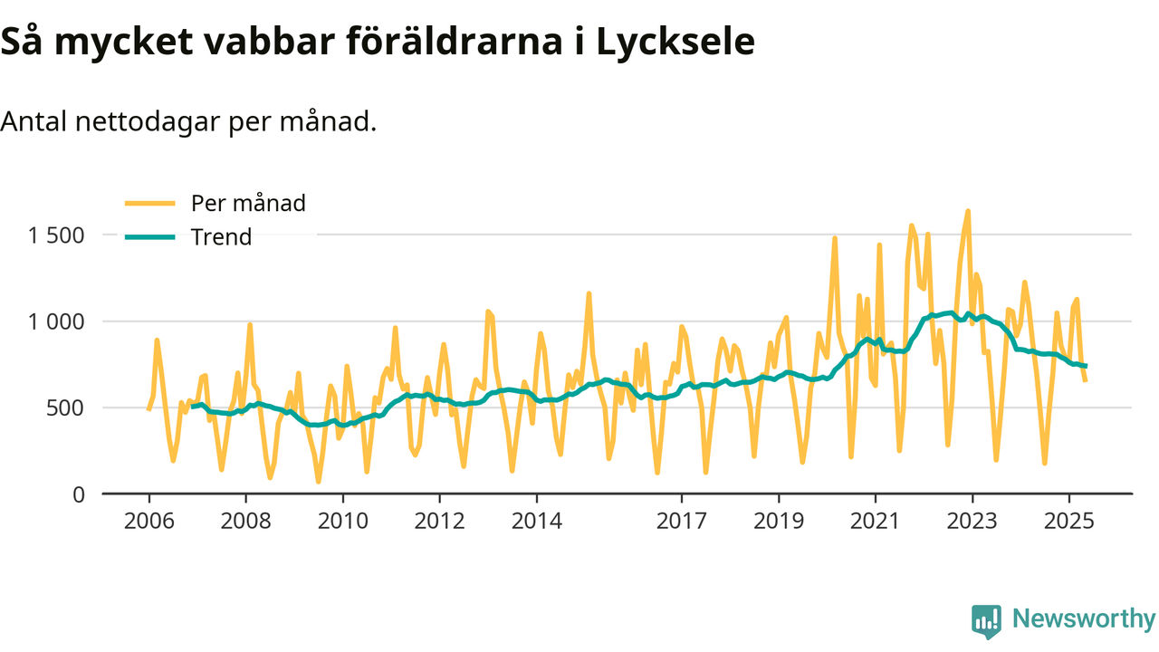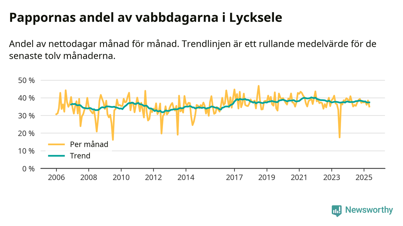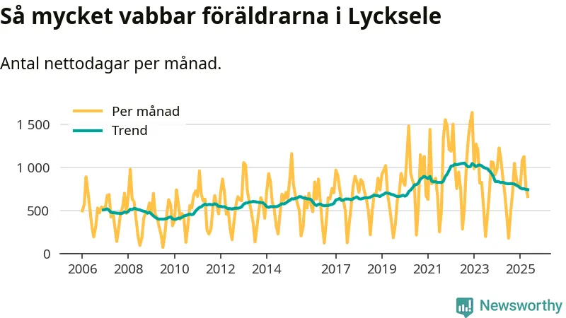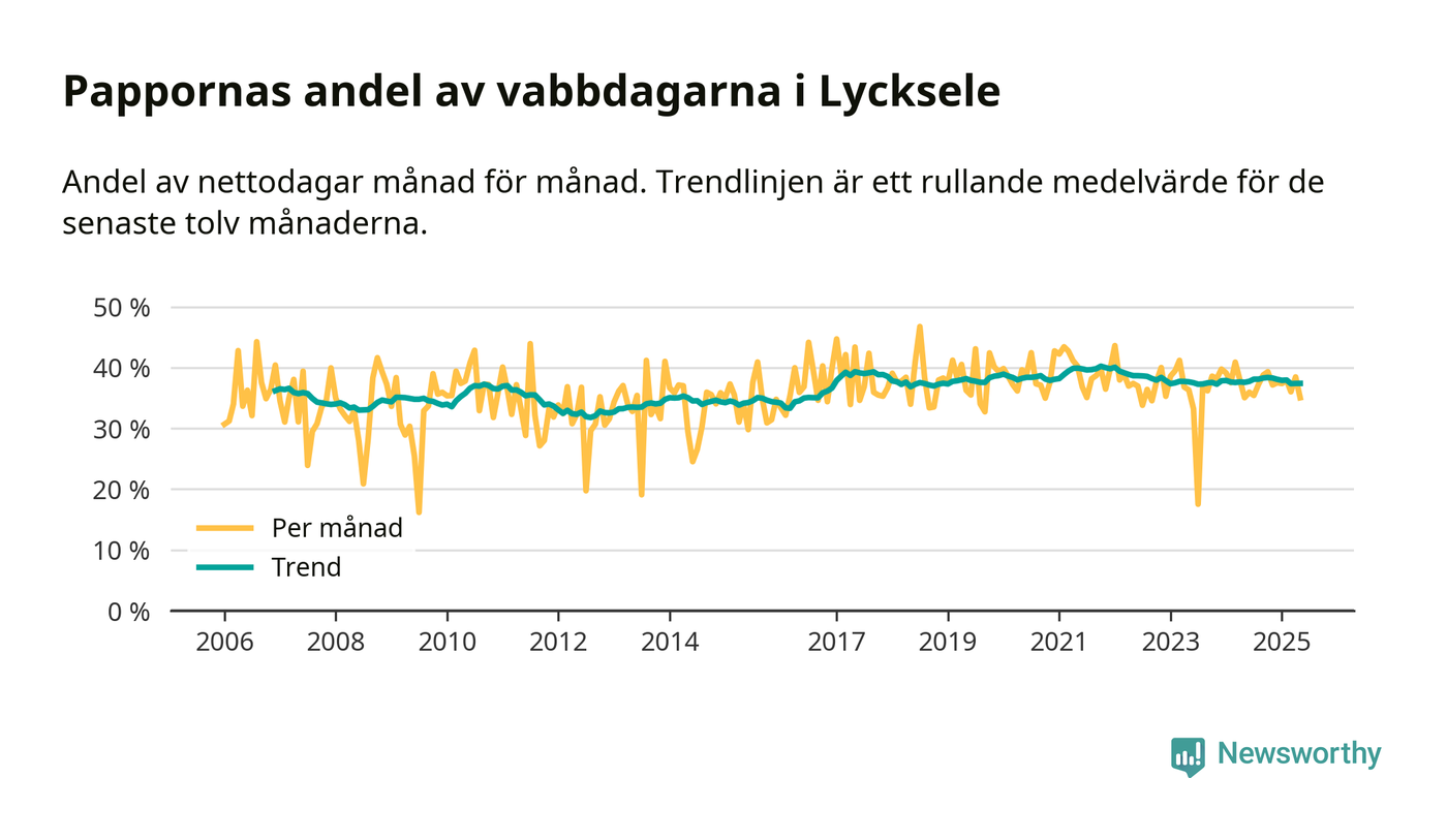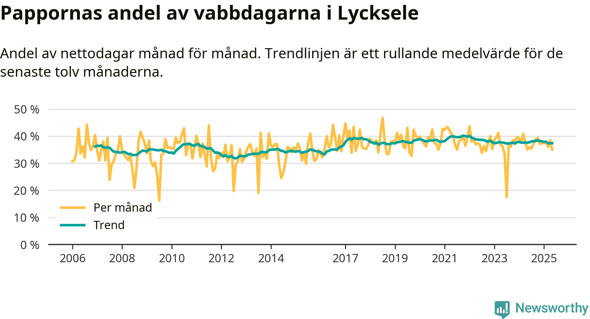 Lycksele ligger en bit från ett jämställt uttag. Under de senaste tolv månaderna har männen stått för 37 procent av all vabb i kommunen. Pappornas uttag peakade hösten 2021 då kommunens fäder var uppe i 40 procent av vabbdagarna 1.