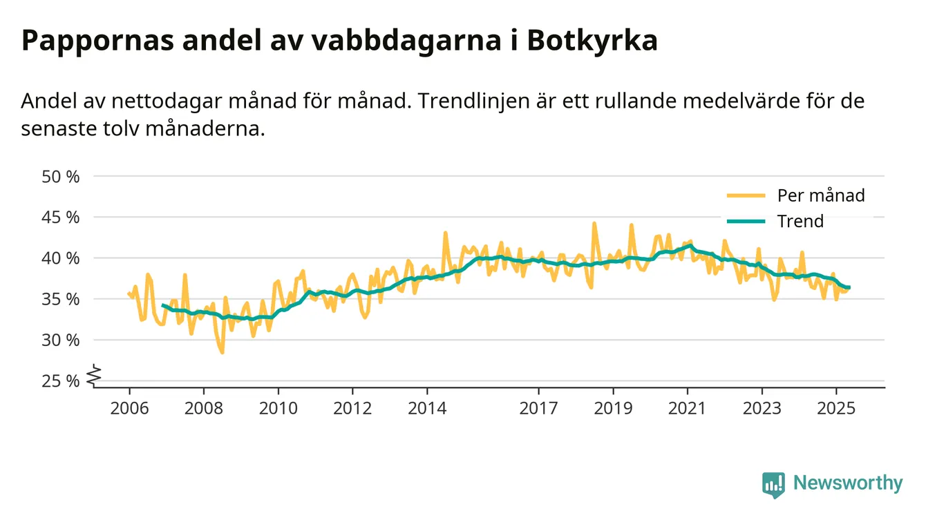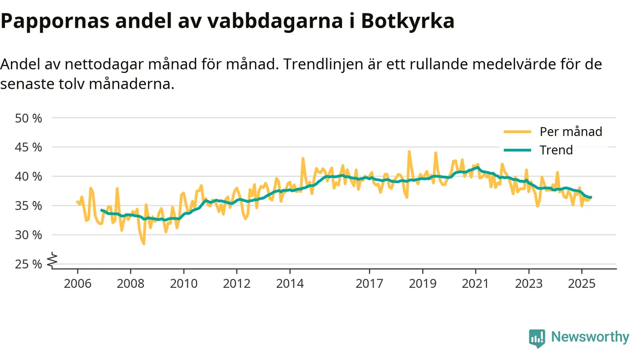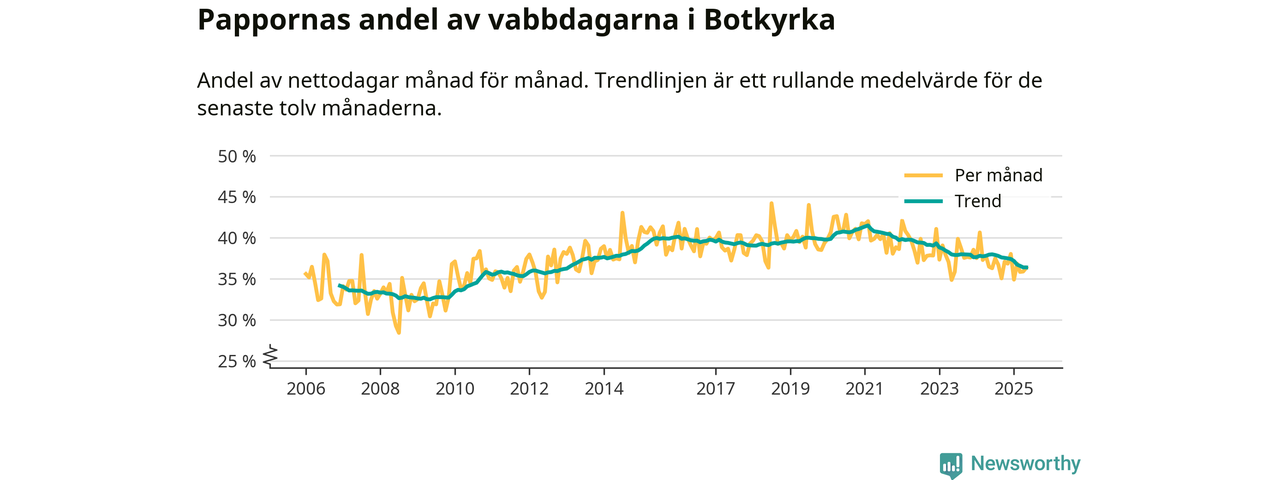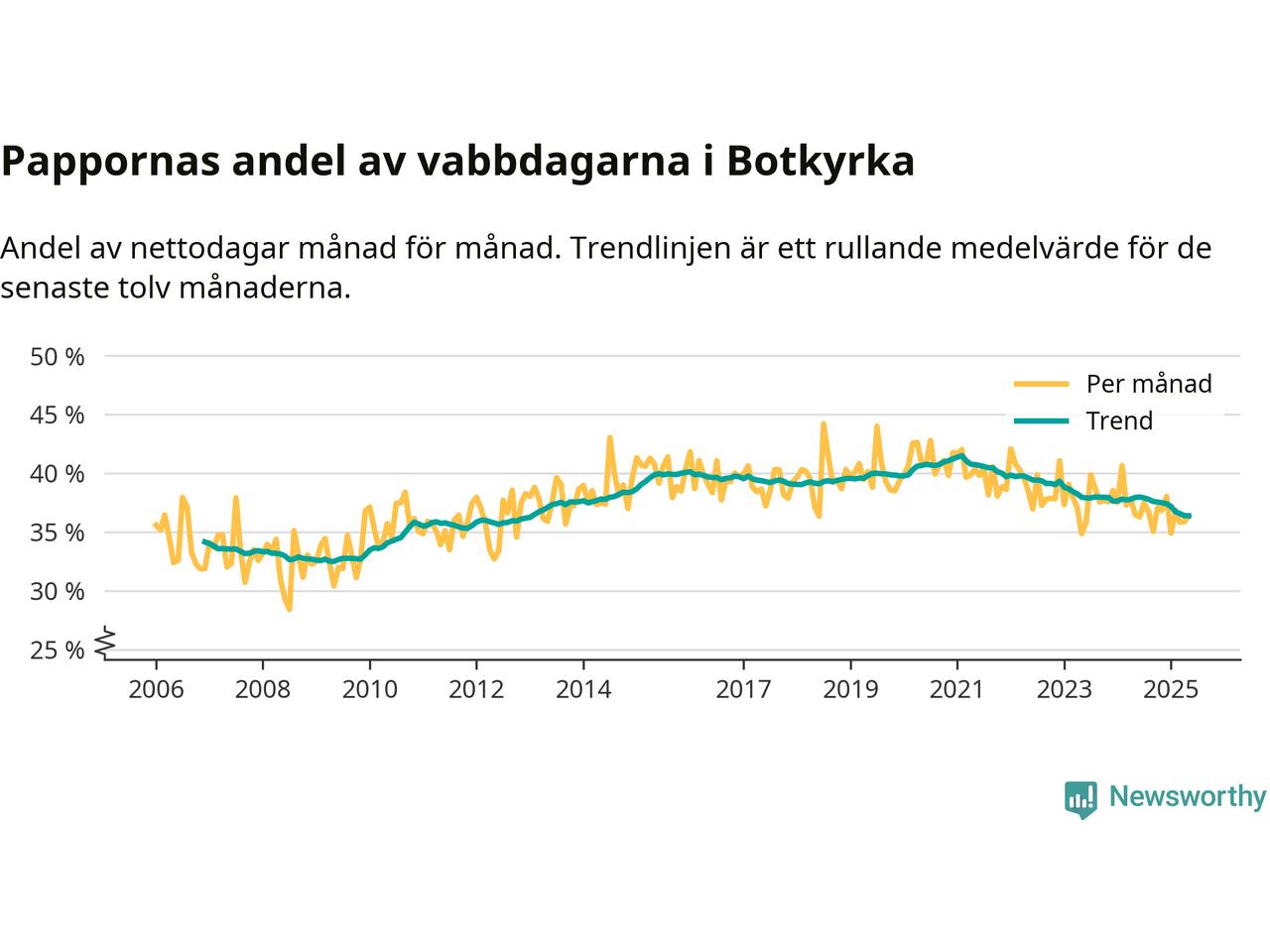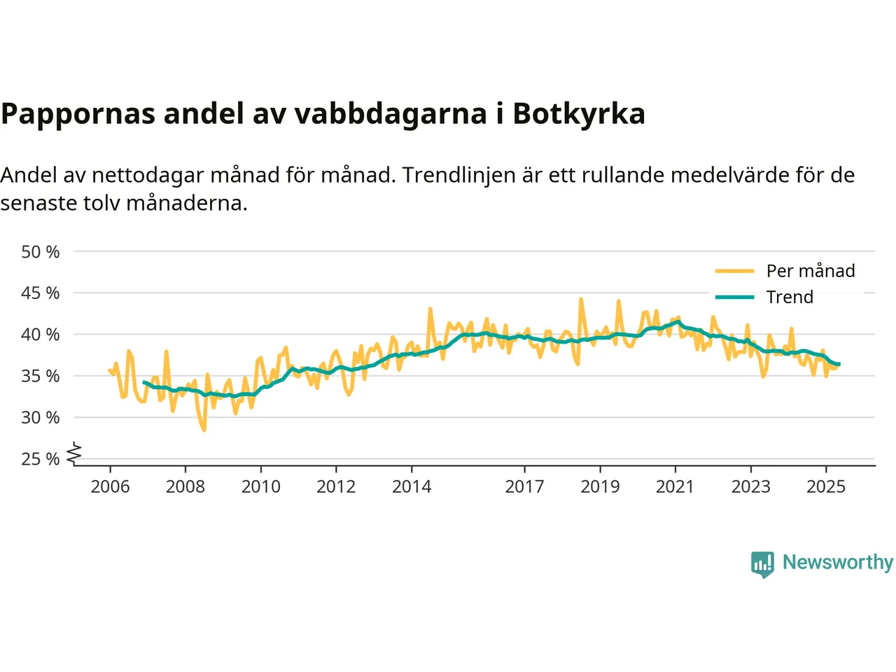 Botkyrka ligger en bit från ett jämställt uttag. Under de senaste tolv månaderna har männen stått för 36 procent av all vabb i kommunen. Det är en lägre andel än på över tolv år.