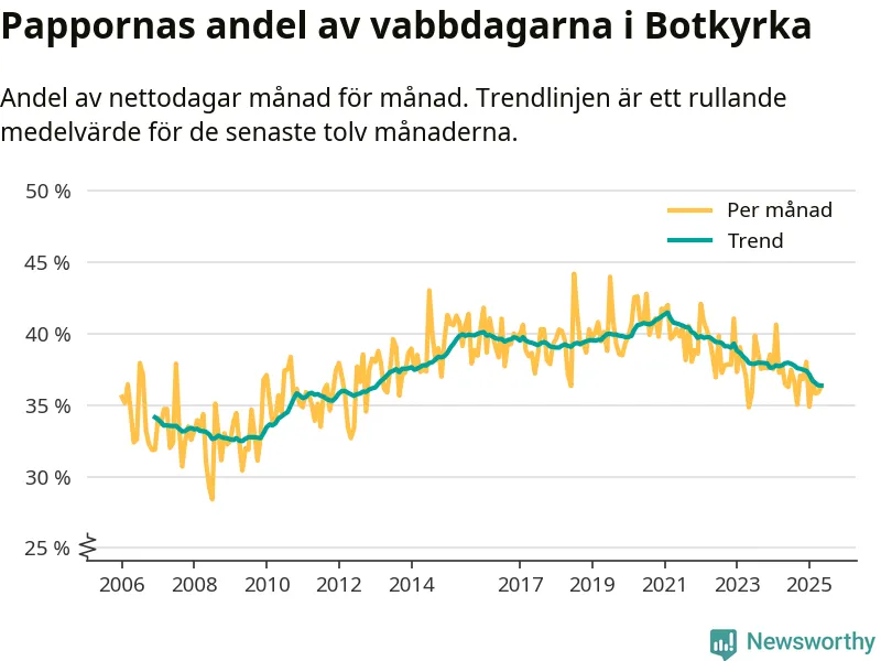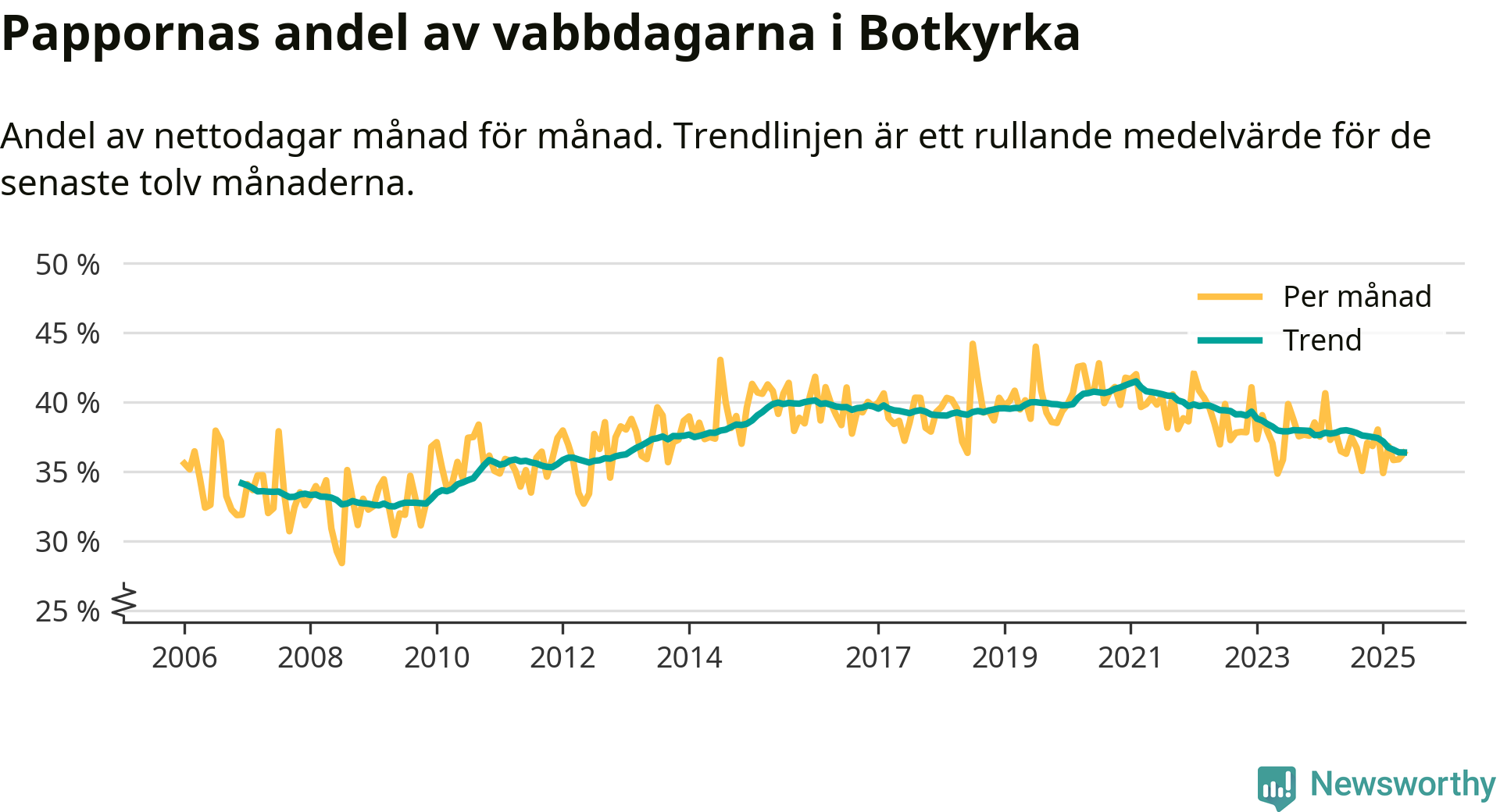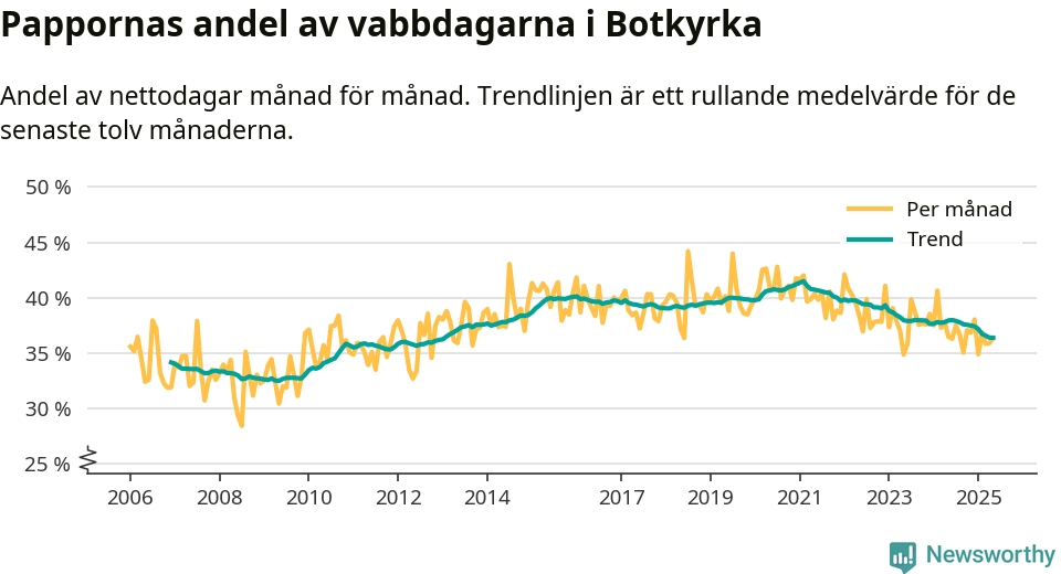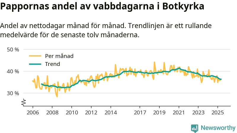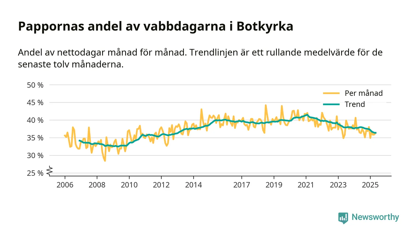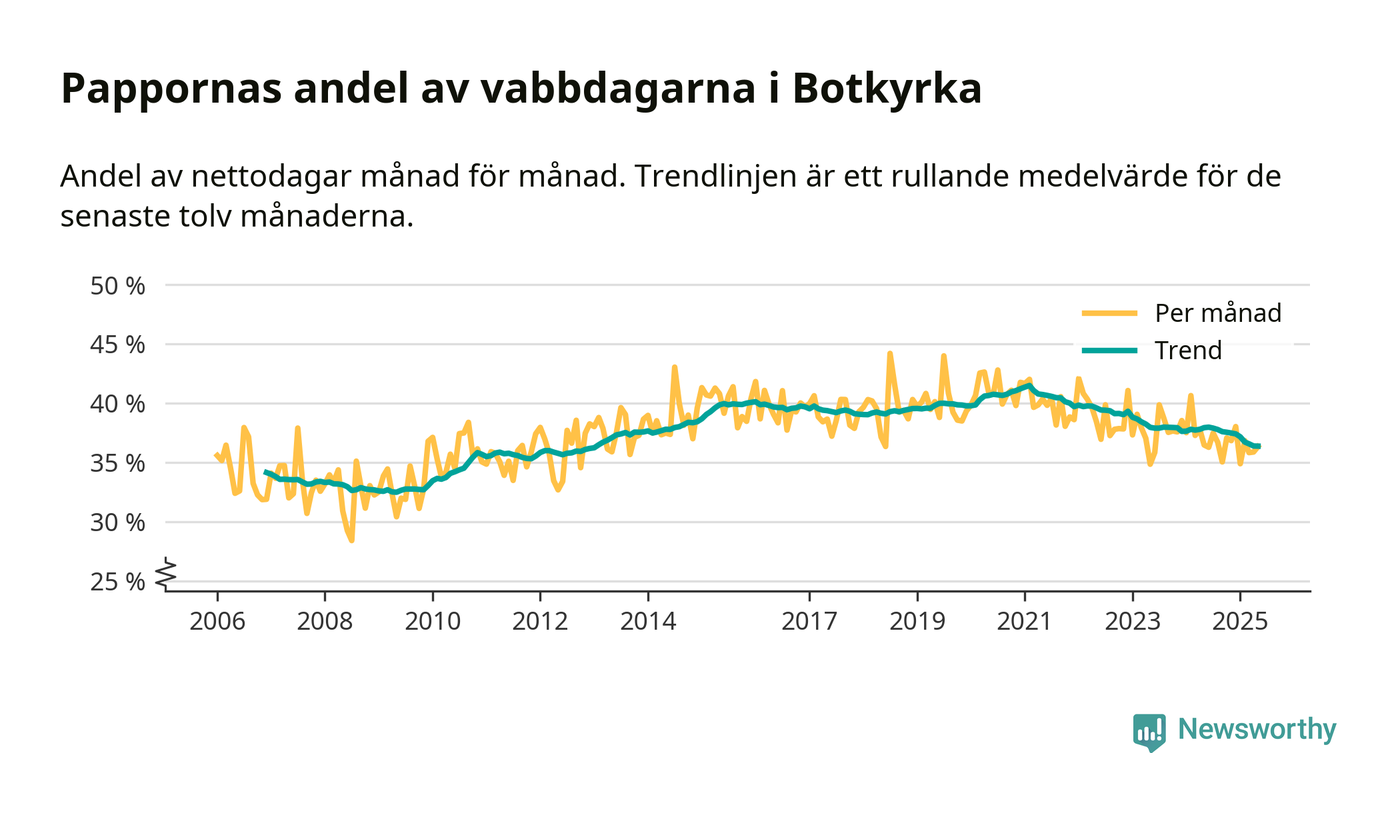 Botkyrka ligger en bit från ett jämställt uttag. Under de senaste tolv månaderna har männen stått för 36 procent av all vabb i kommunen. Det är en lägre andel än på över tolv år.