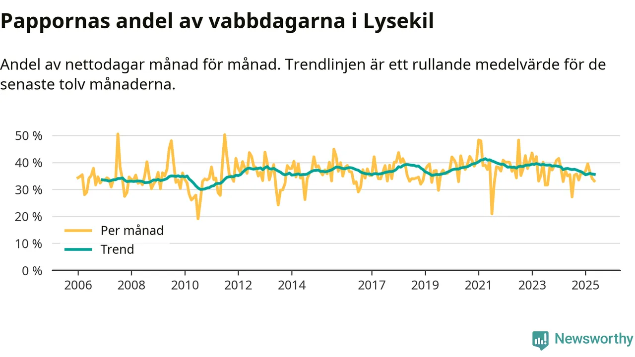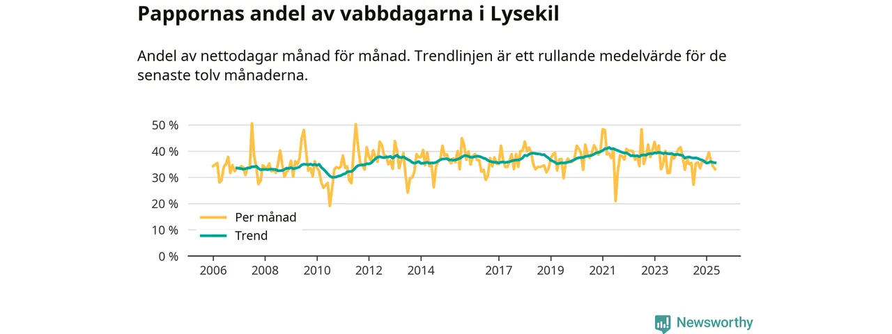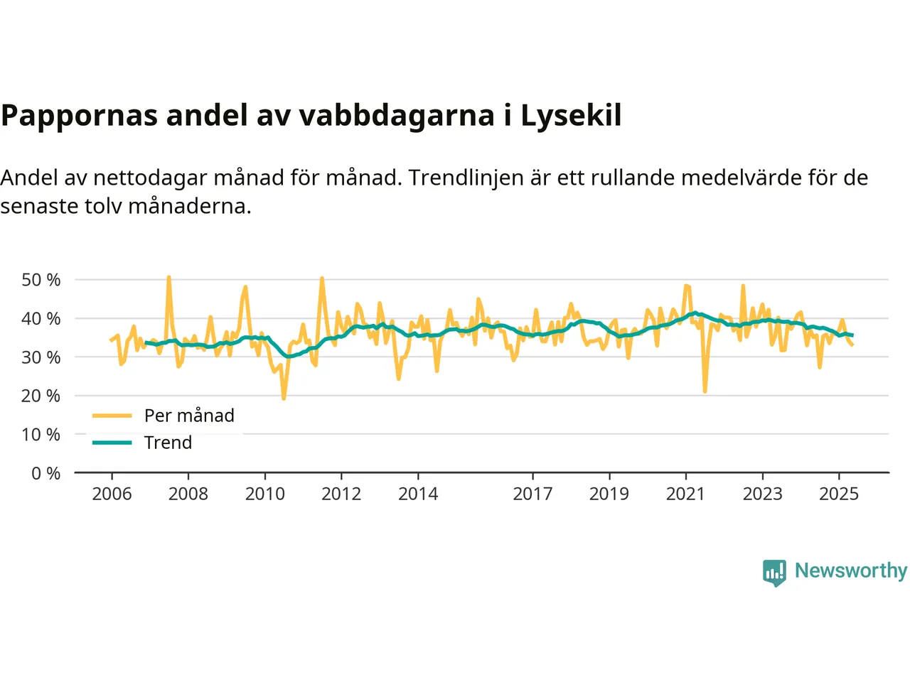 Pappor i Lysekil vabbar mindre än rikssnittet (38 procent), och även mindre än andra män i Västra Götalands län (38 procent). Skillnaderna inom landet är stora. Dorotea är den enda kommun i landet som når 50–50-fördelning.