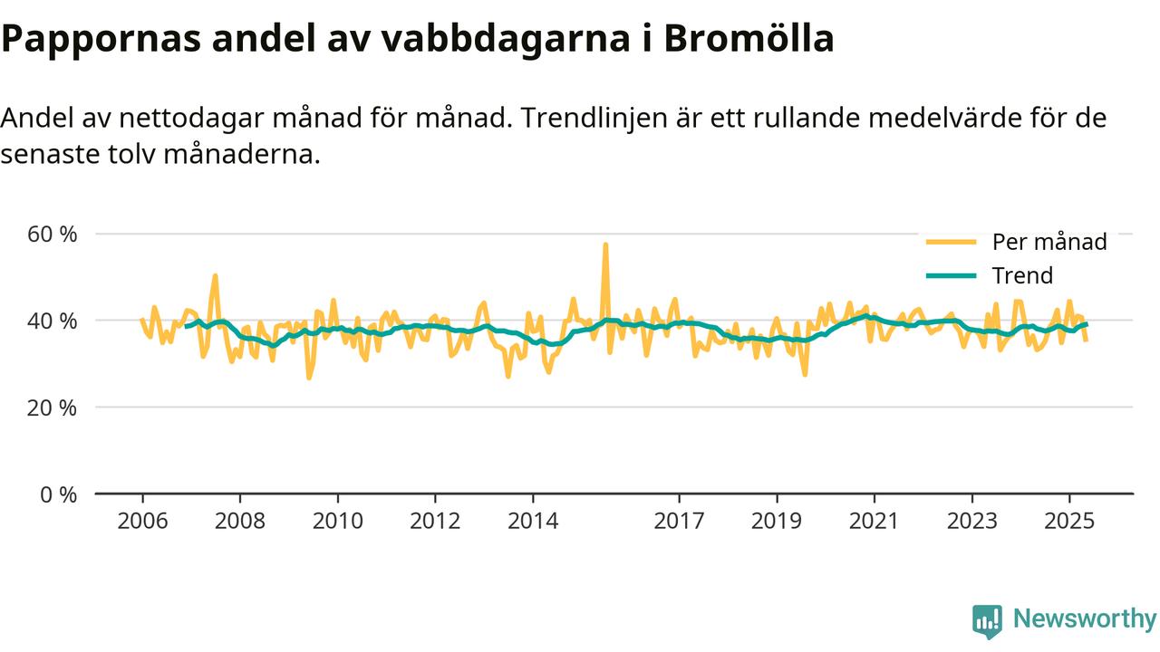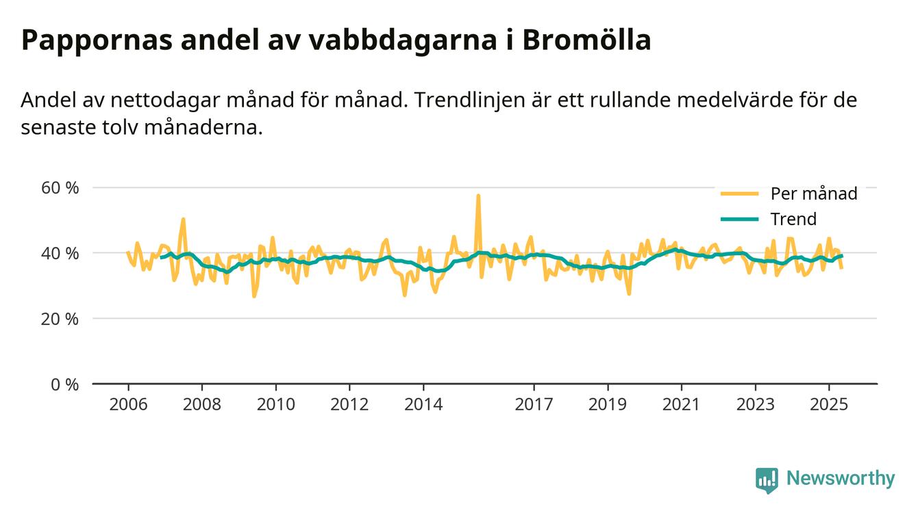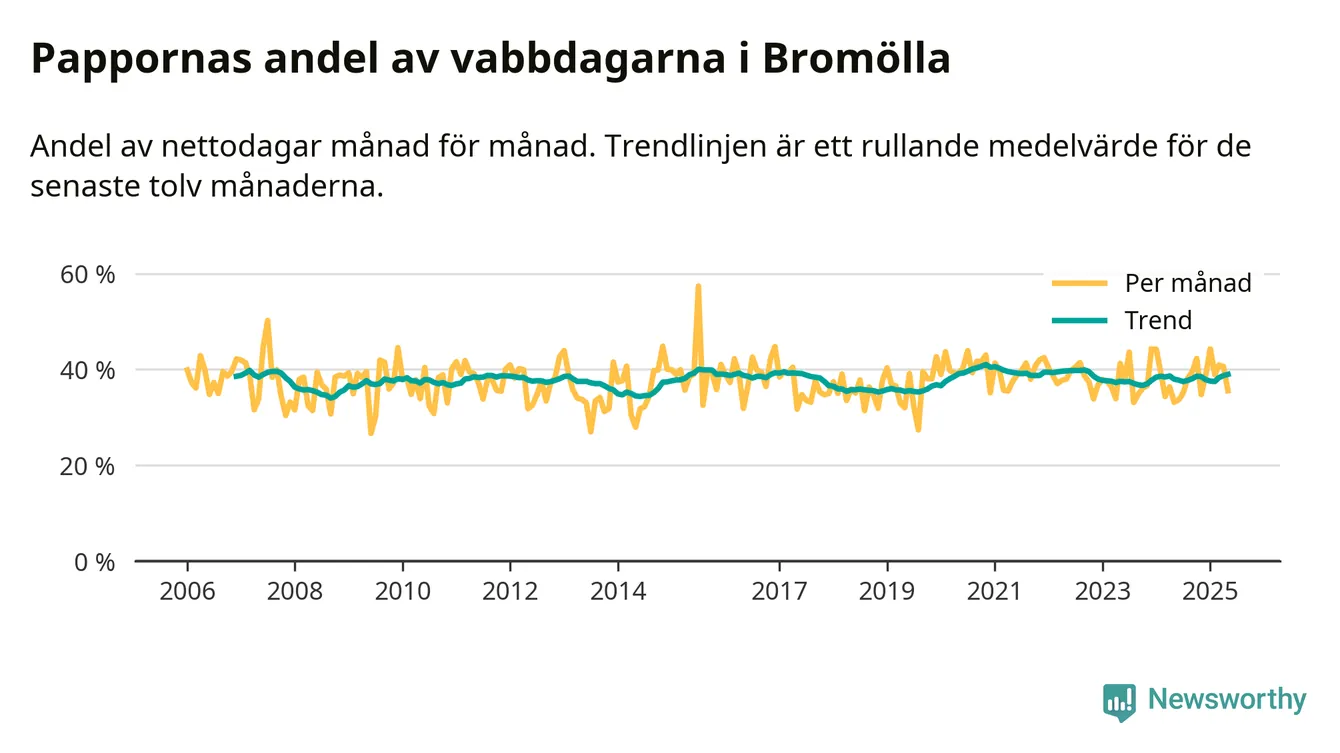 Bromölla ligger en bit från ett jämställt uttag. Under de senaste tolv månaderna har männen stått för 39 procent av all vabb i kommunen. Pappornas uttag peakade hösten 2020 då kommunens fäder var uppe i 41 procent av vabbdagarna 1.