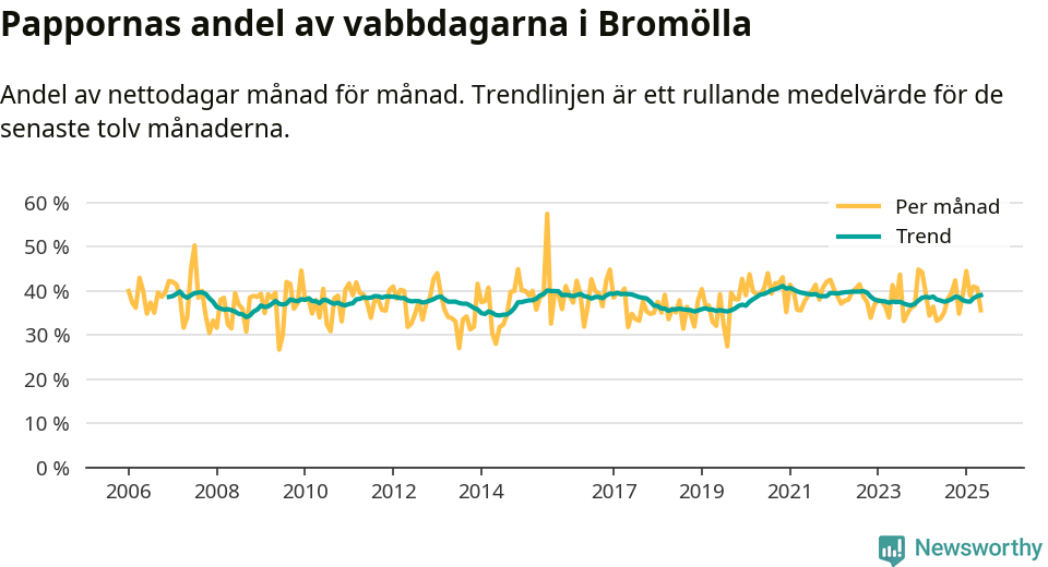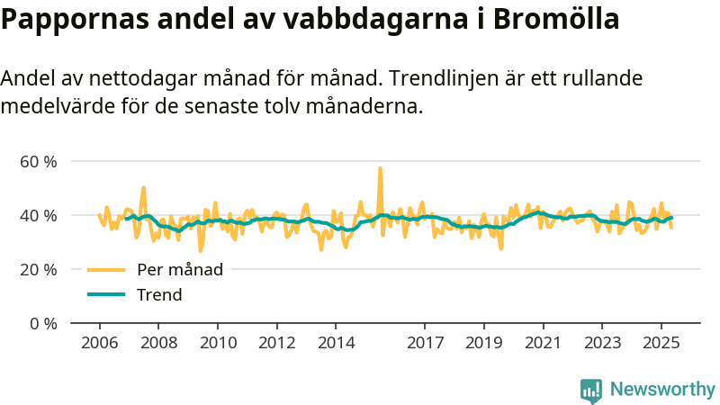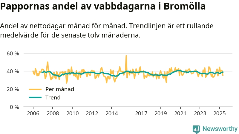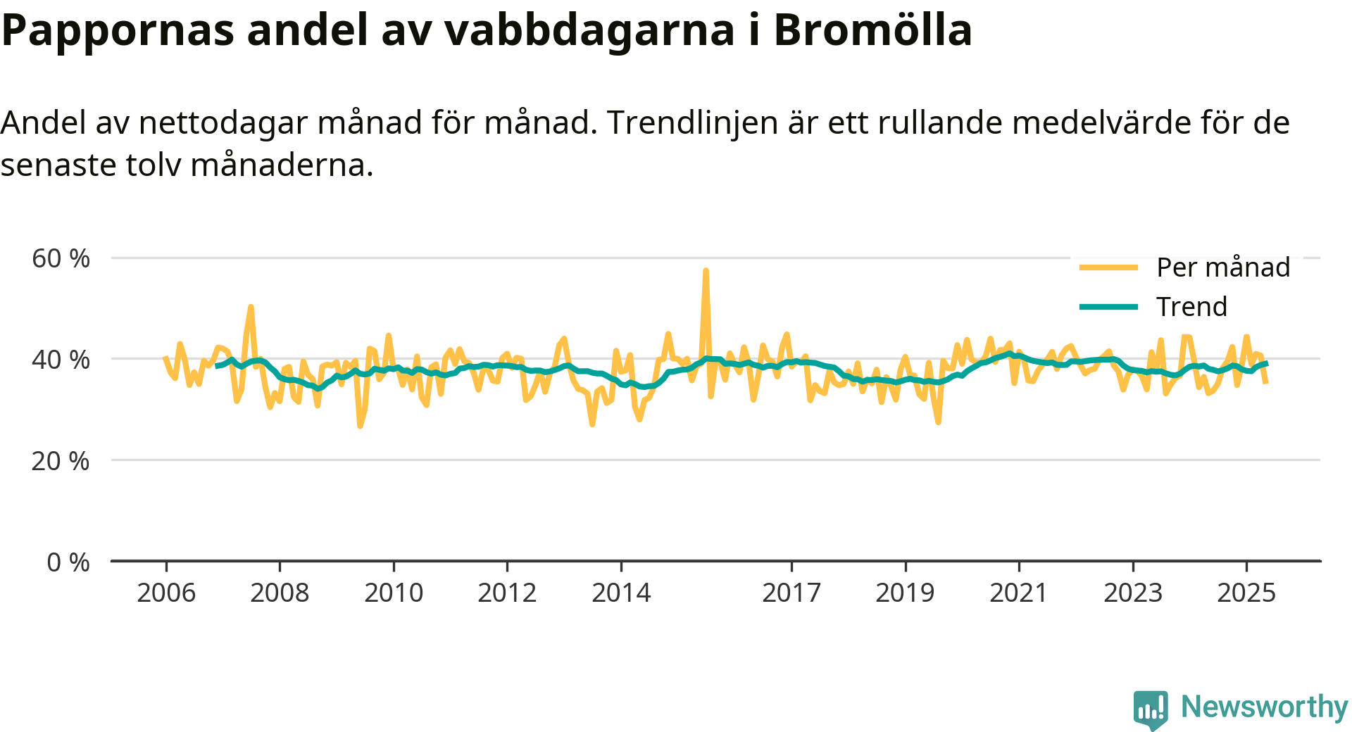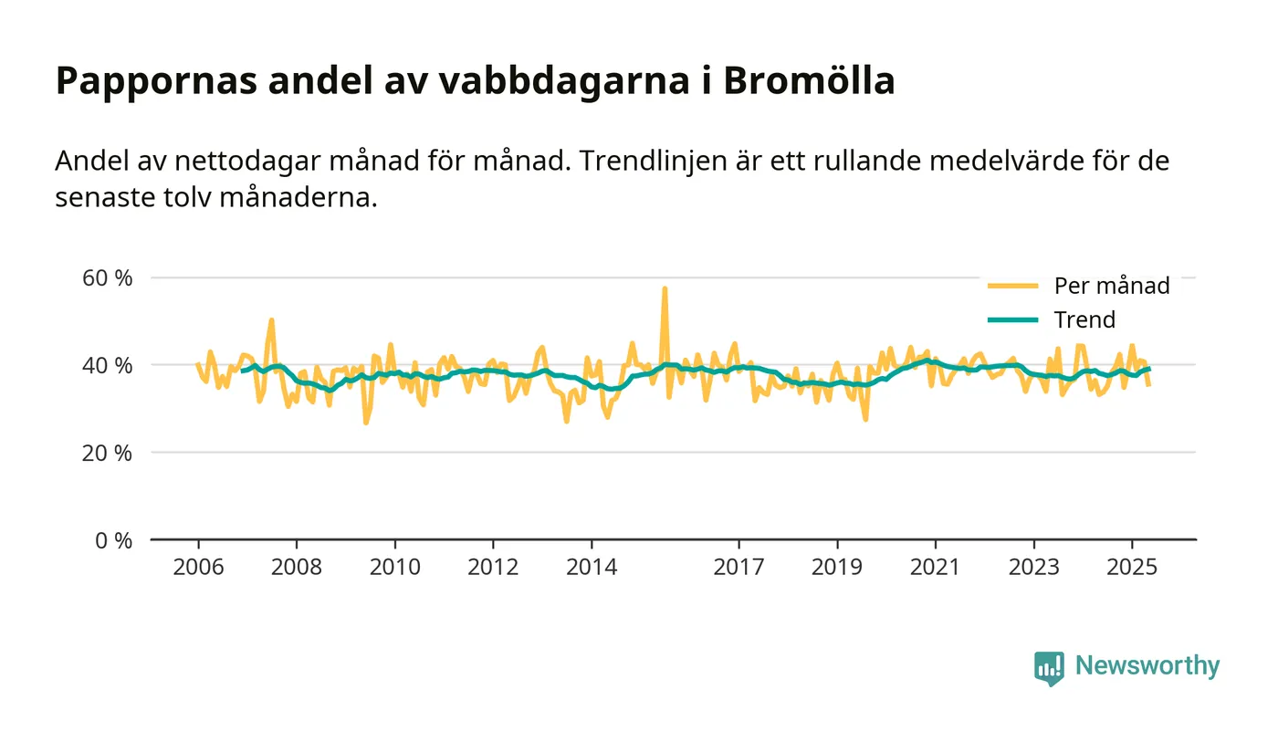 Bromölla ligger en bit från ett jämställt uttag. Under de senaste tolv månaderna har männen stått för 39 procent av all vabb i kommunen. Pappornas uttag peakade hösten 2020 då kommunens fäder var uppe i 41 procent av vabbdagarna 1.