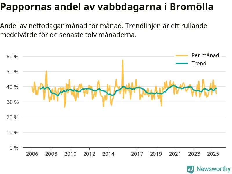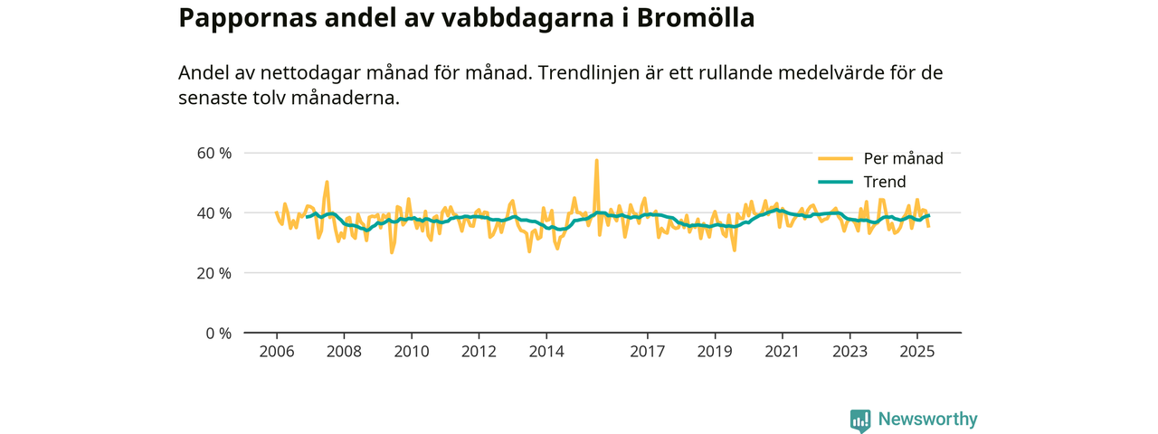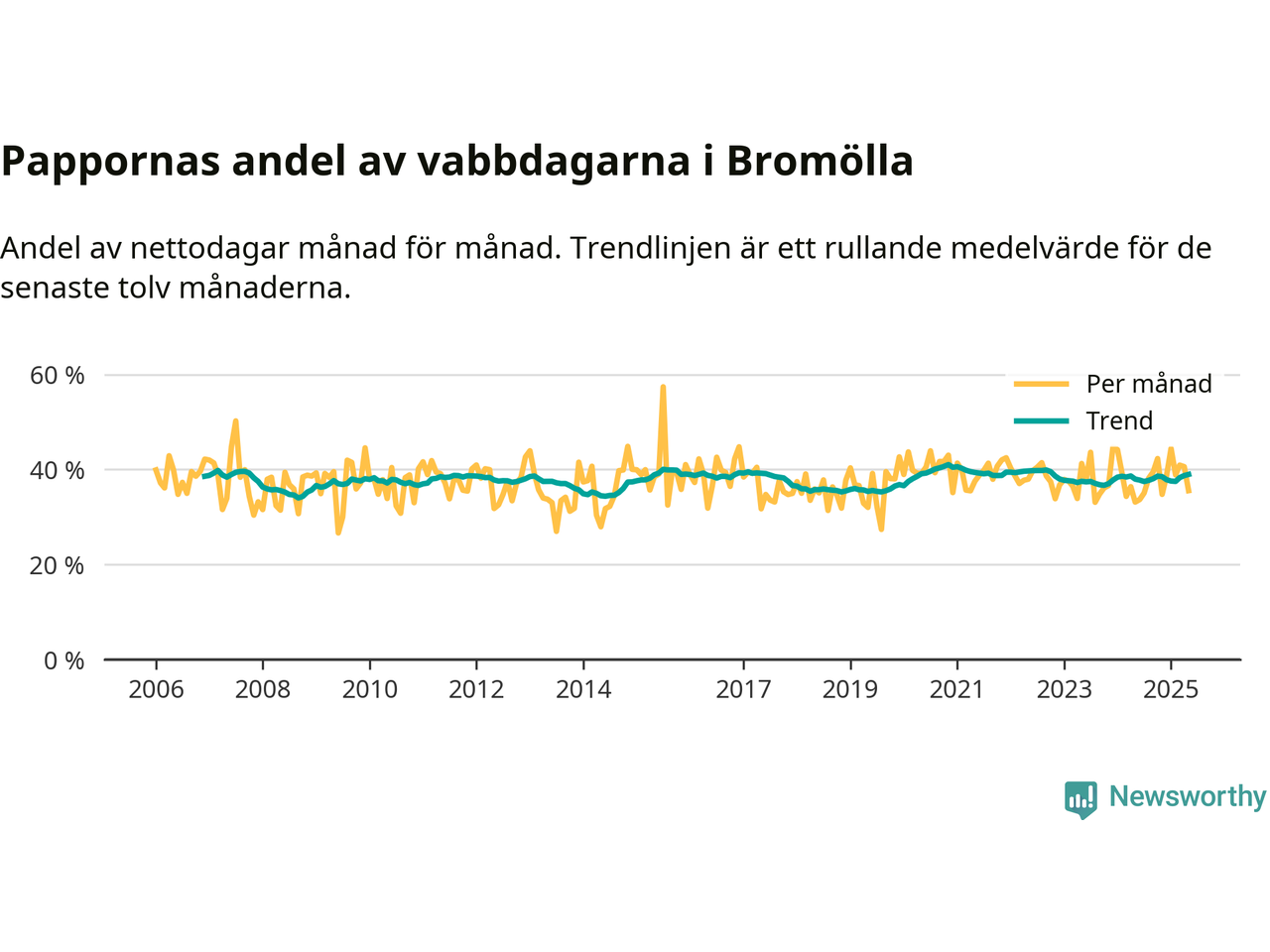Pappor i Bromölla vabbar ungefär som rikssnittet, men mer än andra män i Skåne län (36 procent). Skillnaderna inom landet är stora. Dorotea är den enda kommun i landet som når 50–50-fördelning.